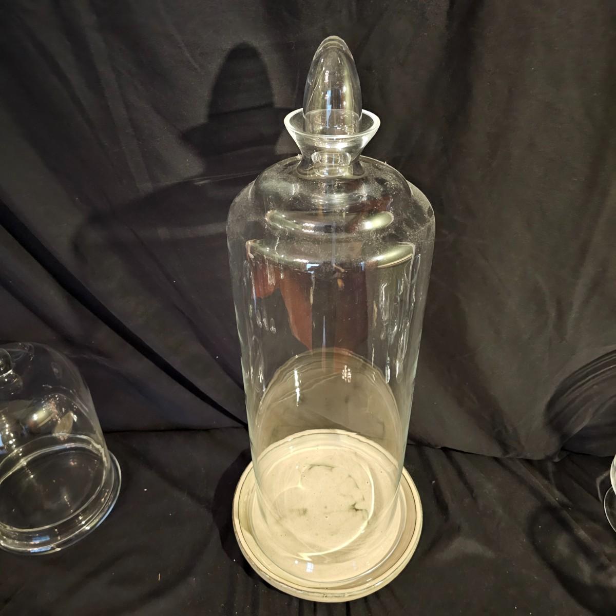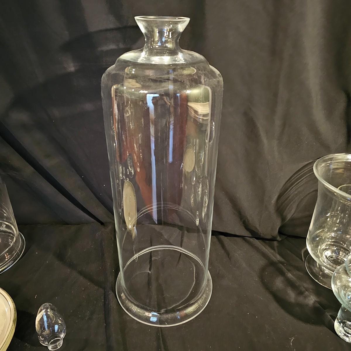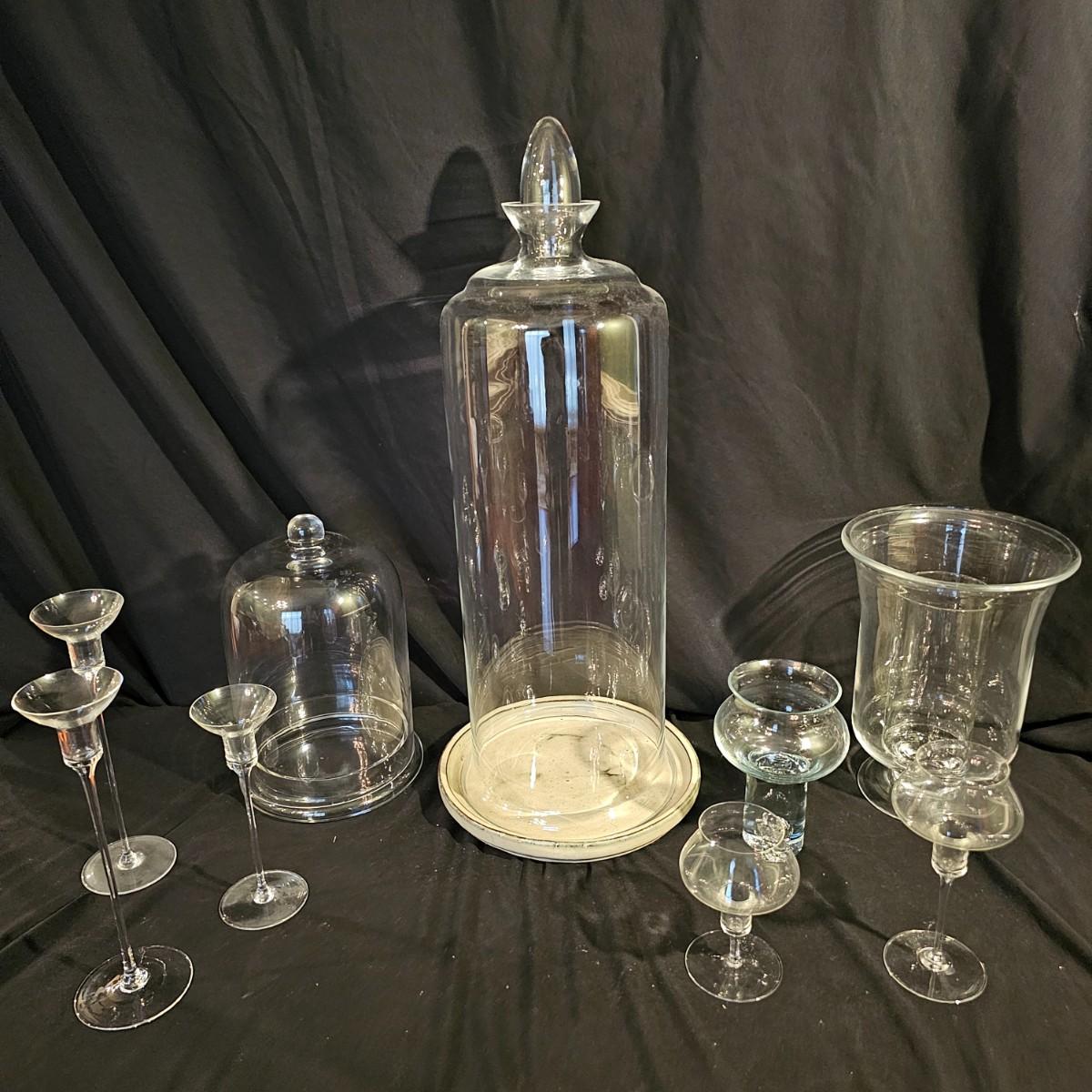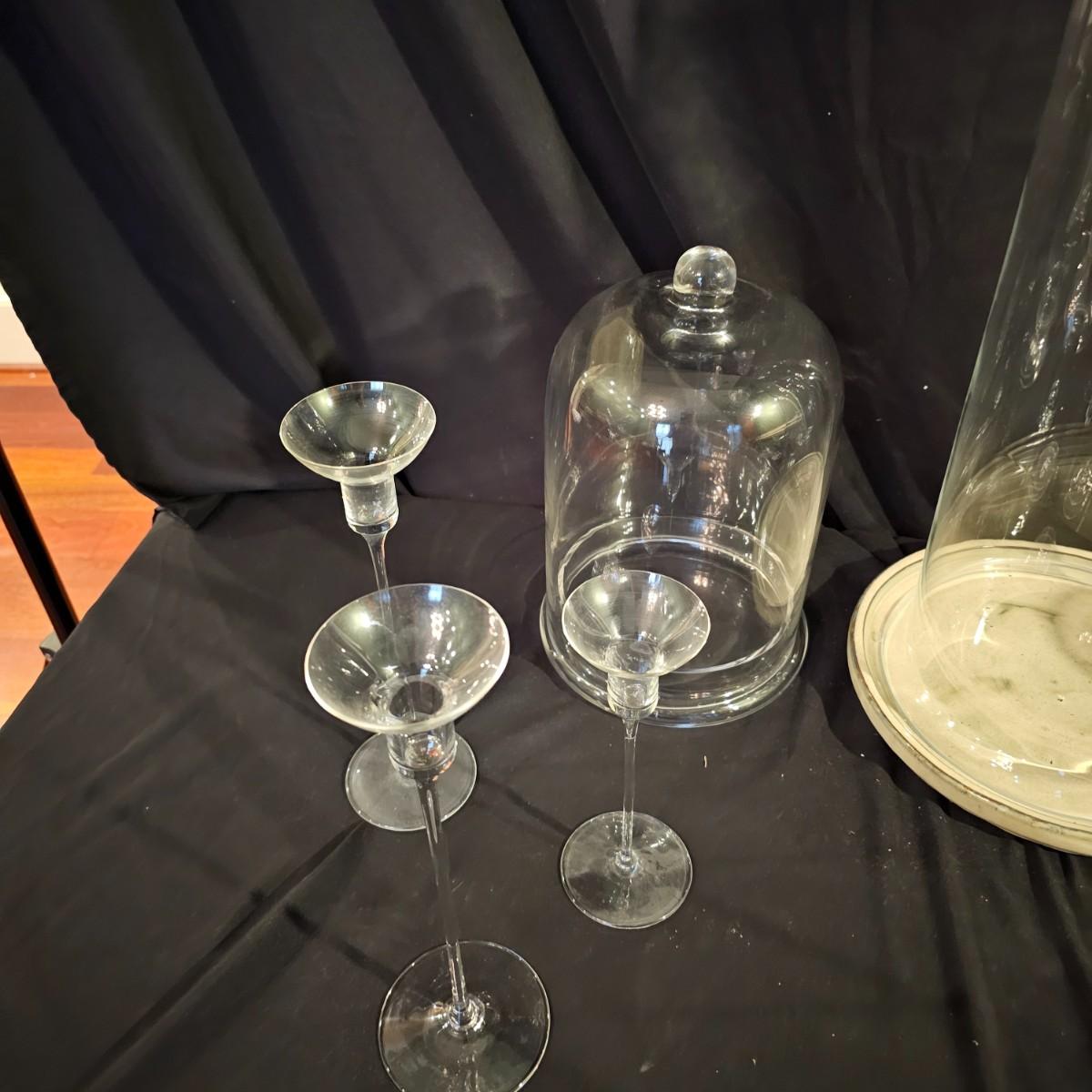 Several unique shaped pieces of clear glassware. Tallest cloche sits on a 11.5"D ceramic plate, cylinder is 9.75" D x 27" H. Bell jar with base is 8.25" D x 13" x H. Slender candleholders are 3.75" D x 11.5"H, have mark on bottom of stem. Open top jar is 8.5" D x 12"H, has center cylinder. See photos for details. Local pickup only.