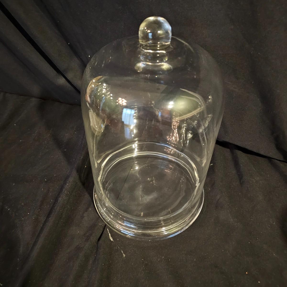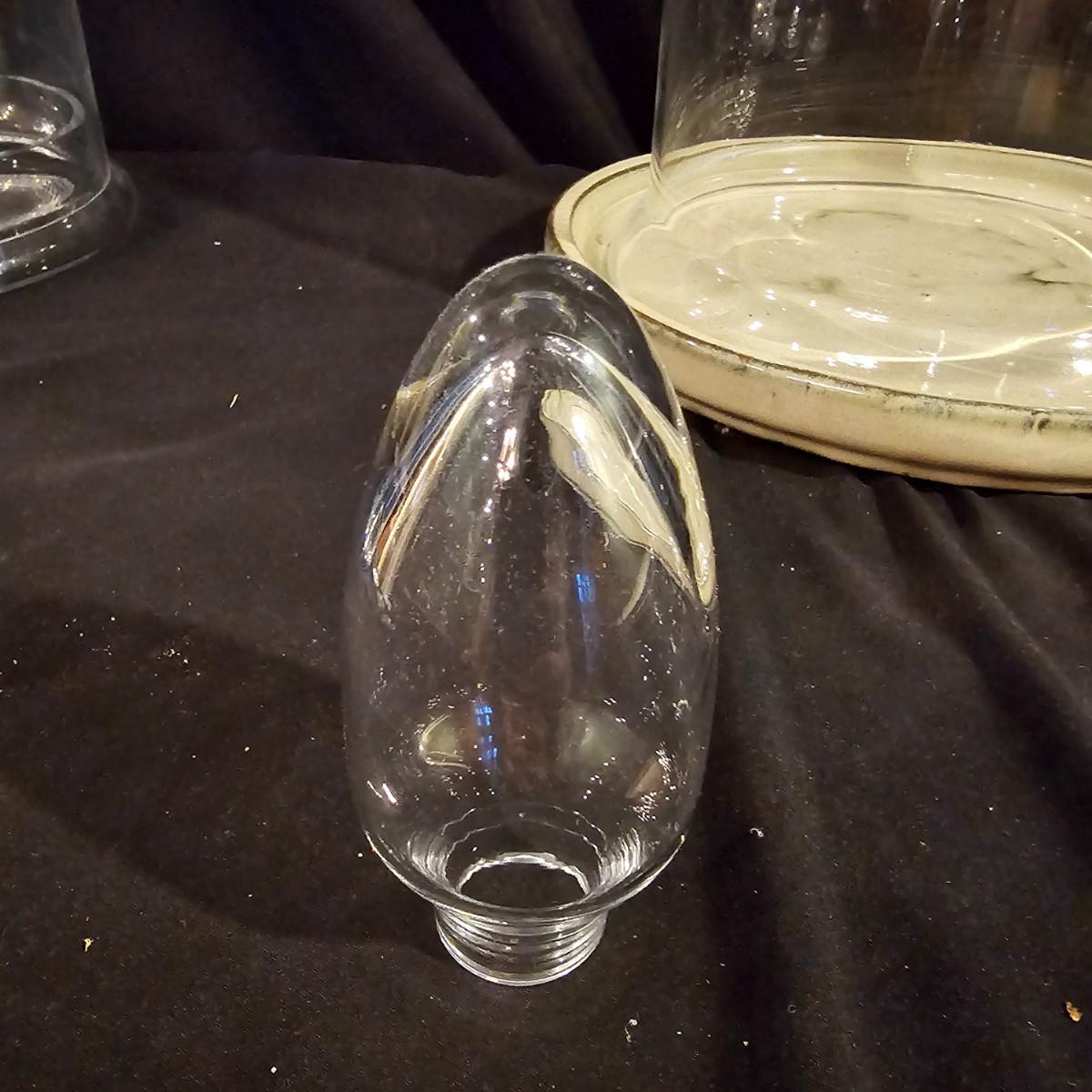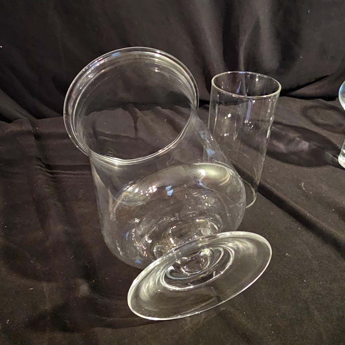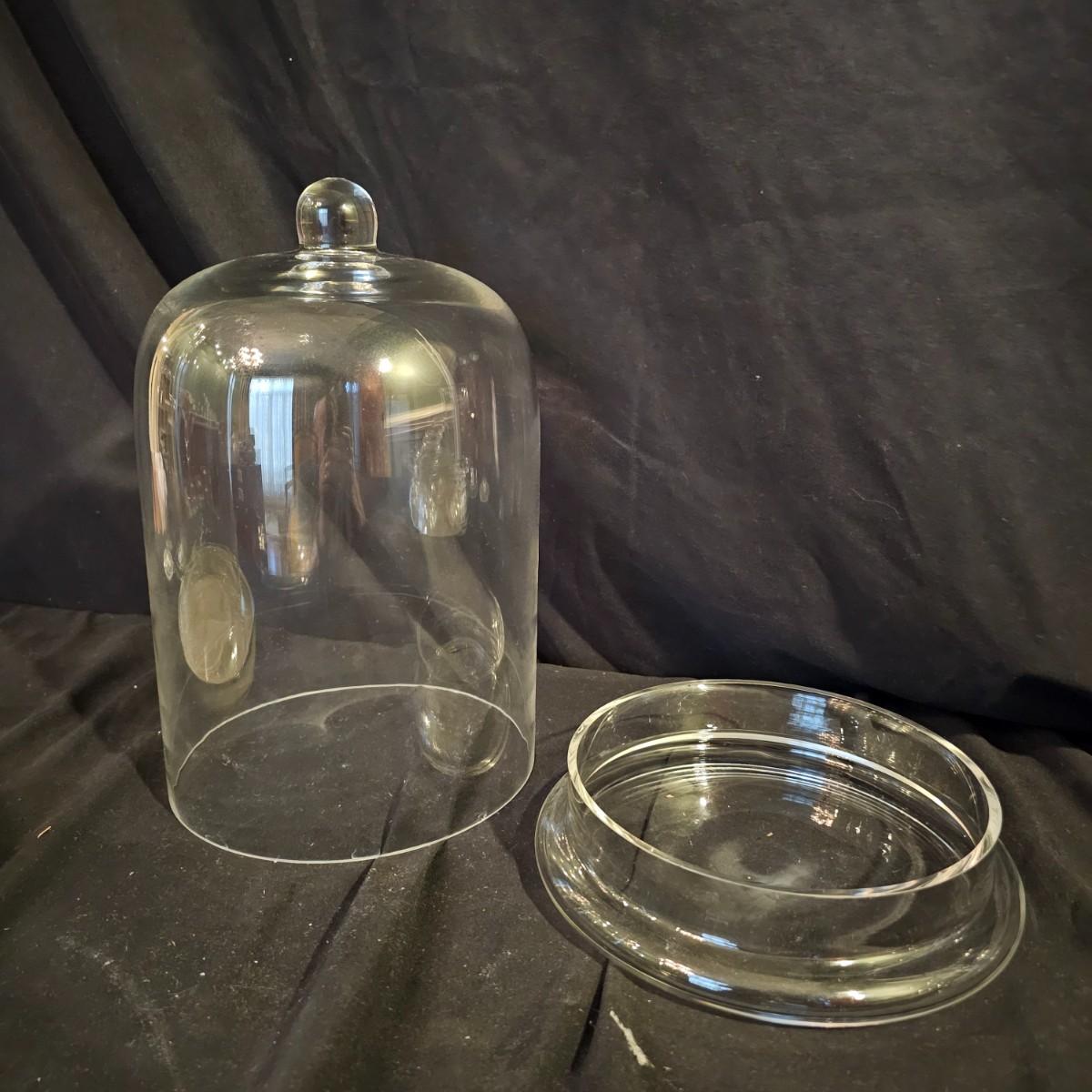 Several unique shaped pieces of clear glassware. Tallest cloche sits on a 11.5"D ceramic plate, cylinder is 9.75" D x 27" H. Bell jar with base is 8.25" D x 13" x H. Slender candleholders are 3.75" D x 11.5"H, have mark on bottom of stem. Open top jar is 8.5" D x 12"H, has center cylinder. See photos for details. Local pickup only.