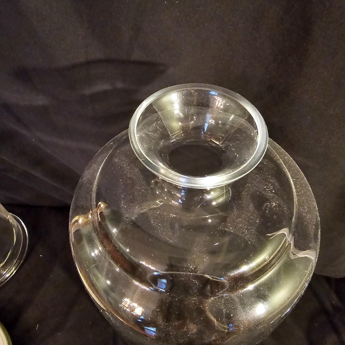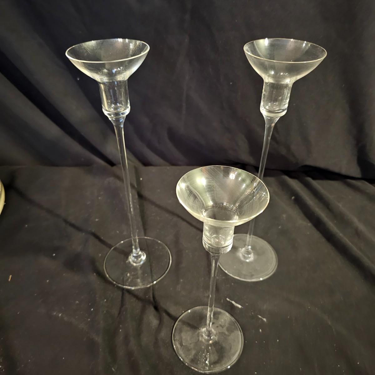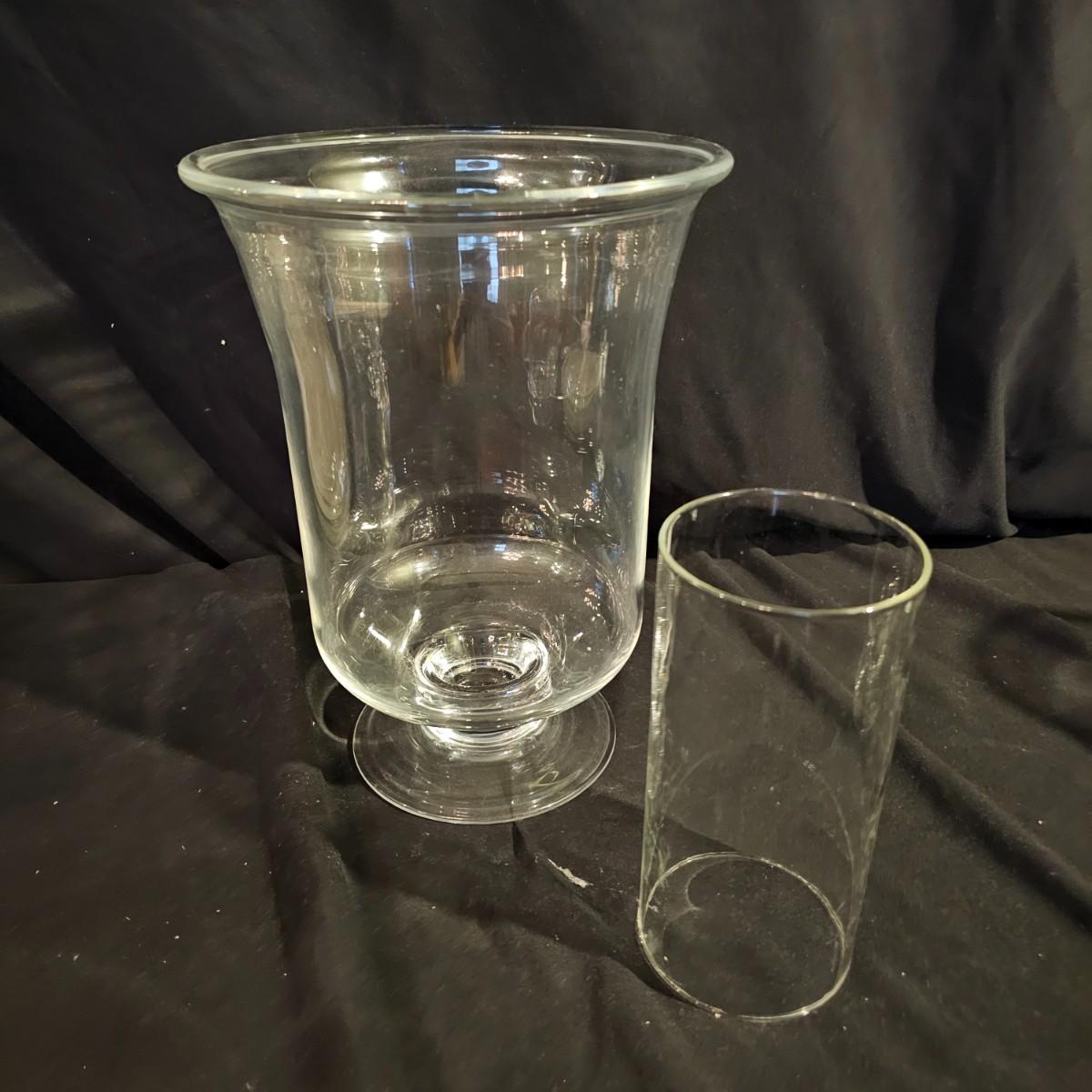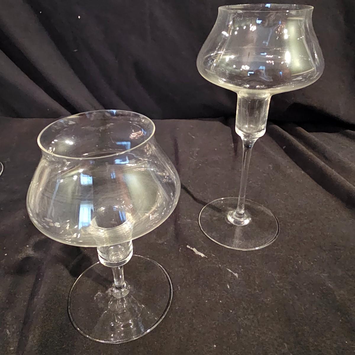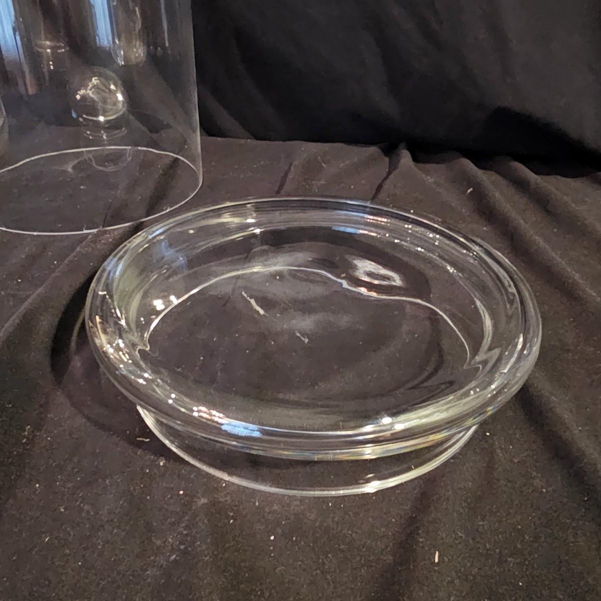Several unique shaped pieces of clear glassware. Tallest cloche sits on a 11.5"D ceramic plate, cylinder is 9.75" D x 27" H. Bell jar with base is 8.25" D x 13" x H. Slender candleholders are 3.75" D x 11.5"H, have mark on bottom of stem. Open top jar is 8.5" D x 12"H, has center cylinder. See photos for details. Local pickup only.
