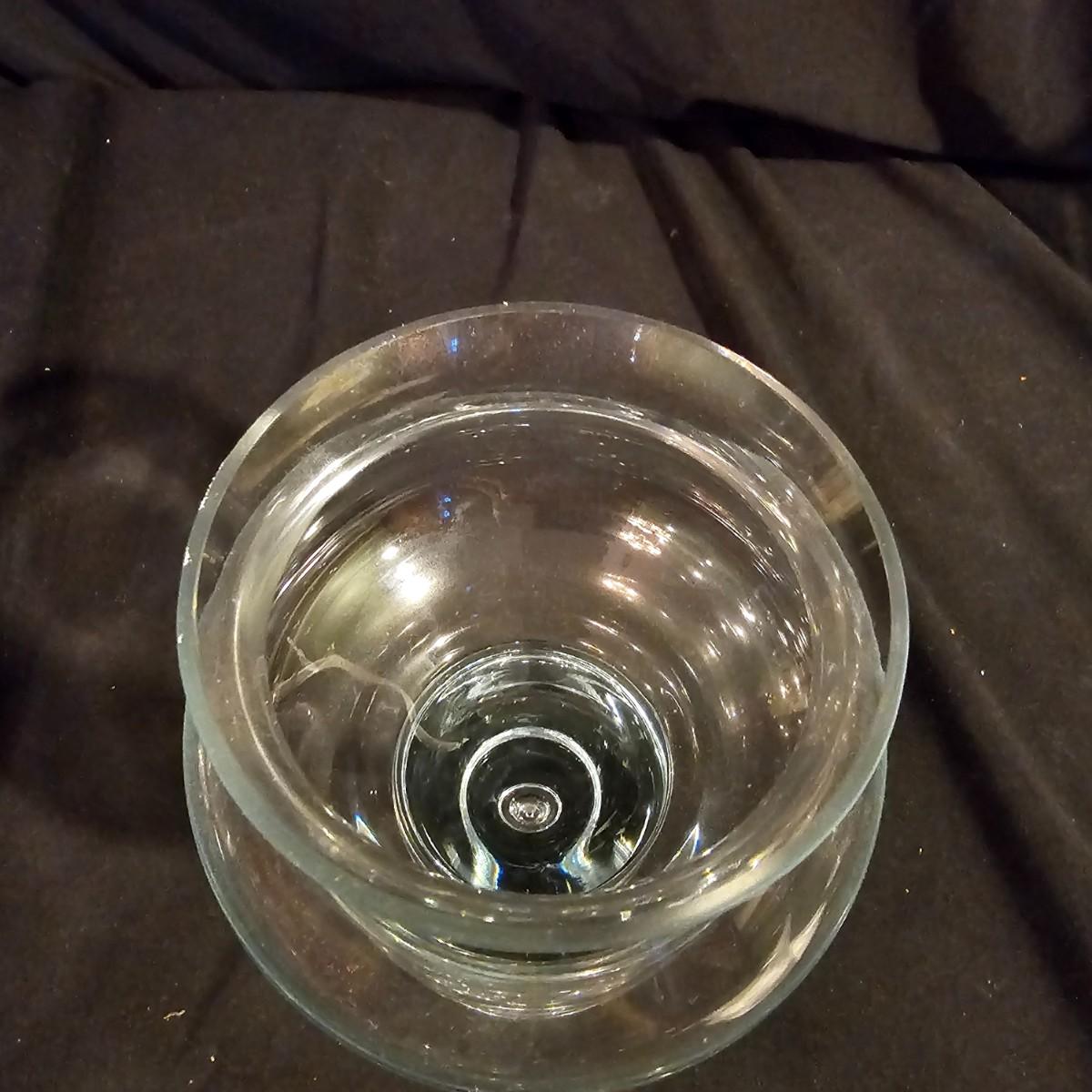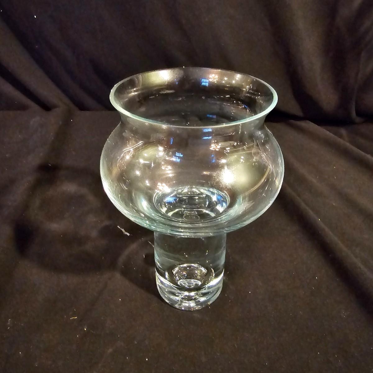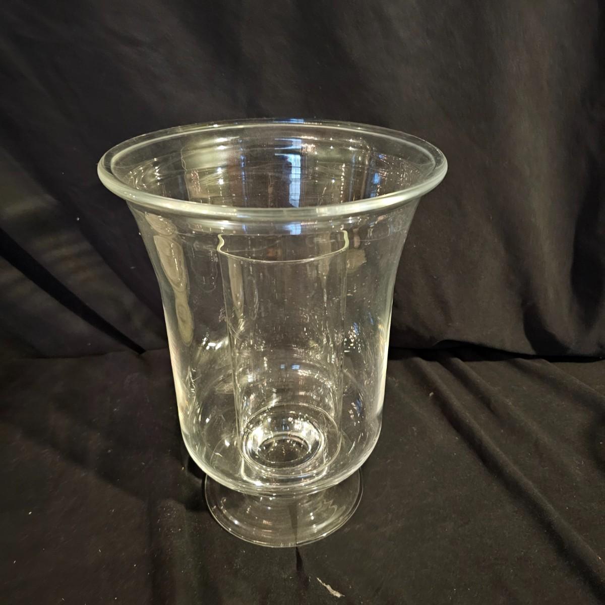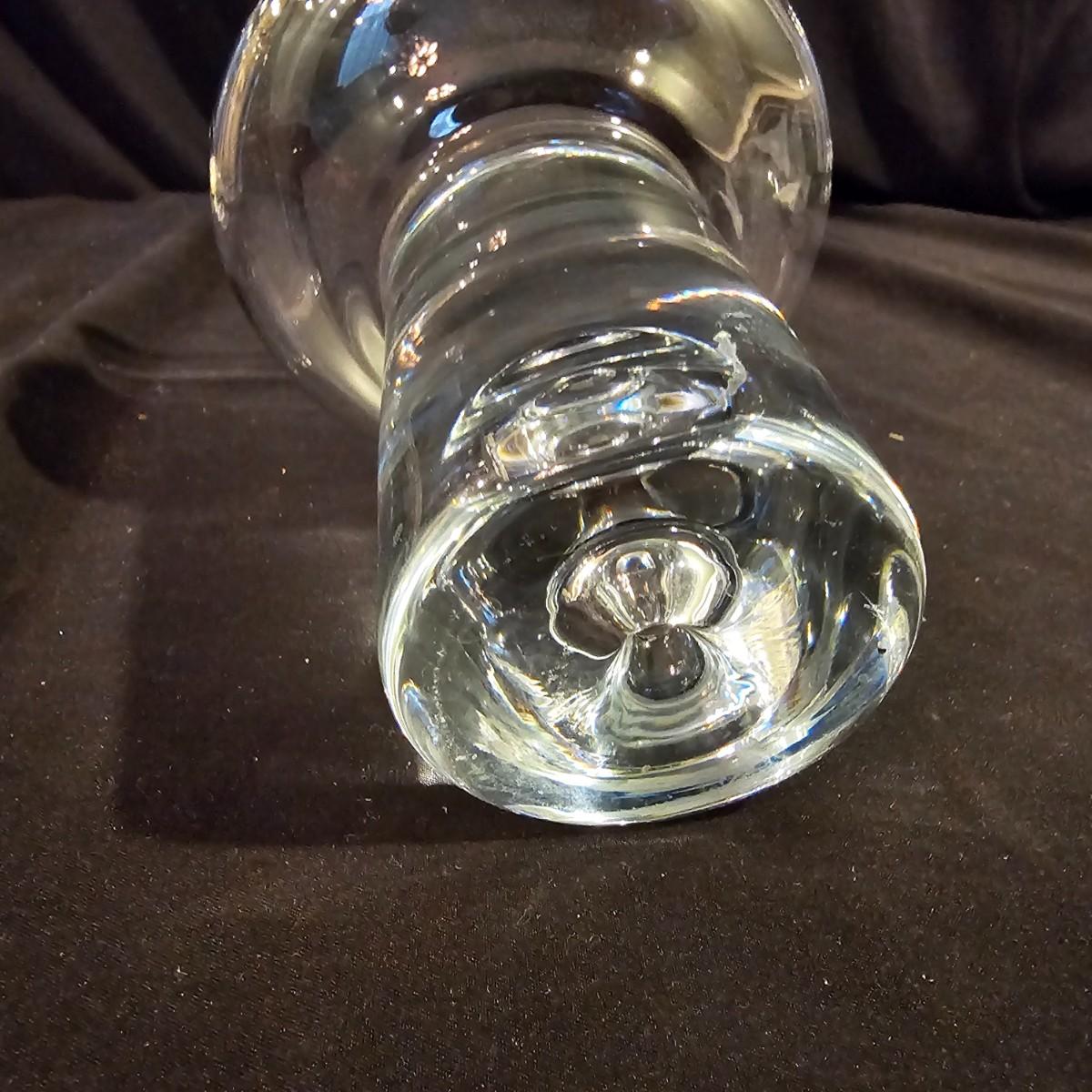 Several unique shaped pieces of clear glassware. Tallest cloche sits on a 11.5"D ceramic plate, cylinder is 9.75" D x 27" H. Bell jar with base is 8.25" D x 13" x H. Slender candleholders are 3.75" D x 11.5"H, have mark on bottom of stem. Open top jar is 8.5" D x 12"H, has center cylinder. See photos for details. Local pickup only.