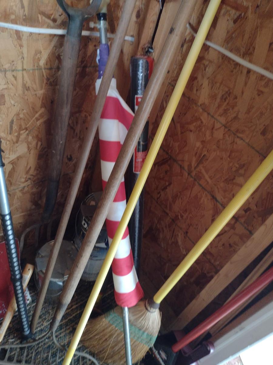 Assorted Hand Tools and Outdoor Items. Gardening tools, American flag. Pails of paint not included.