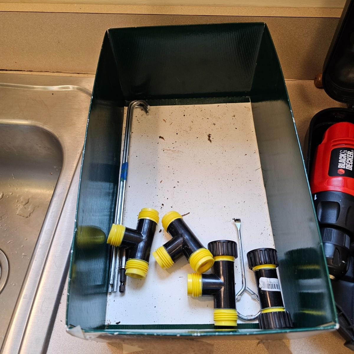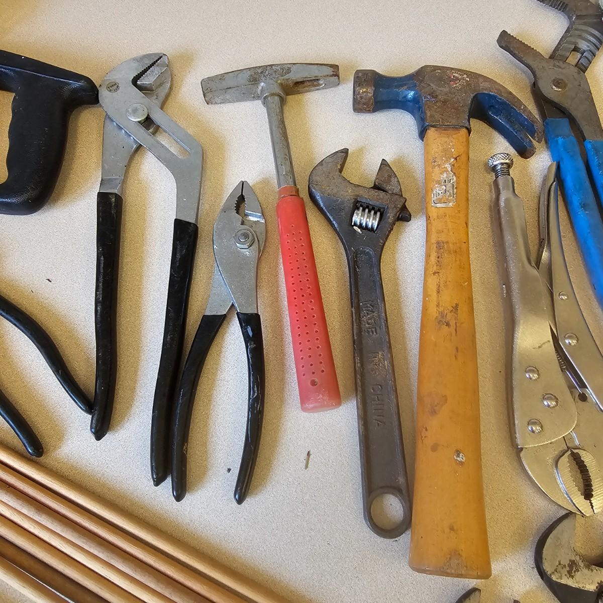 Screwdrivers, wrenches, channel locks, pliers and more. 8" and 12" channel locks, 24" Stanley hand saw. Various bungie cords, hammers, pliers. Selection of dowels, 24" to 48". Black & Decker 9.6V cordless drill with case, battery and charger. Drill tested working. See photos for details. Local pickup only.