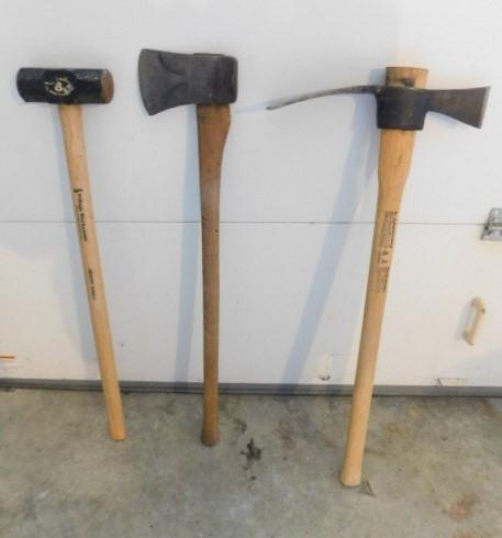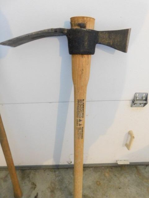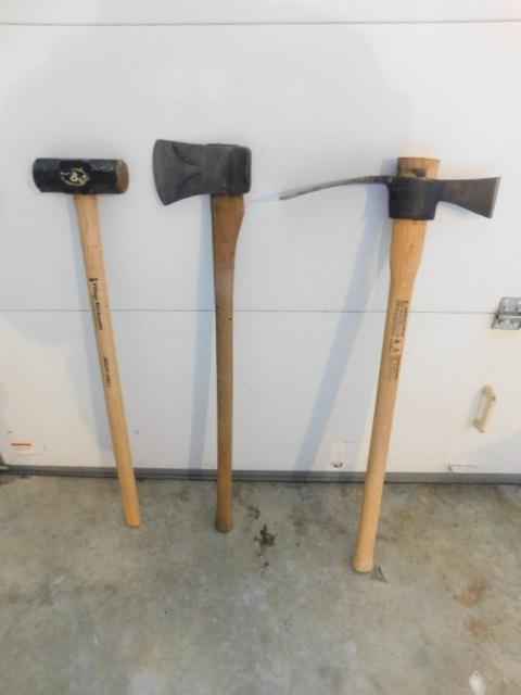 Assorted Hand Tools Includes 8lb Sledge Hammer, Kleen Kutter Ax, and Pick Ax