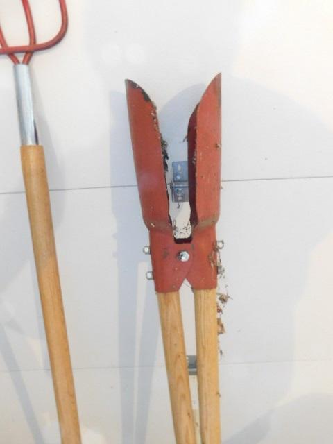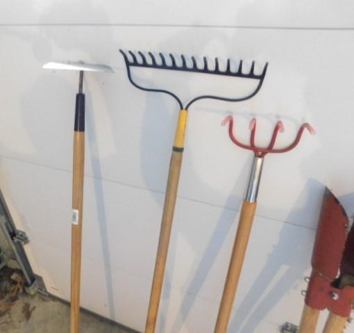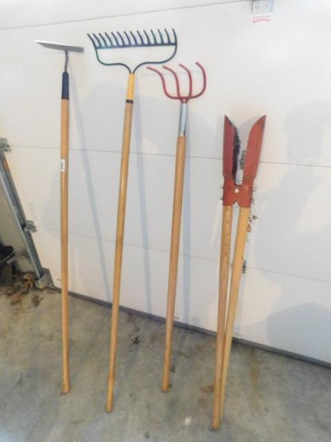 Assorted Hand Tools Includes Post Hole Digger, Rakes, and Hoe