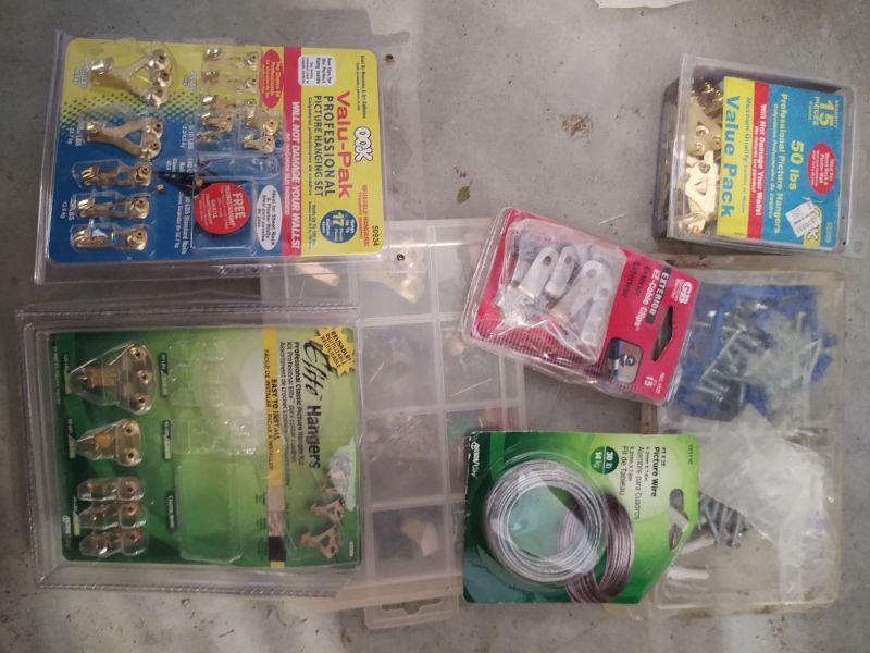 lot 16 - Assorted hardware, Picture hanging, cable clips screws, etc.