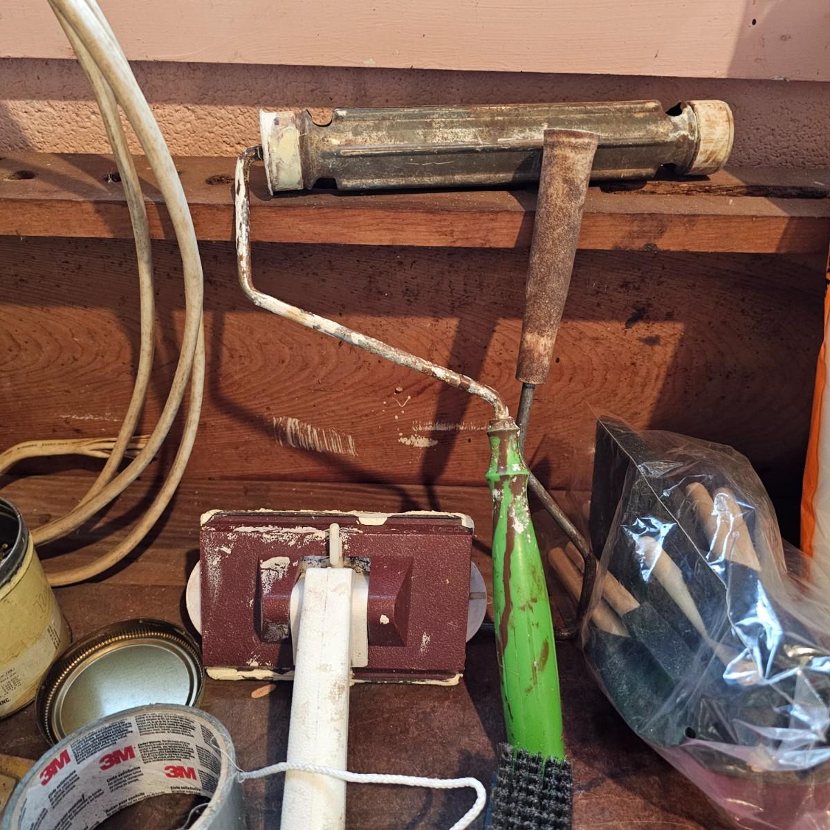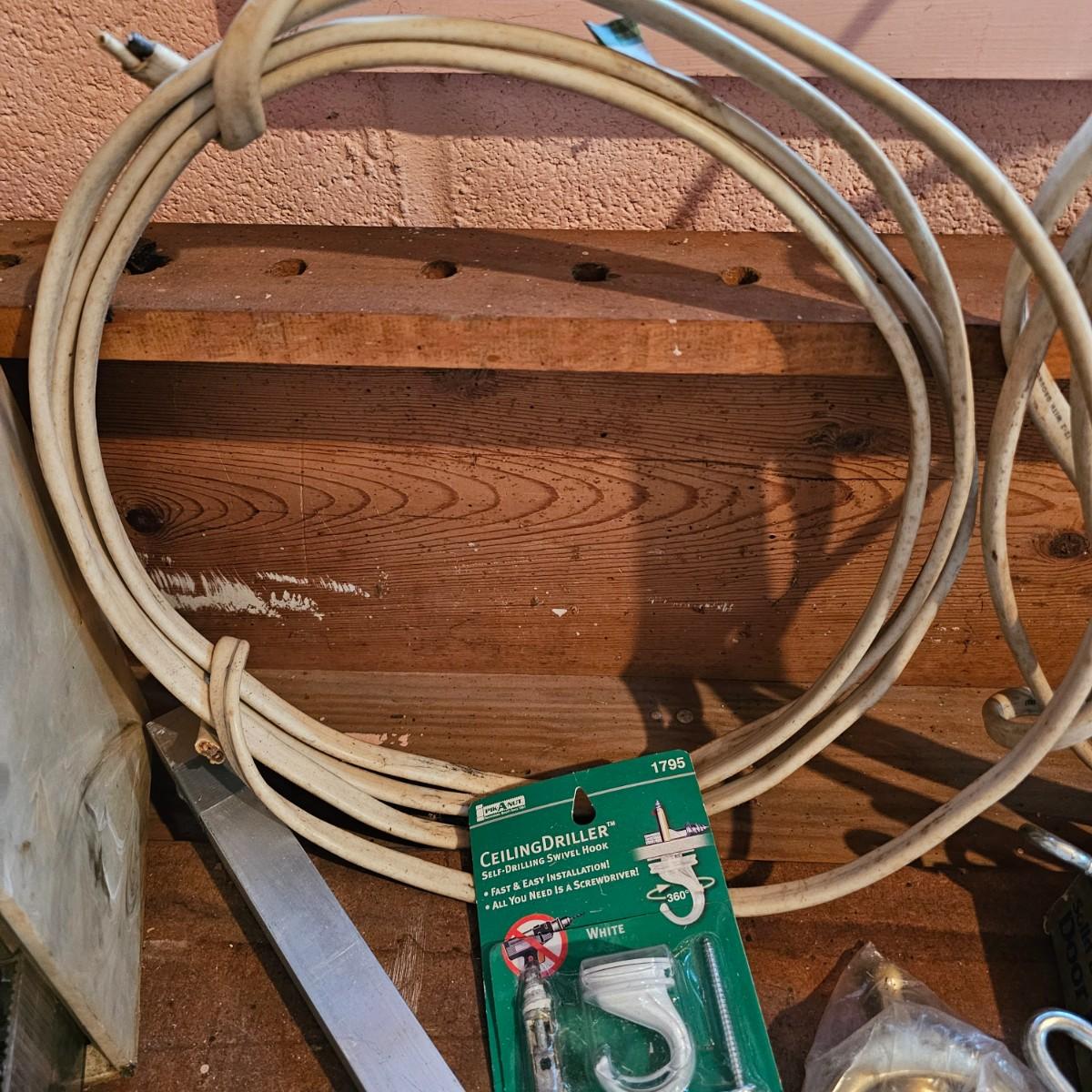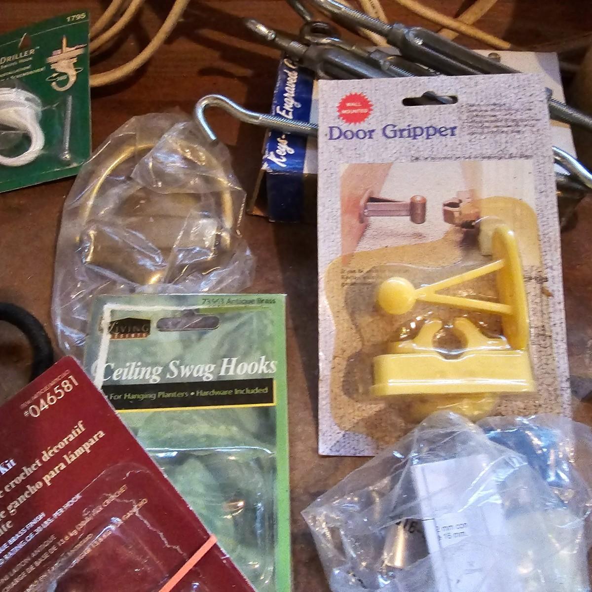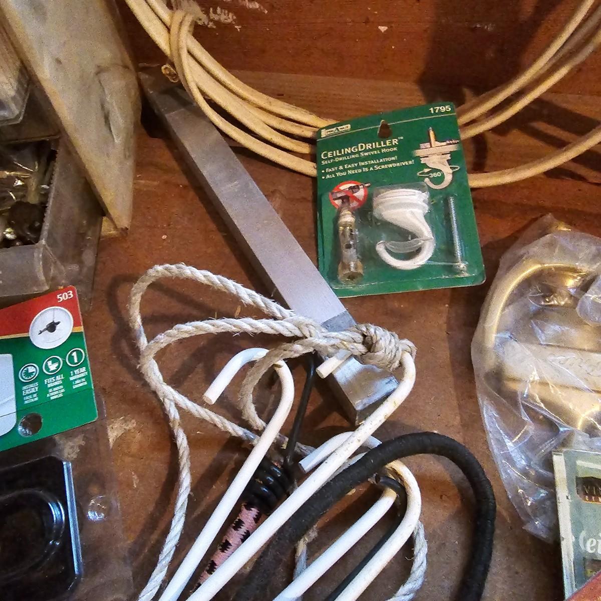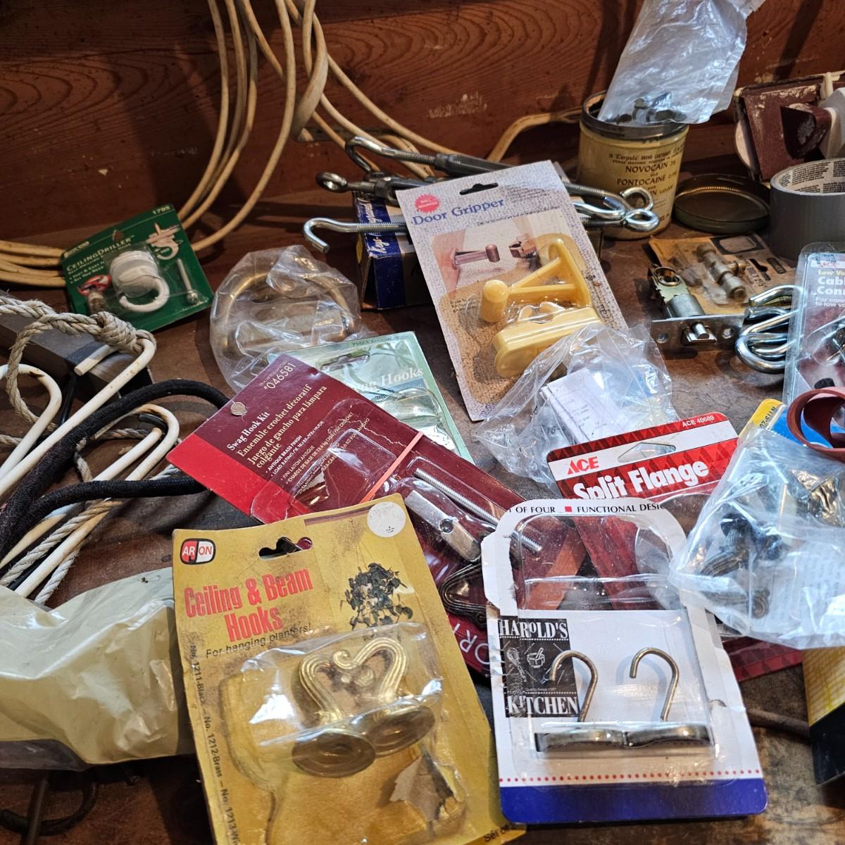 General selection of screws, nails, fasteners, hooks and more. Two short lengths of 12-2 w/ground wire. Small storage drawers with hardware inside. Turnbuckles, straps etc. Also some paint rollers, foam brushes, edge painters, drop cloths and wallpaper tools. See photos for details. Shipping available.