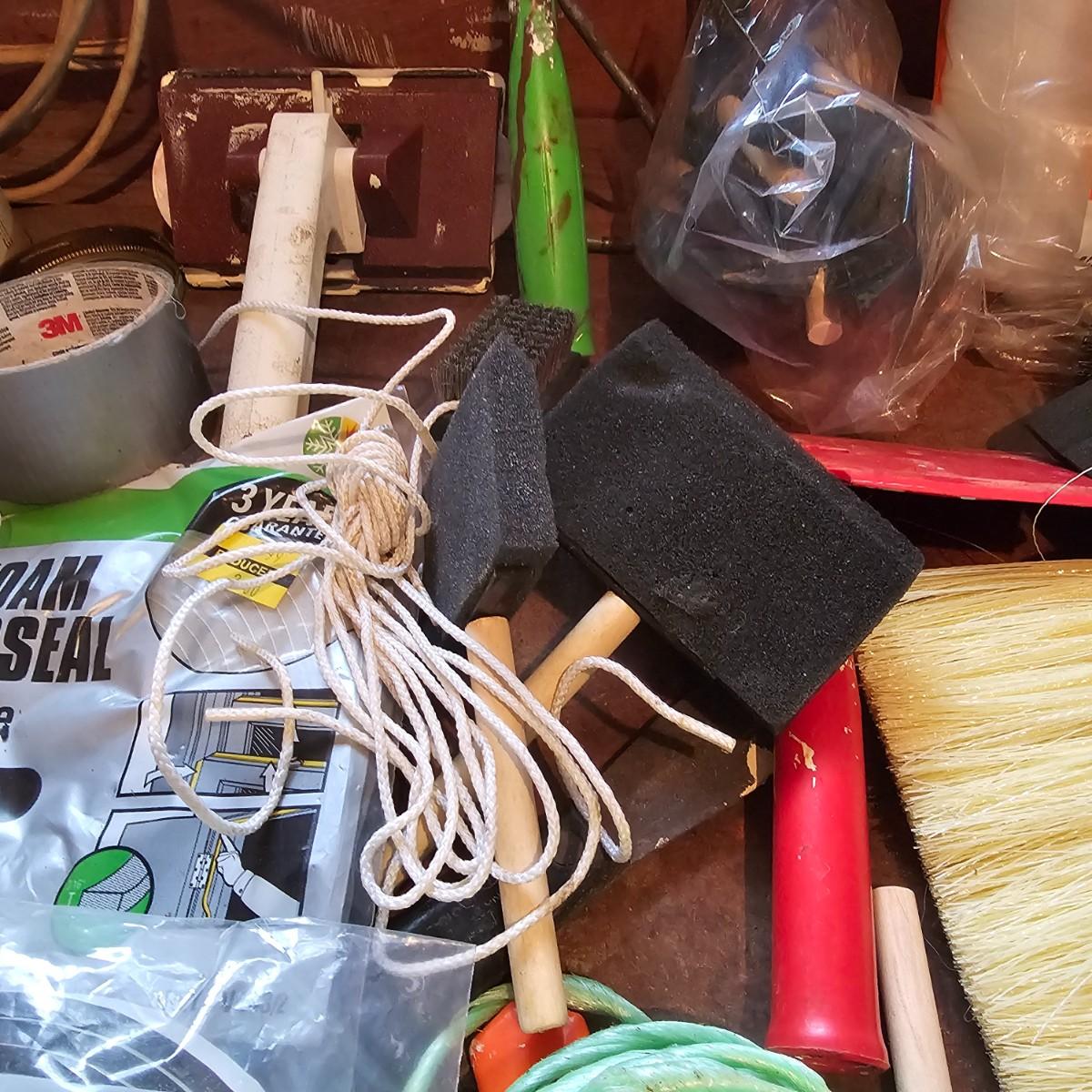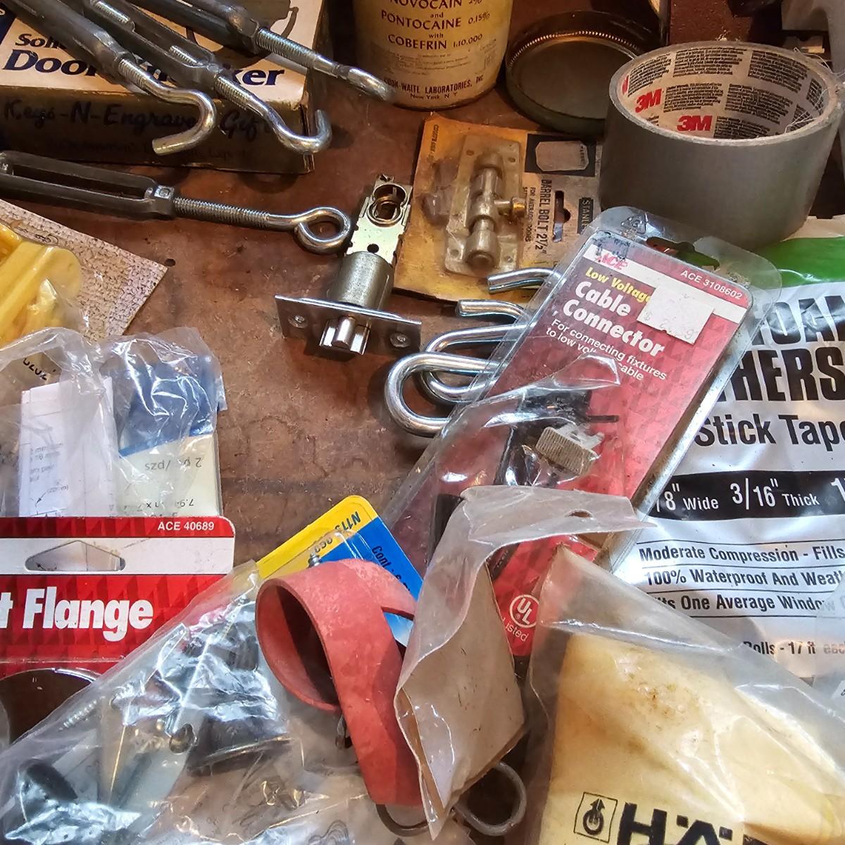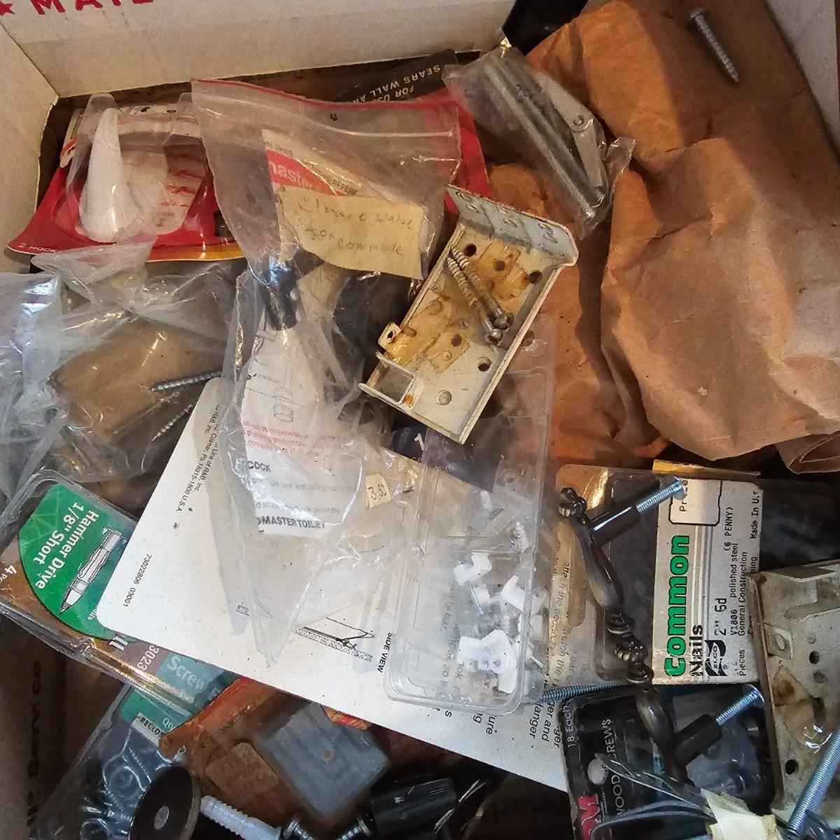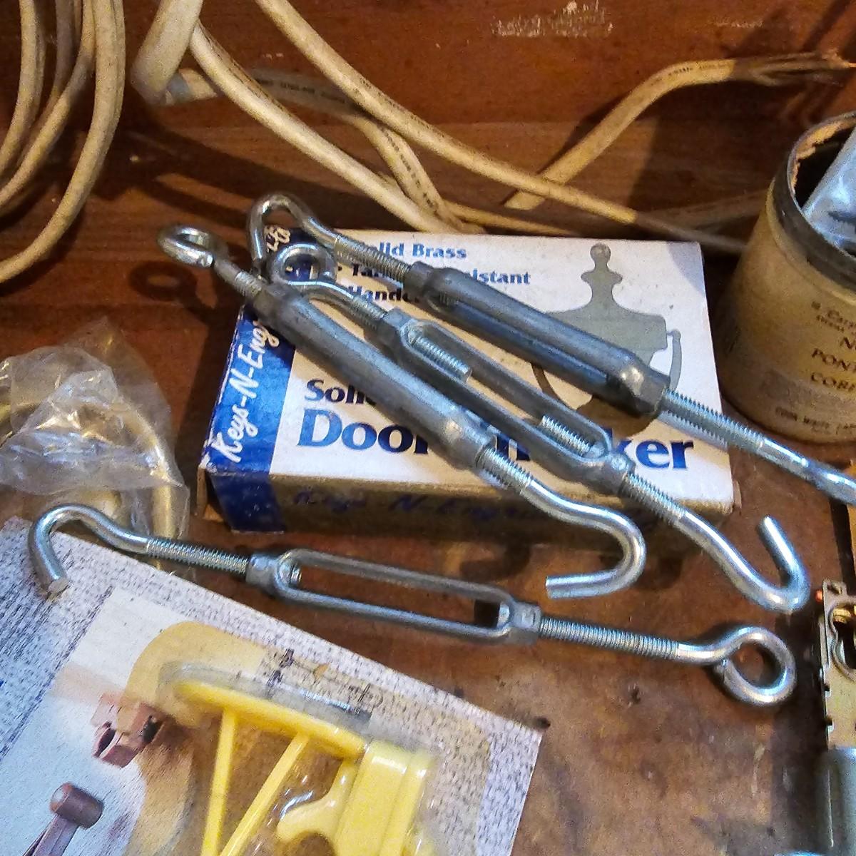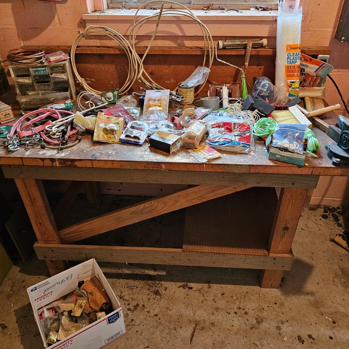 General selection of screws, nails, fasteners, hooks and more. Two short lengths of 12-2 w/ground wire. Small storage drawers with hardware inside. Turnbuckles, straps etc. Also some paint rollers, foam brushes, edge painters, drop cloths and wallpaper tools. See photos for details. Shipping available.