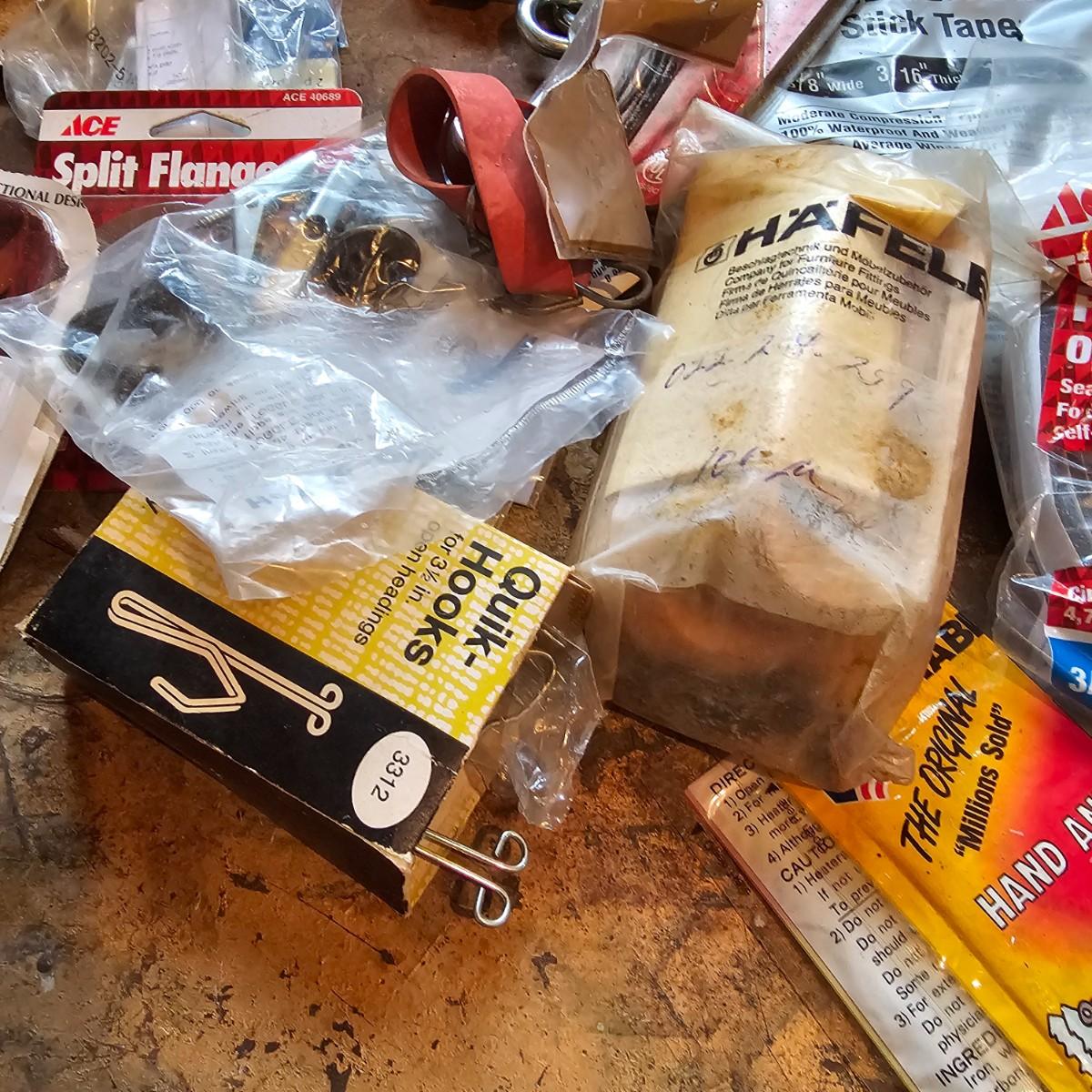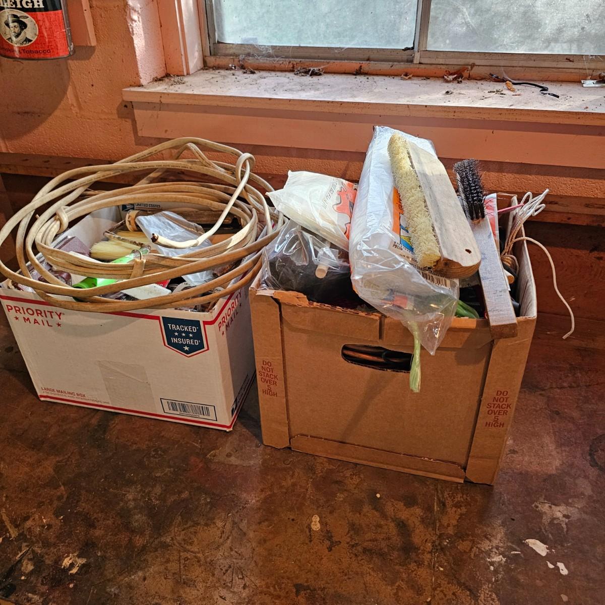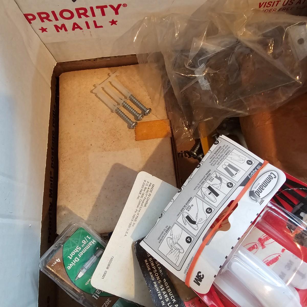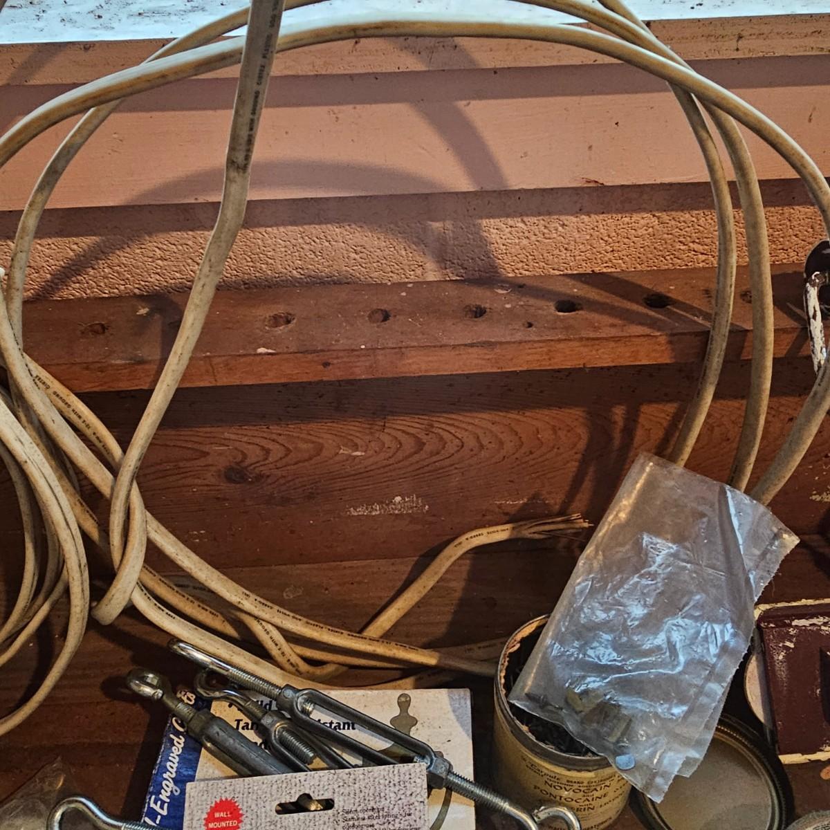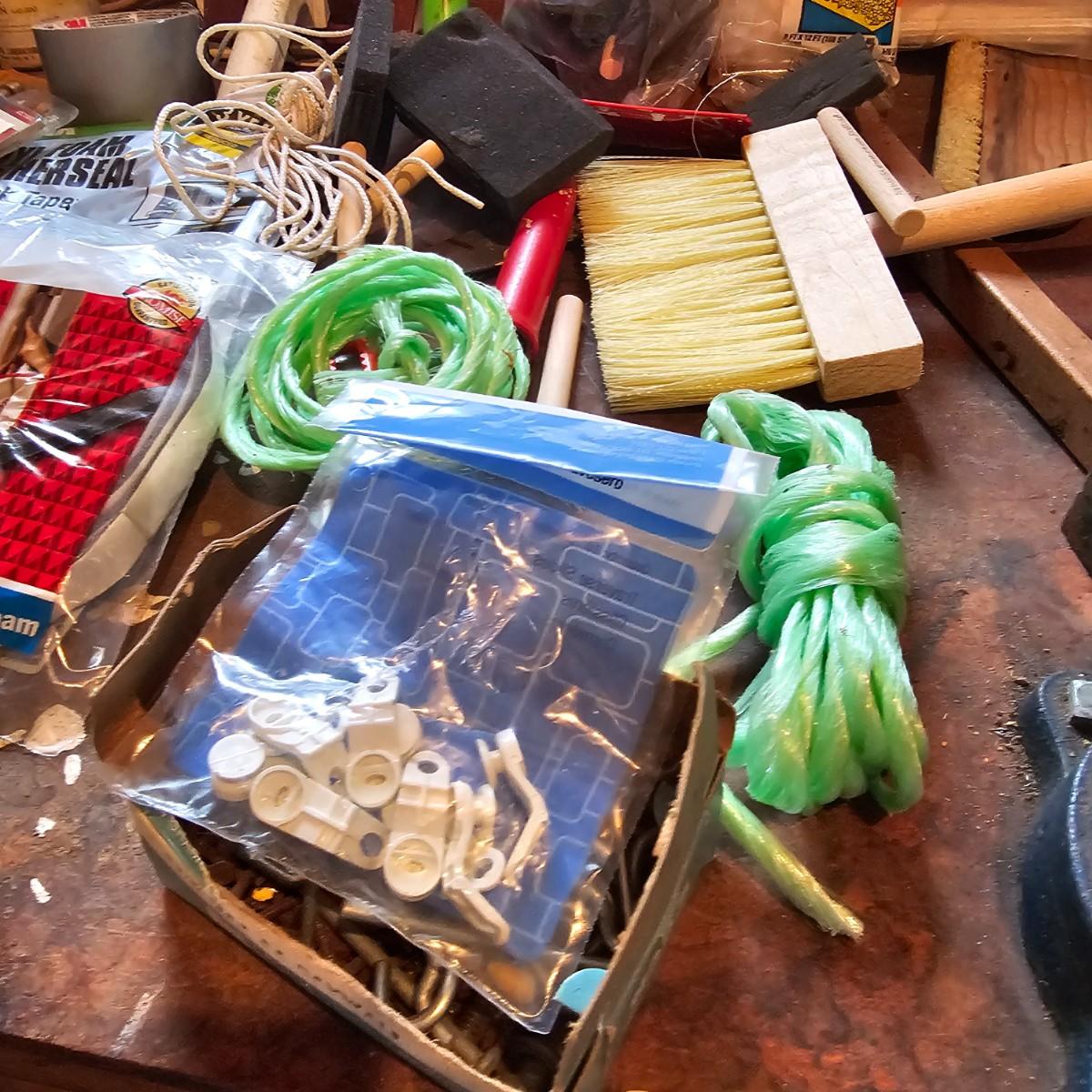 General selection of screws, nails, fasteners, hooks and more. Two short lengths of 12-2 w/ground wire. Small storage drawers with hardware inside. Turnbuckles, straps etc. Also some paint rollers, foam brushes, edge painters, drop cloths and wallpaper tools. See photos for details. Shipping available.
