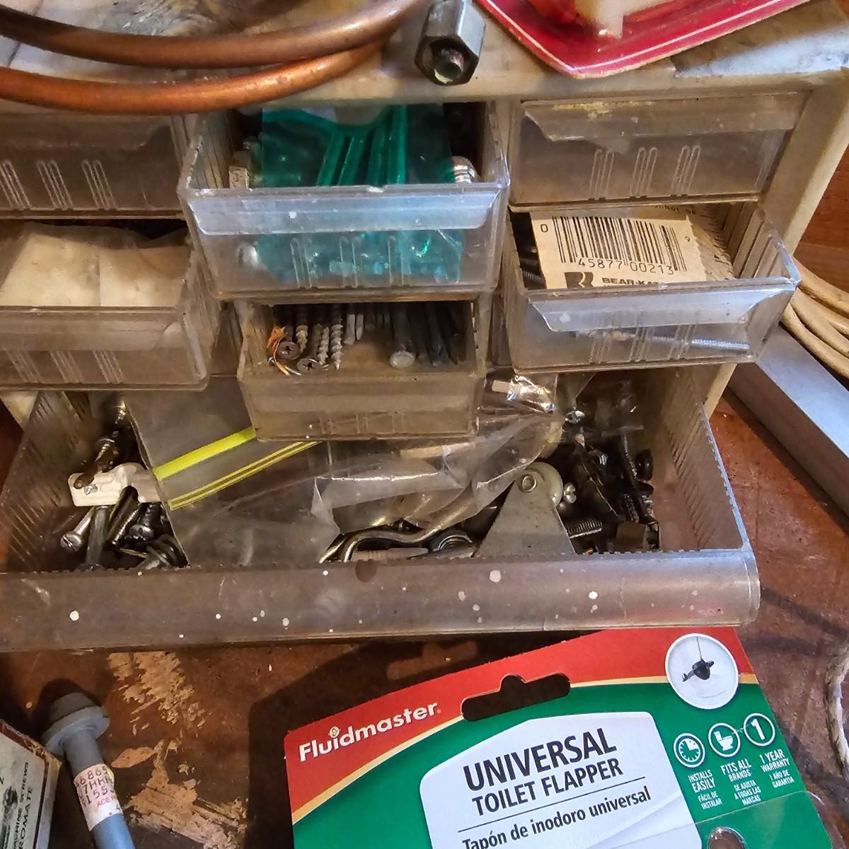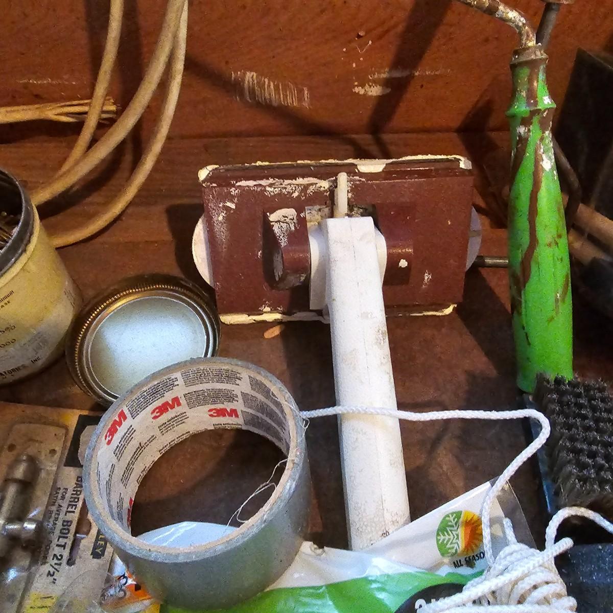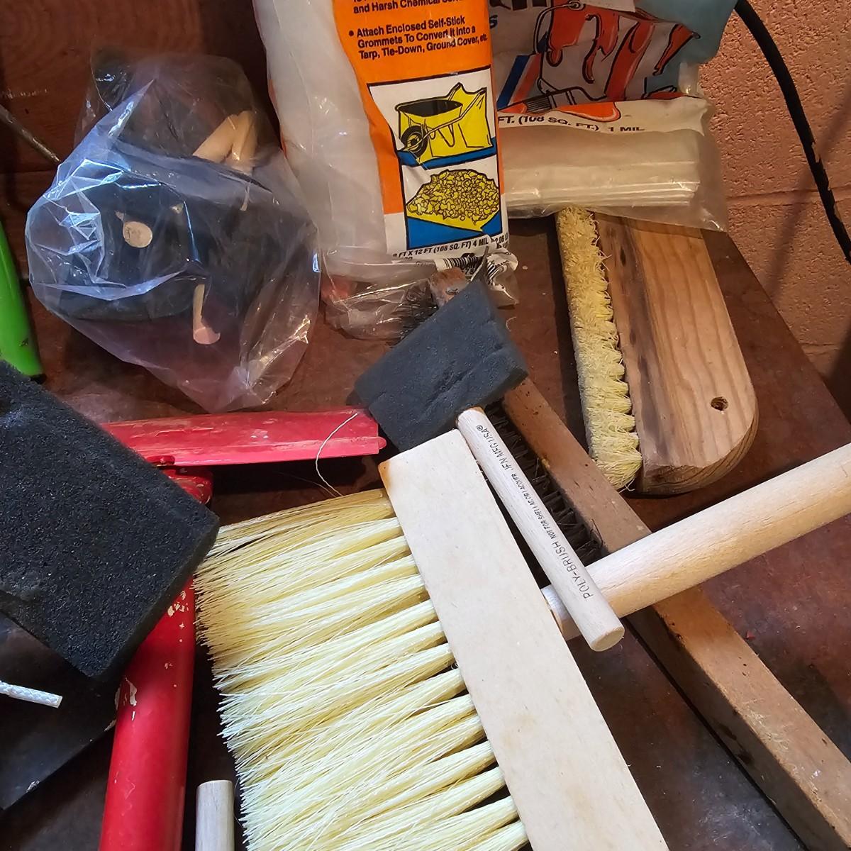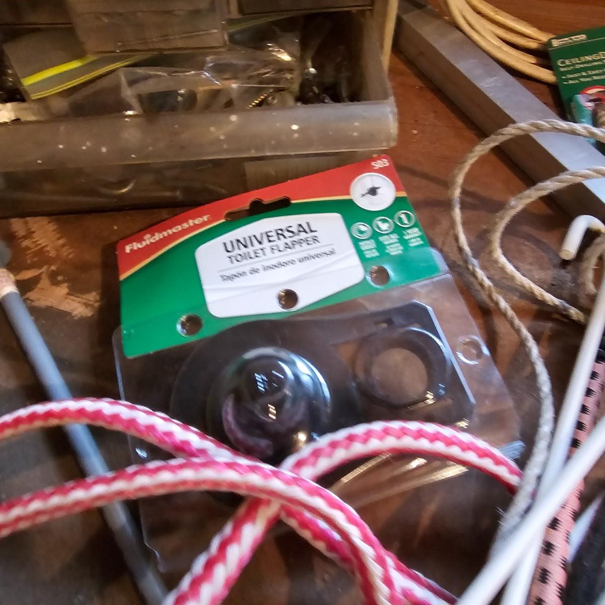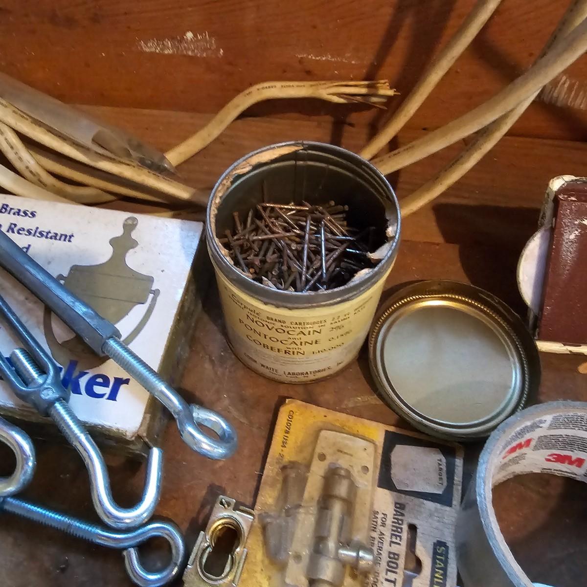 General selection of screws, nails, fasteners, hooks and more. Two short lengths of 12-2 w/ground wire. Small storage drawers with hardware inside. Turnbuckles, straps etc. Also some paint rollers, foam brushes, edge painters, drop cloths and wallpaper tools. See photos for details. Shipping available.