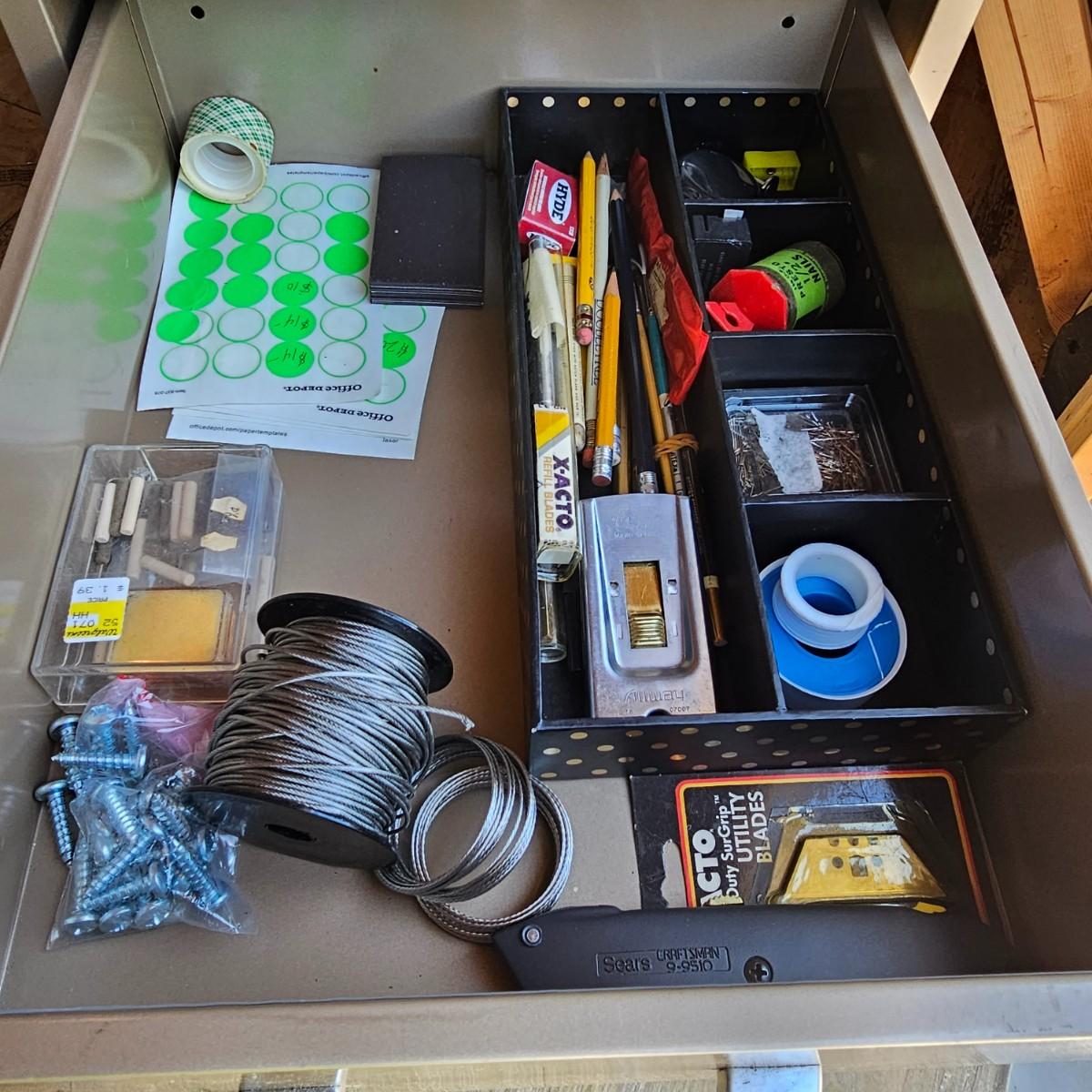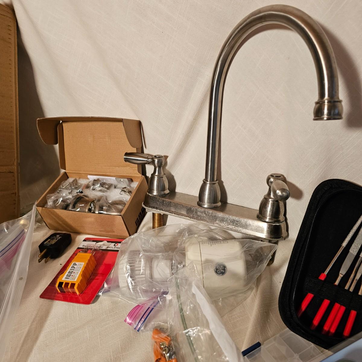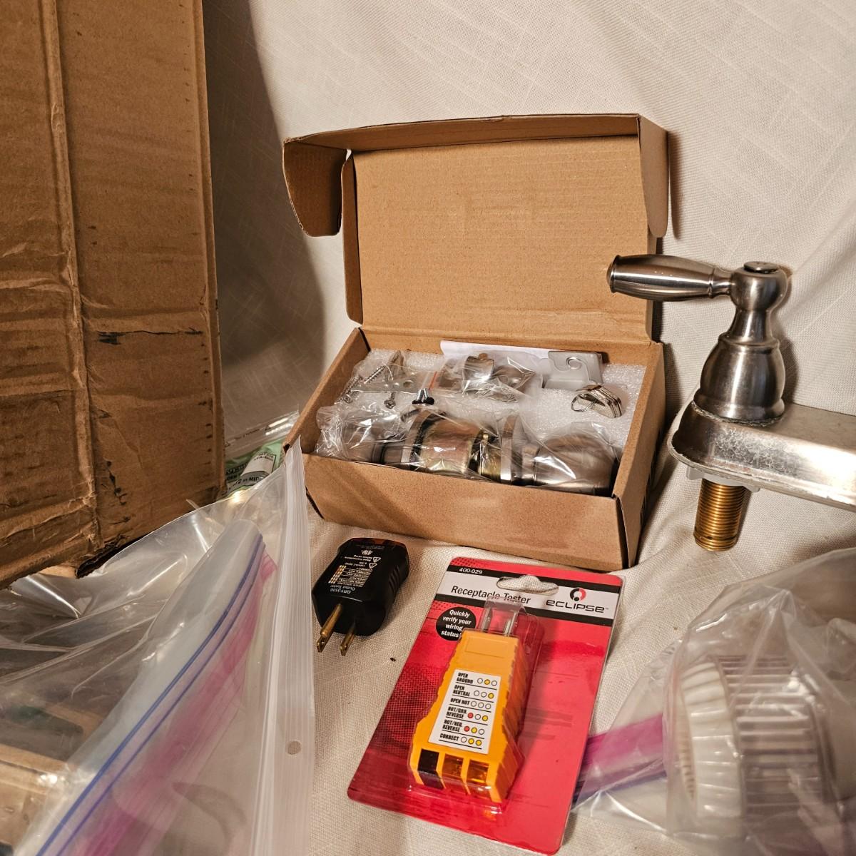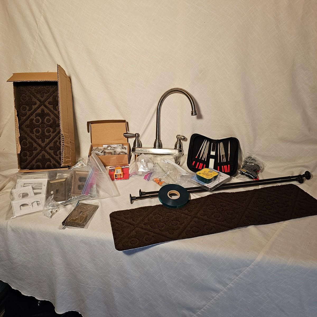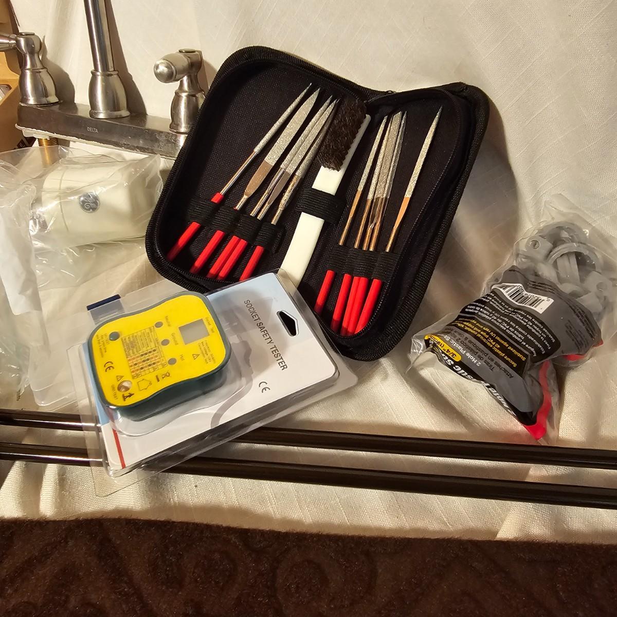 Miscellaneous plumbing, electrical and more. Plastic and brass switch and outlet covers. Set of corundum files in case. Two faucets, circuit testers. Nine adhesive stair treads, 8" x 30". A four drawer steel cabinet with assorted hand tools, zip ties, velcro, staples, more. One Surebonder glue gun and sticks, powered on when plugged in. See photos for details. Local pickup only.