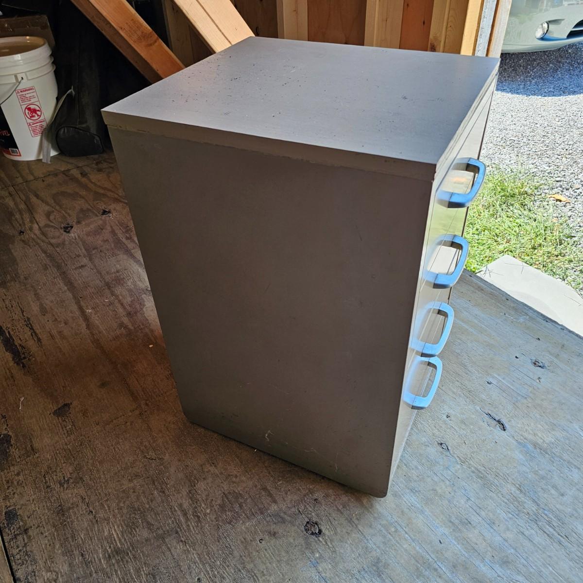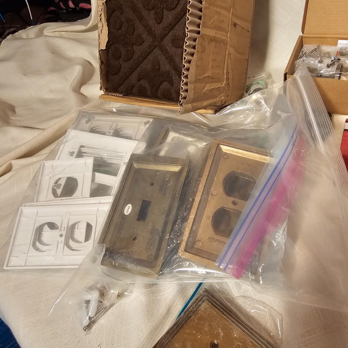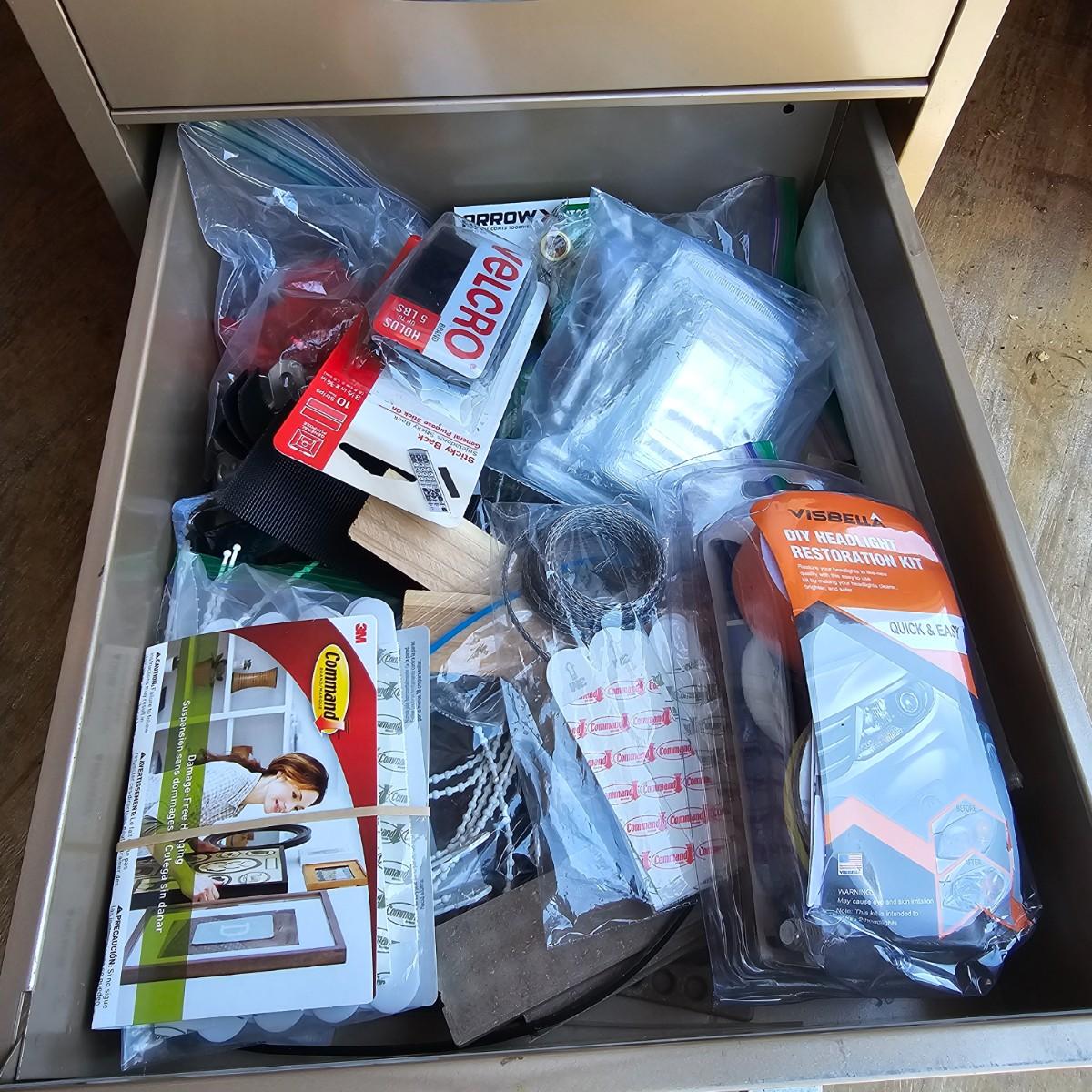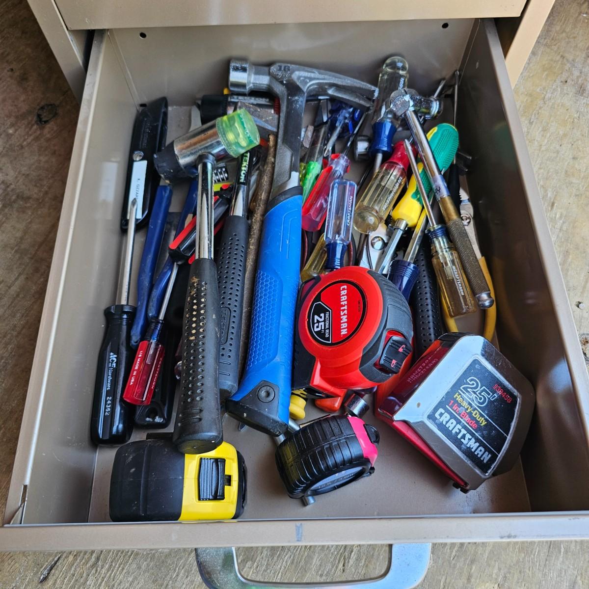 Miscellaneous plumbing, electrical and more. Plastic and brass switch and outlet covers. Set of corundum files in case. Two faucets, circuit testers. Nine adhesive stair treads, 8" x 30". A four drawer steel cabinet with assorted hand tools, zip ties, velcro, staples, more. One Surebonder glue gun and sticks, powered on when plugged in. See photos for details. Local pickup only.