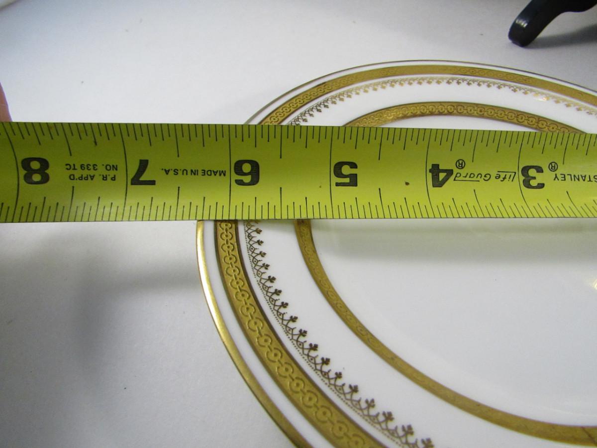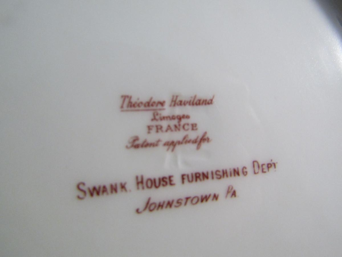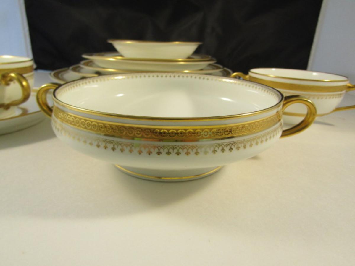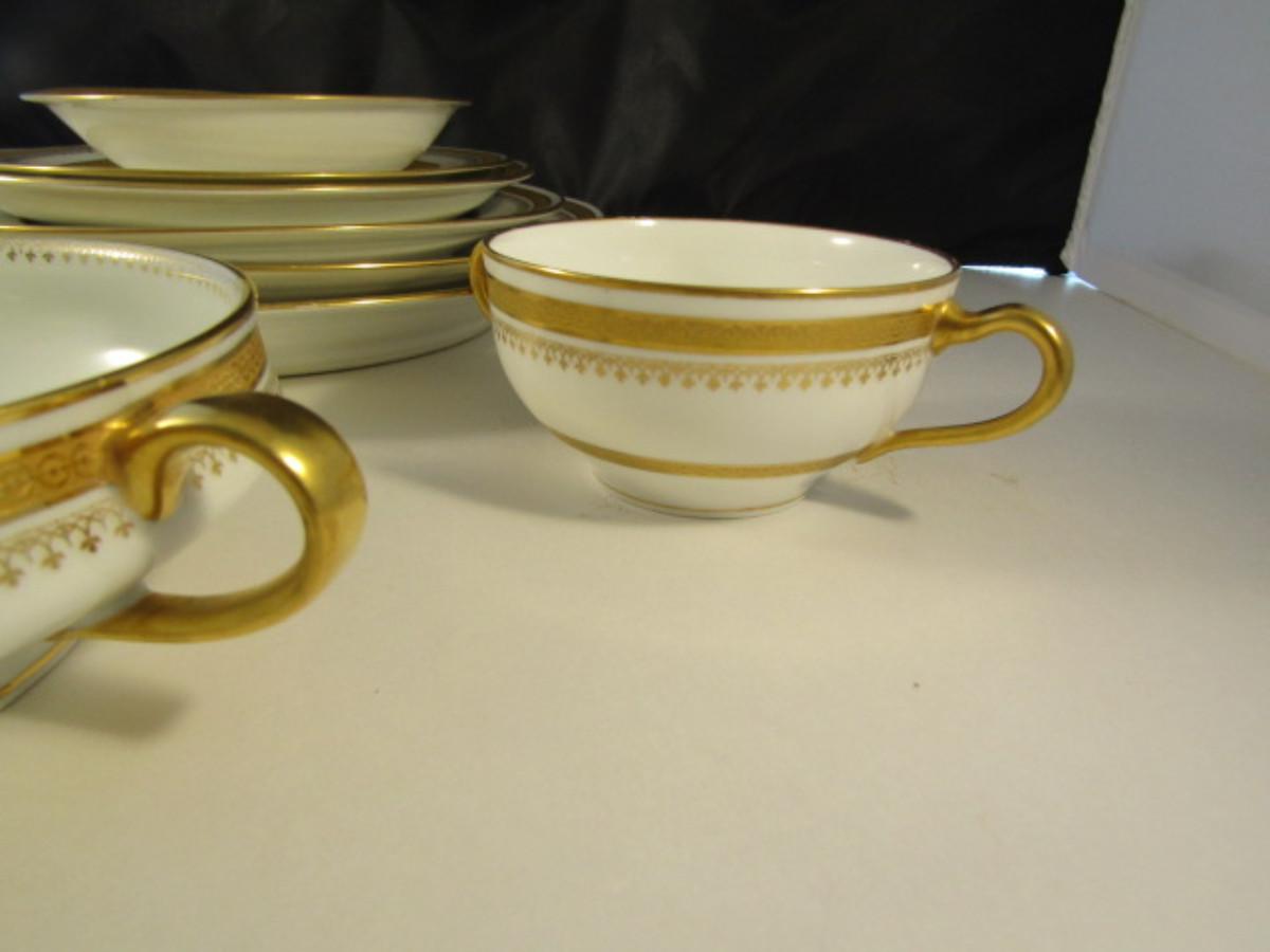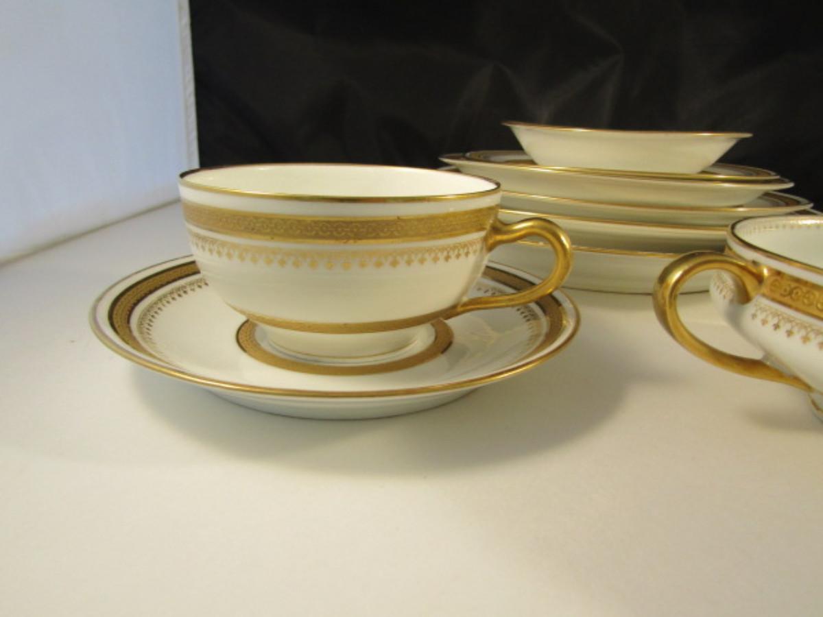 Assorted Haviland Limoges Dinnerware- Classic White with Gilded Design- Approx 63 Pieces. Dinner Plate (9 7/8")- 2, Luncheon Plate (8 3/4")- 3, Bread/Dessert Plate (6 1/4")- 22, Salad Plate (7 5/8")- 1. Berry Bowl- 3, Bowl (7 1/2")- 9, Regular Cup- 1, Regular Saucer- 11, Two Handled Cup- 3, Two Handled Soup- 4, Plate for Two Handled Soup- 4. All in used condition- please allow for occasional chip/crack.