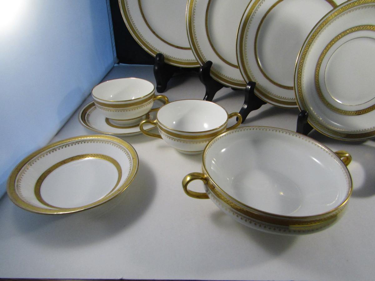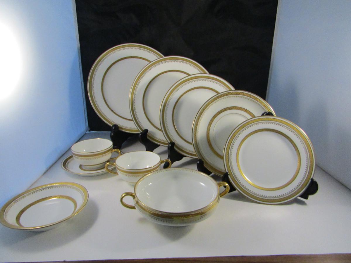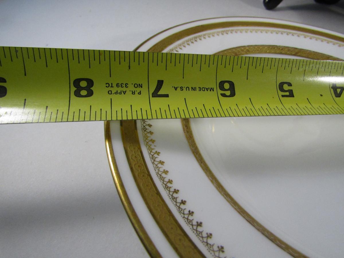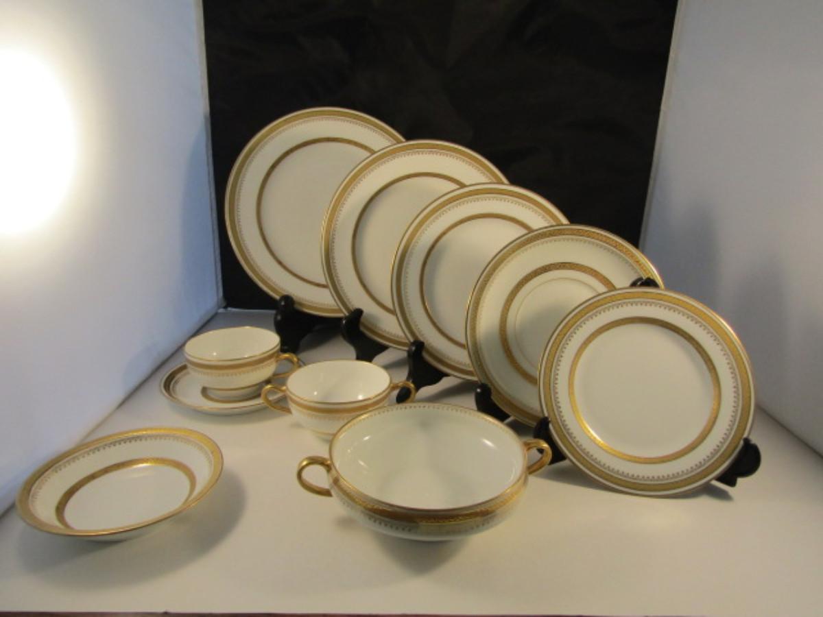 Assorted Haviland Limoges Dinnerware- Classic White with Gilded Design- Approx 63 Pieces. Dinner Plate (9 7/8")- 2, Luncheon Plate (8 3/4")- 3, Bread/Dessert Plate (6 1/4")- 22, Salad Plate (7 5/8")- 1. Berry Bowl- 3, Bowl (7 1/2")- 9, Regular Cup- 1, Regular Saucer- 11, Two Handled Cup- 3, Two Handled Soup- 4, Plate for Two Handled Soup- 4. All in used condition- please allow for occasional chip/crack.