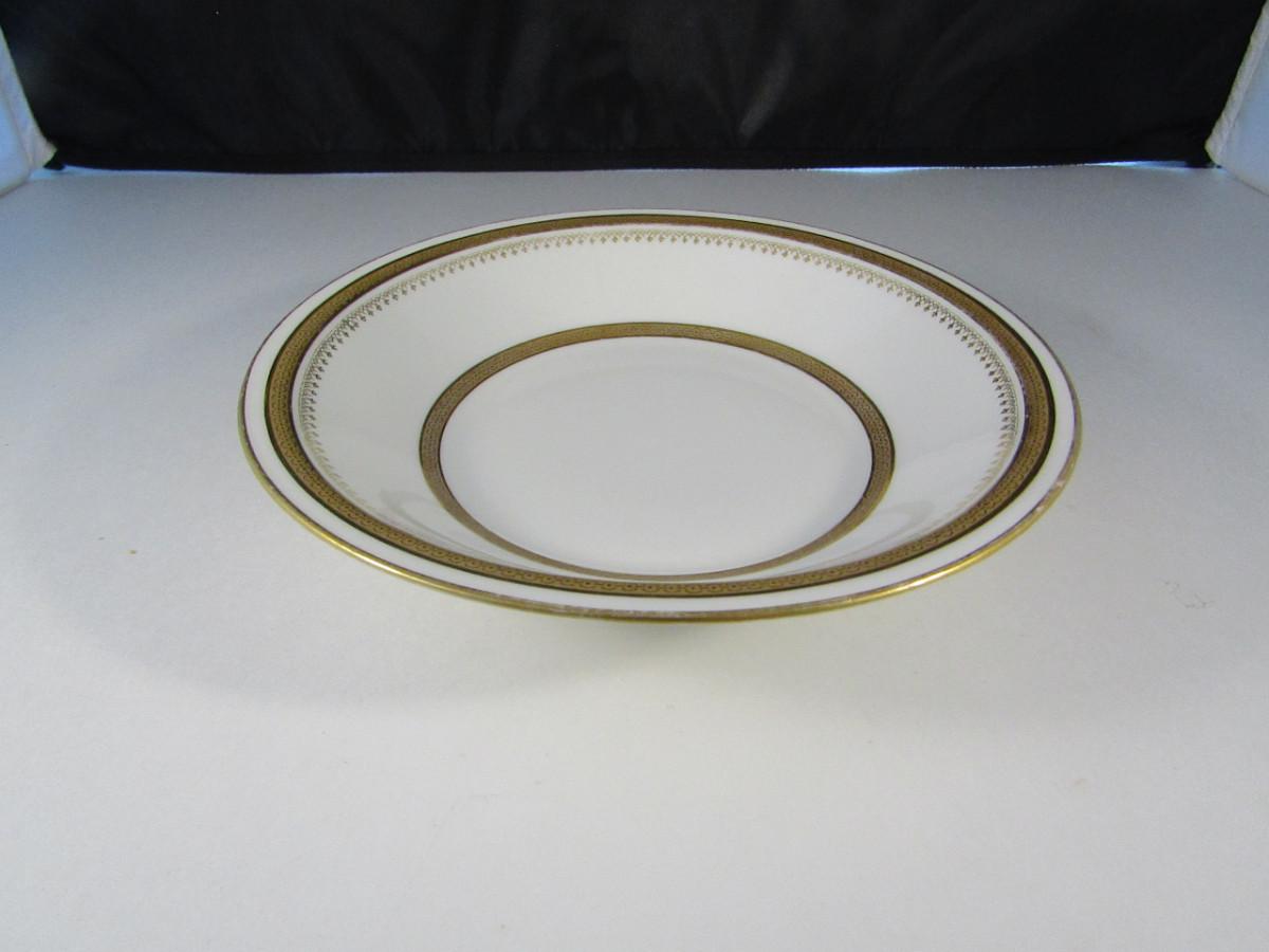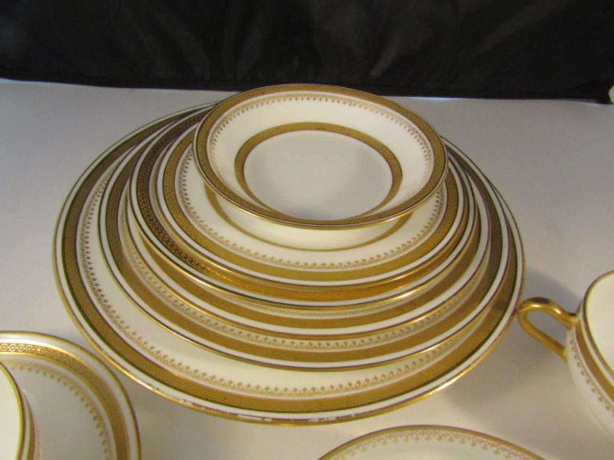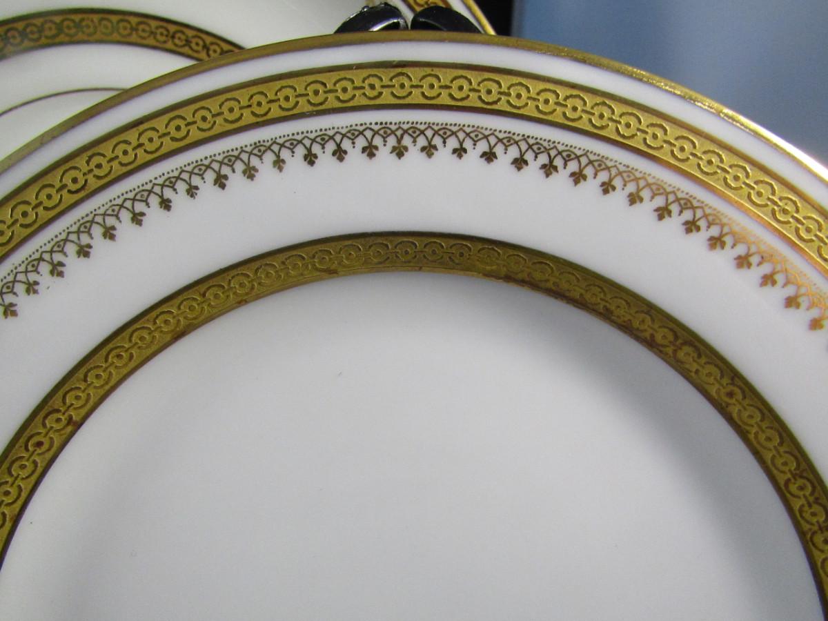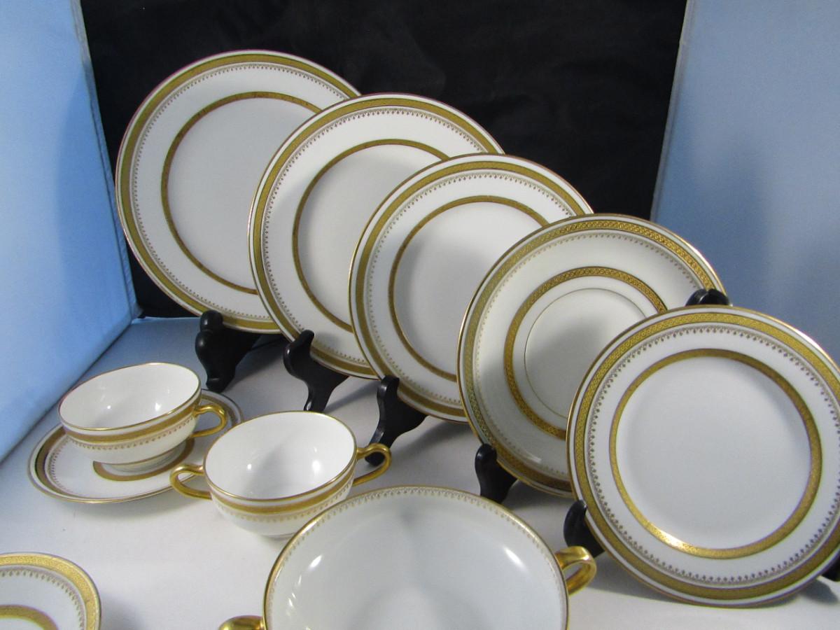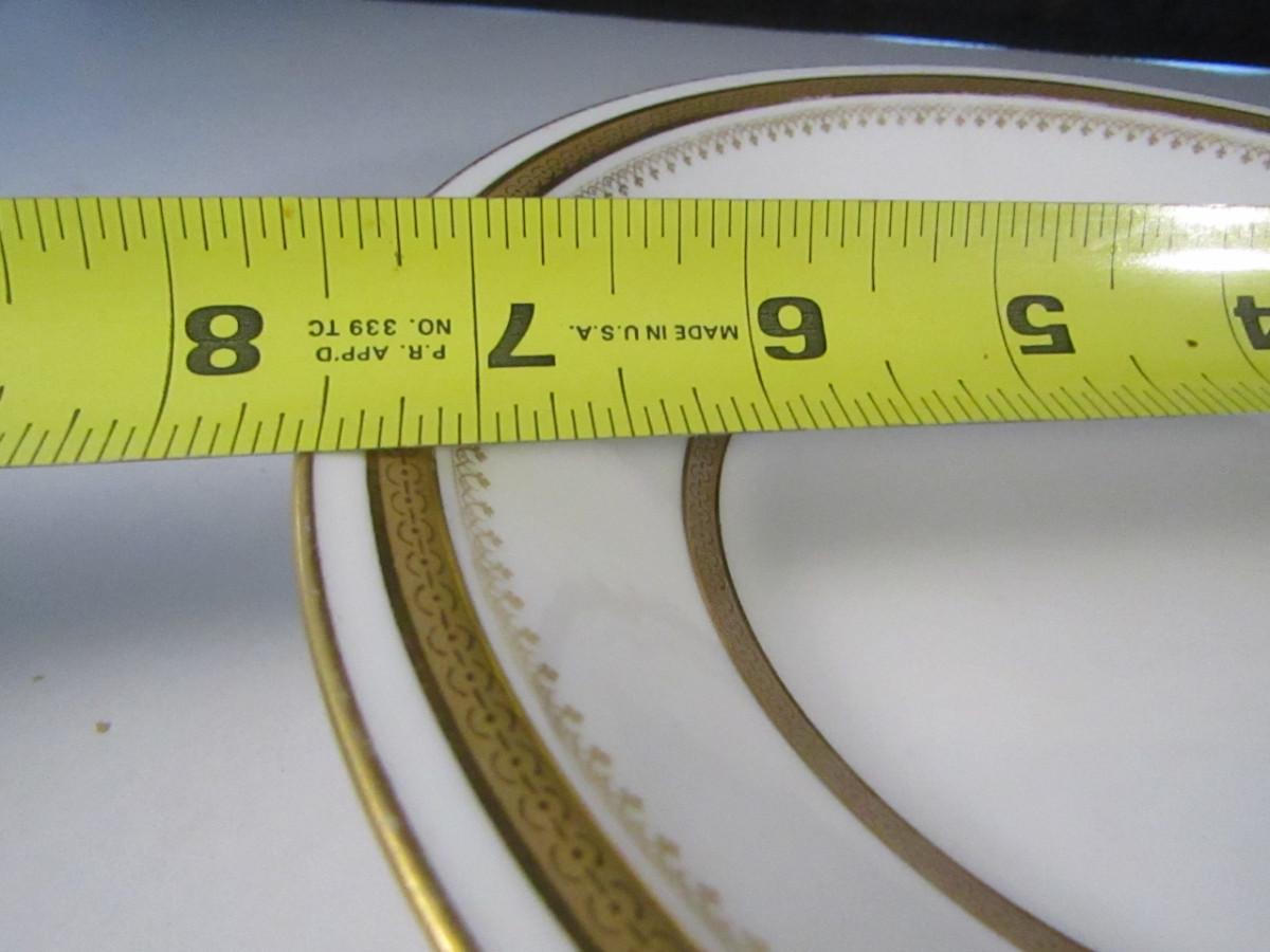 Assorted Haviland Limoges Dinnerware- Classic White with Gilded Design- Approx 63 Pieces. Dinner Plate (9 7/8")- 2, Luncheon Plate (8 3/4")- 3, Bread/Dessert Plate (6 1/4")- 22, Salad Plate (7 5/8")- 1. Berry Bowl- 3, Bowl (7 1/2")- 9, Regular Cup- 1, Regular Saucer- 11, Two Handled Cup- 3, Two Handled Soup- 4, Plate for Two Handled Soup- 4. All in used condition- please allow for occasional chip/crack.