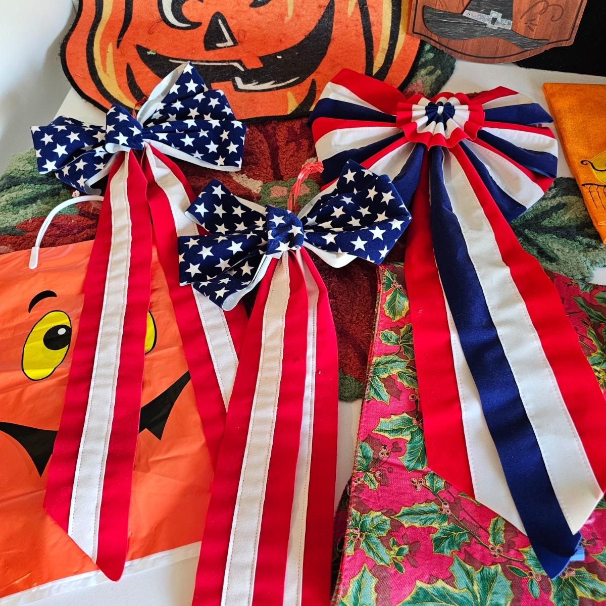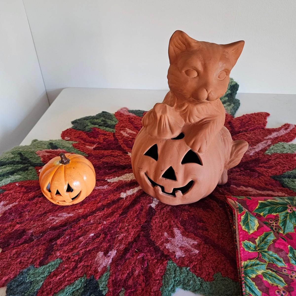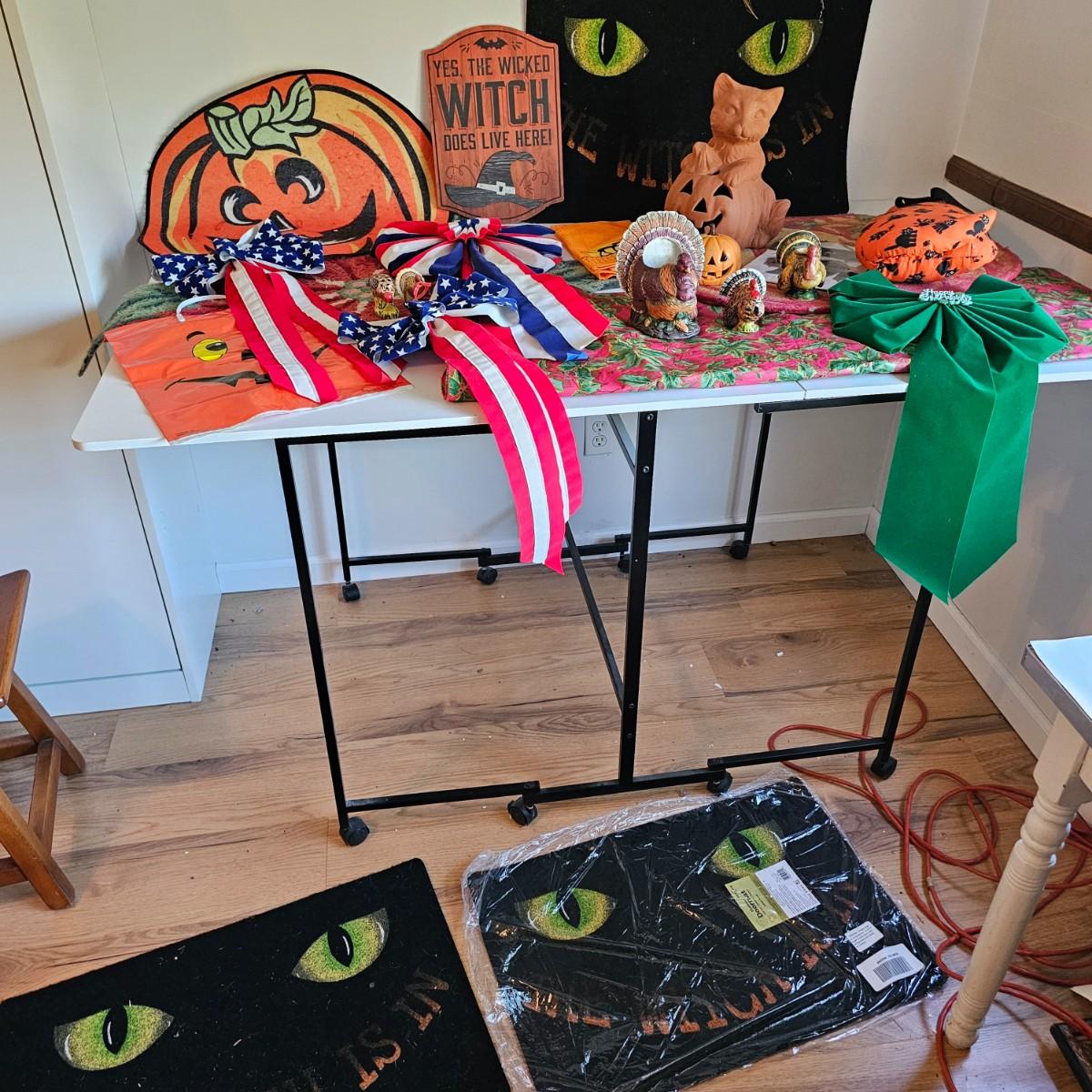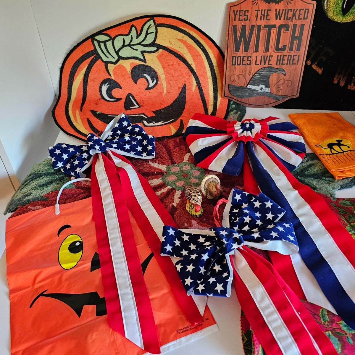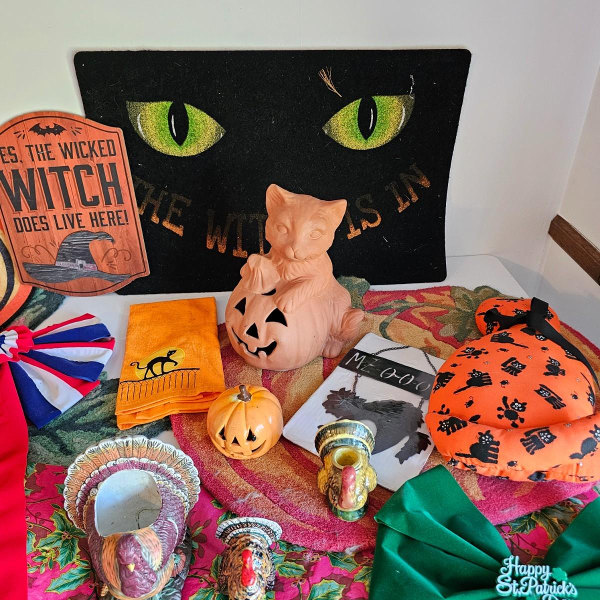 Some things for the other holidays besides Christmas. Halloween mats, 18" x 26". Terra cotta cot/pumpkin, 9" x 9" x 11"H. Other entry mats for Halloween and fall. Bows for St.Paddy's Day and Fourth of July. Five pieces of ceramic turkeys, planter and candle holders. Fall tablecloth, 52" x 88". See photos for details. Local pickup only.