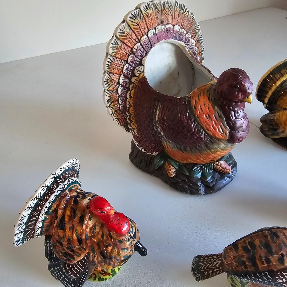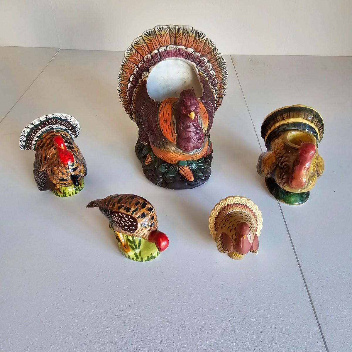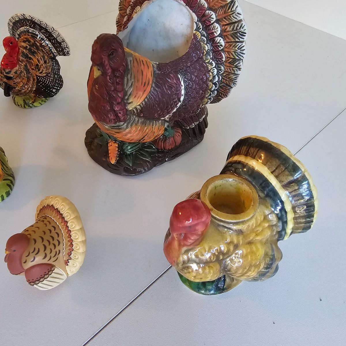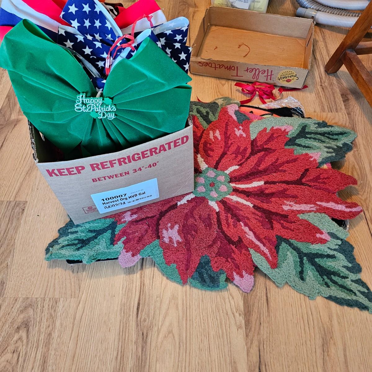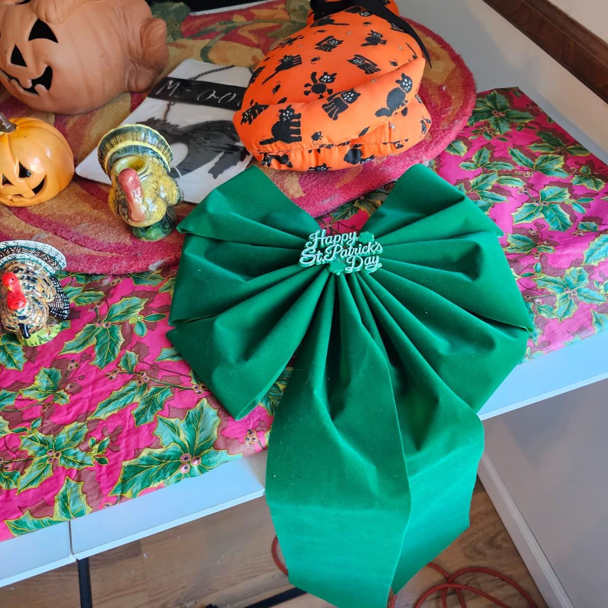 Some things for the other holidays besides Christmas. Halloween mats, 18" x 26". Terra cotta cot/pumpkin, 9" x 9" x 11"H. Other entry mats for Halloween and fall. Bows for St.Paddy's Day and Fourth of July. Five pieces of ceramic turkeys, planter and candle holders. Fall tablecloth, 52" x 88". See photos for details. Local pickup only.