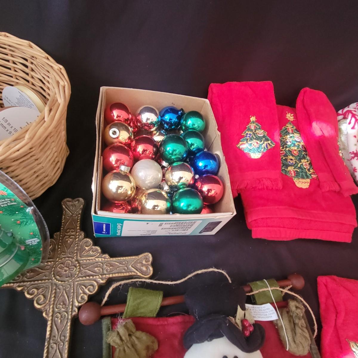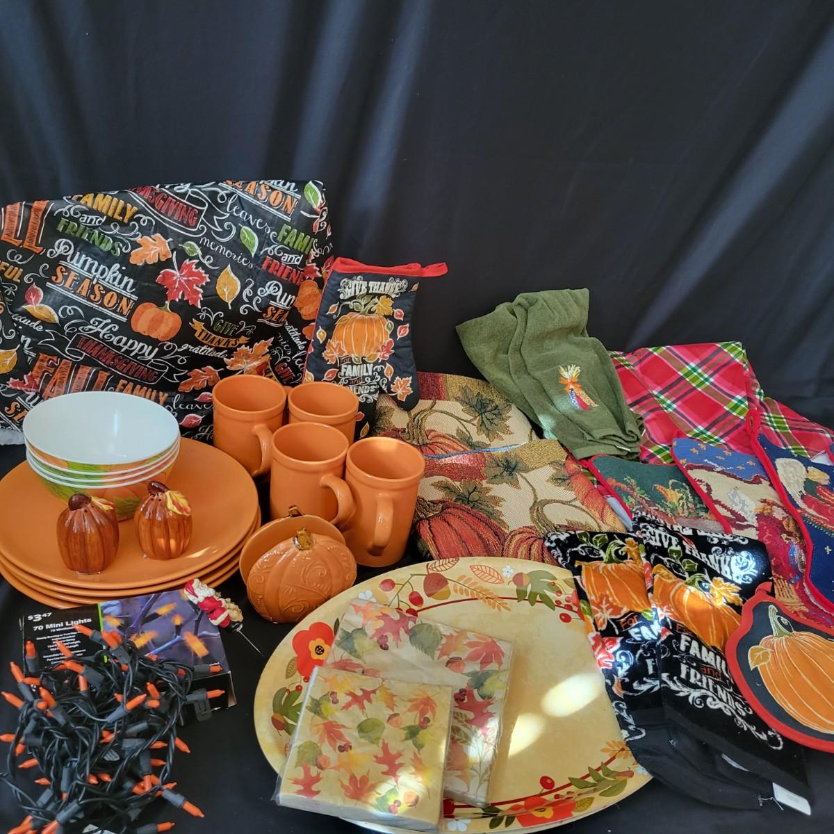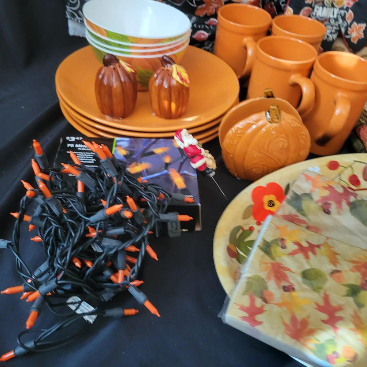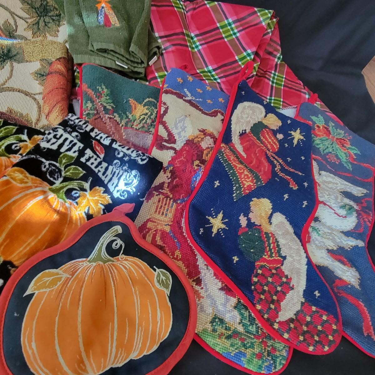 A variety of items for various holidays. Christmas items include ornaments, ribbon, reindeer candle holders, stocking hangers and more. Fall items includes working lights, ceramic plates and mugs, table runners and other assorted fall linens. Local pickup only