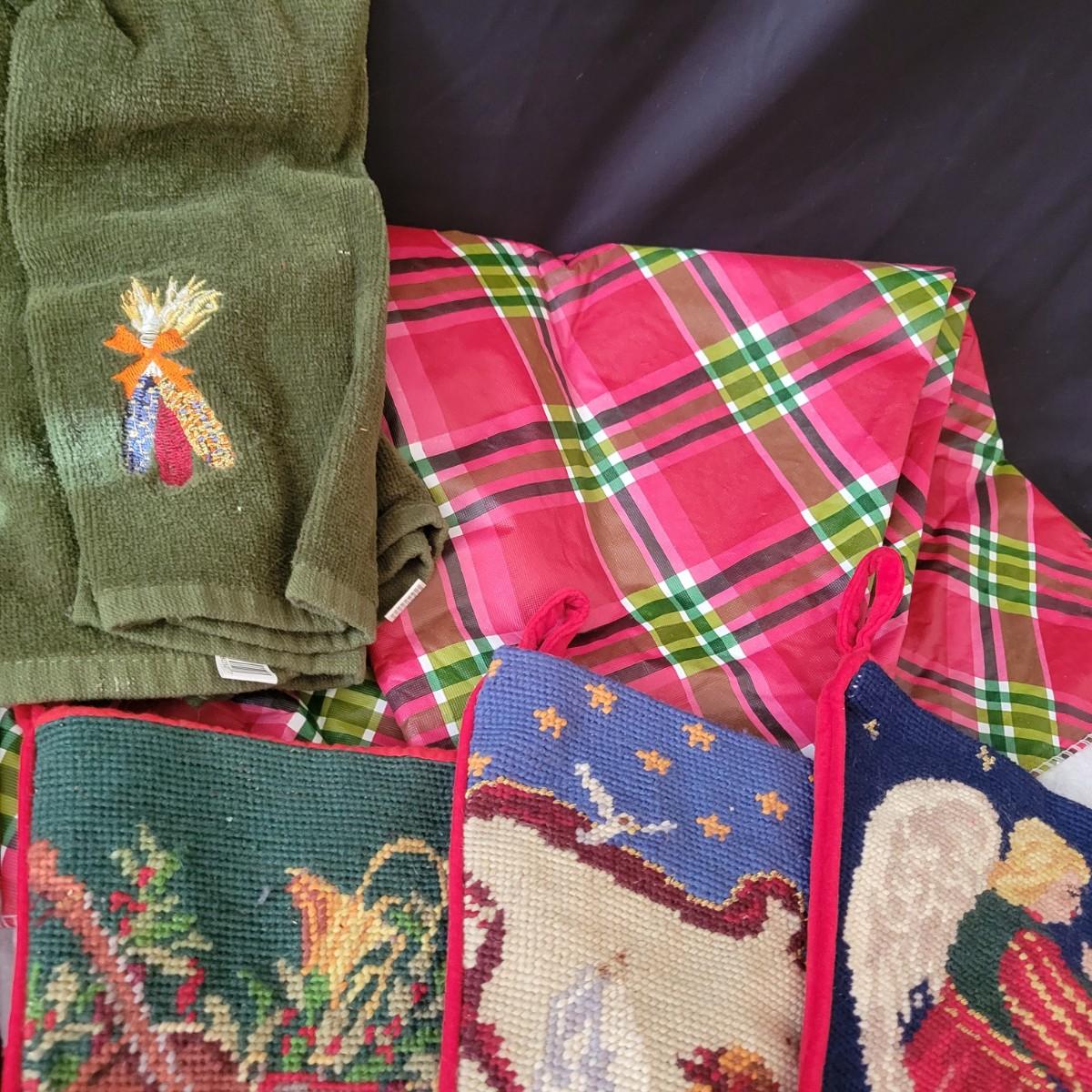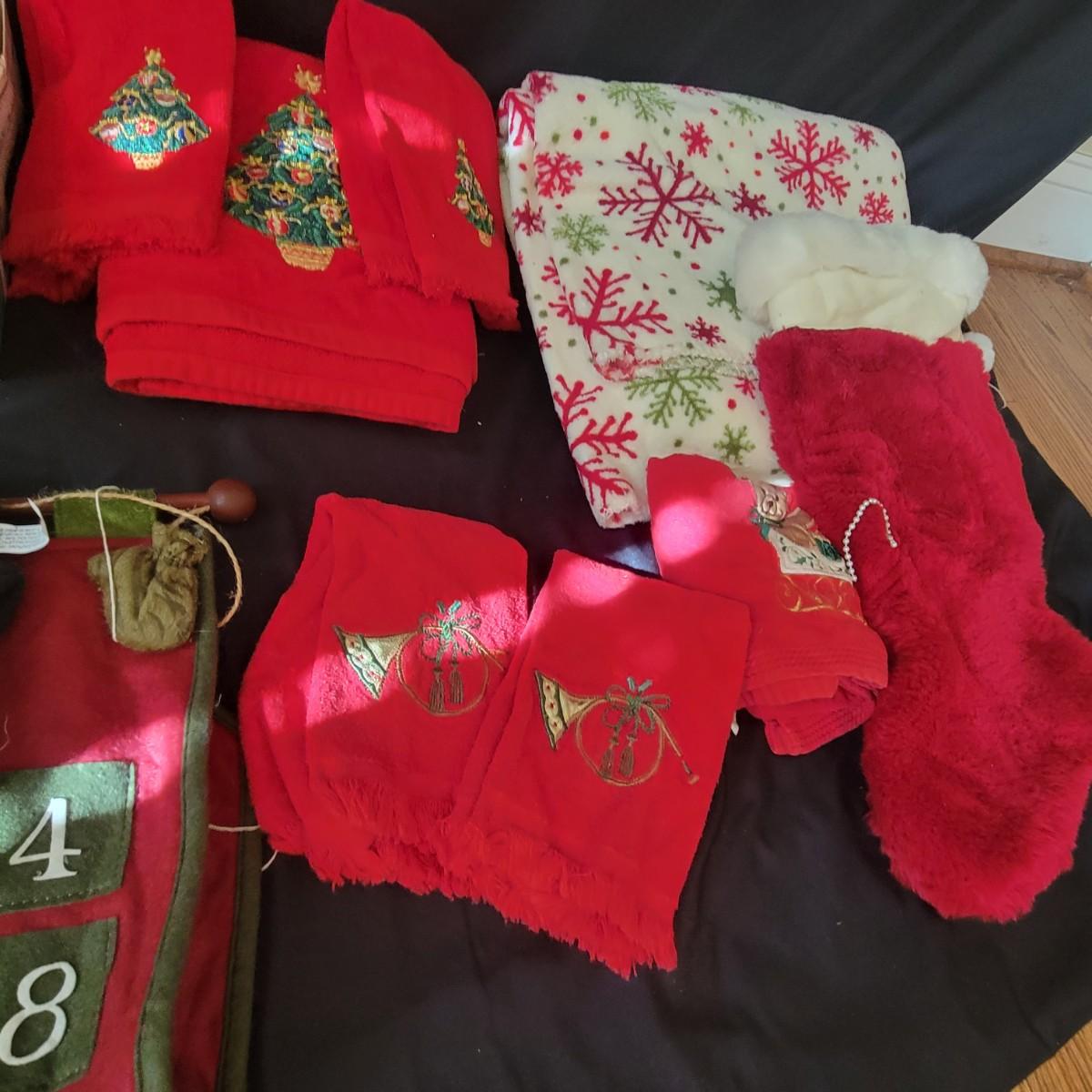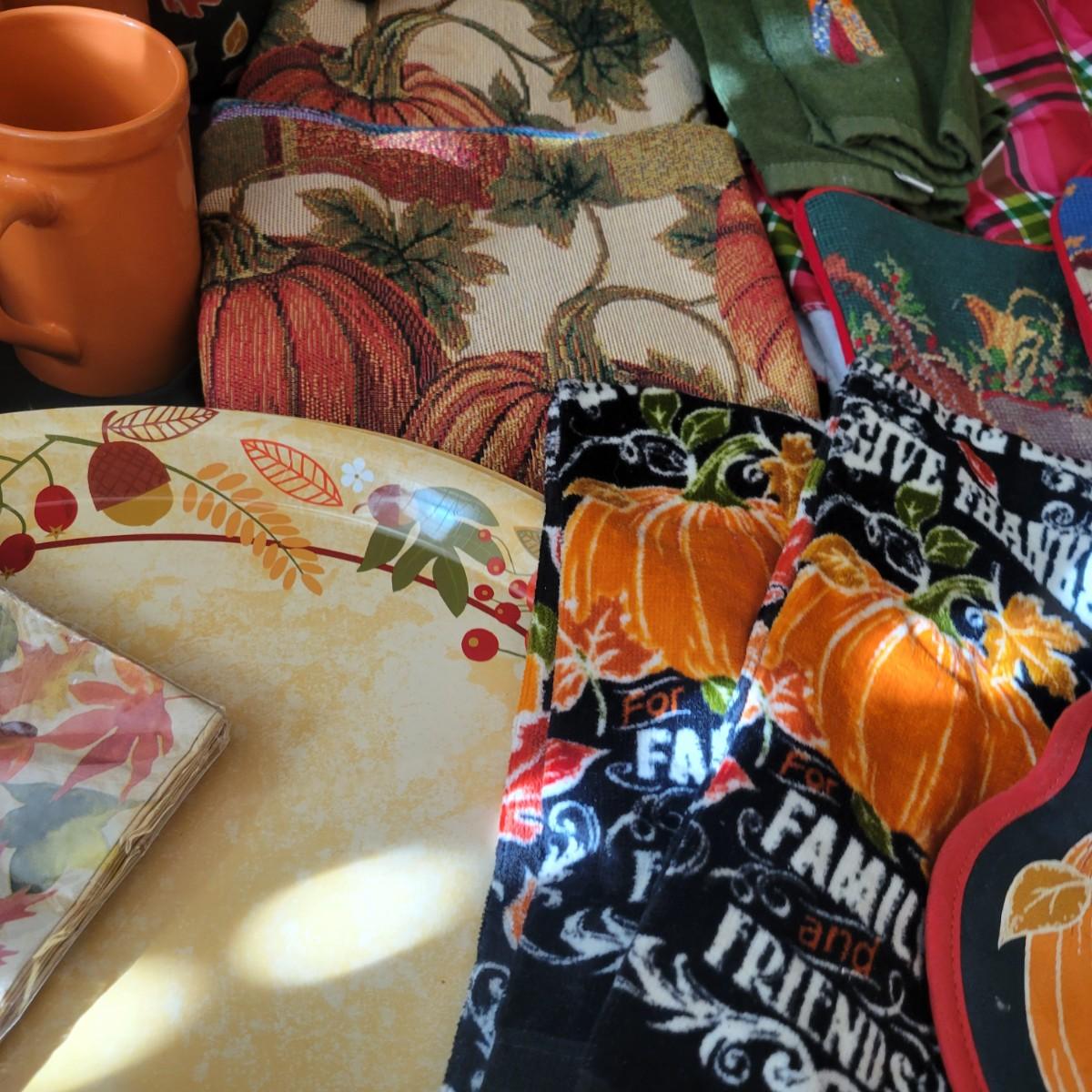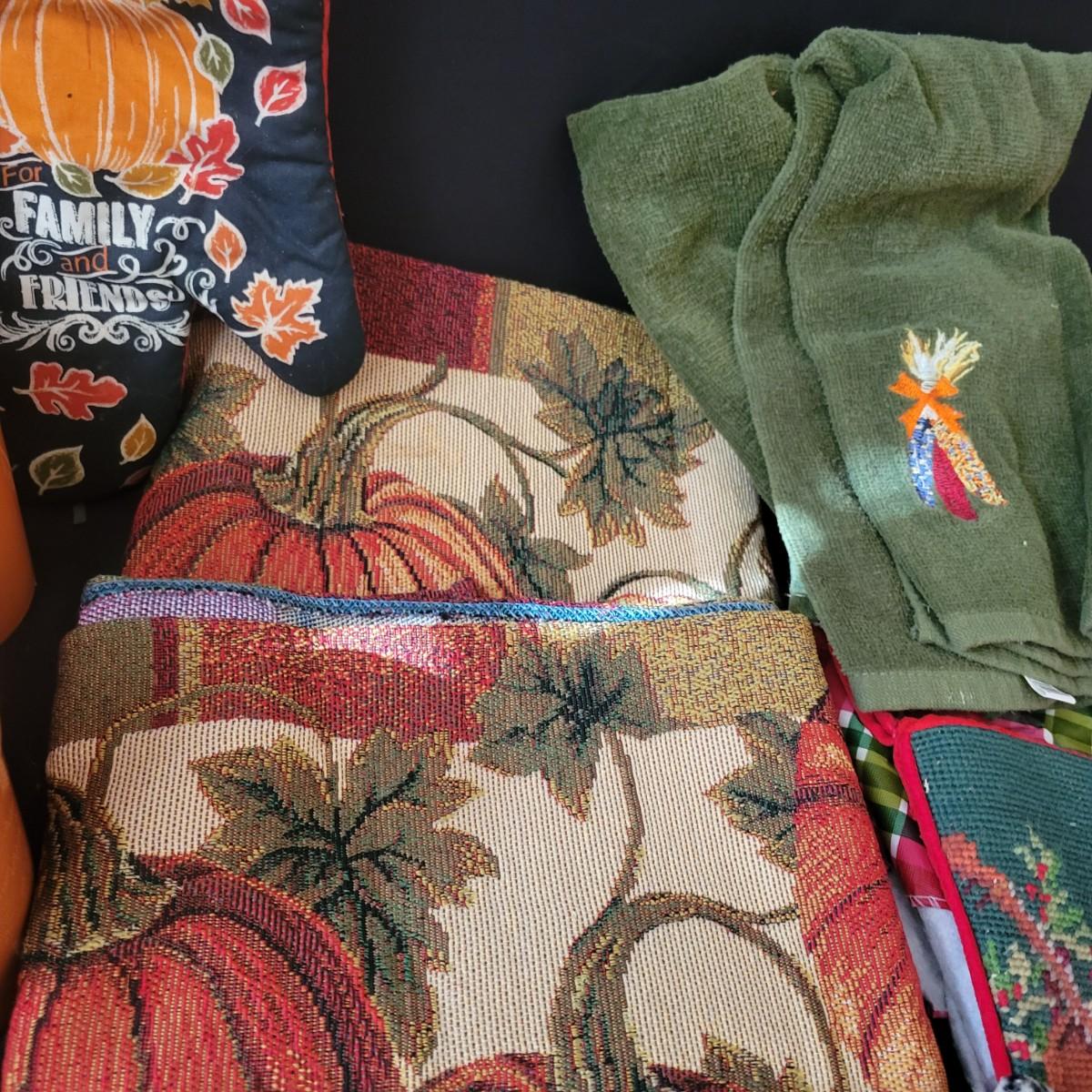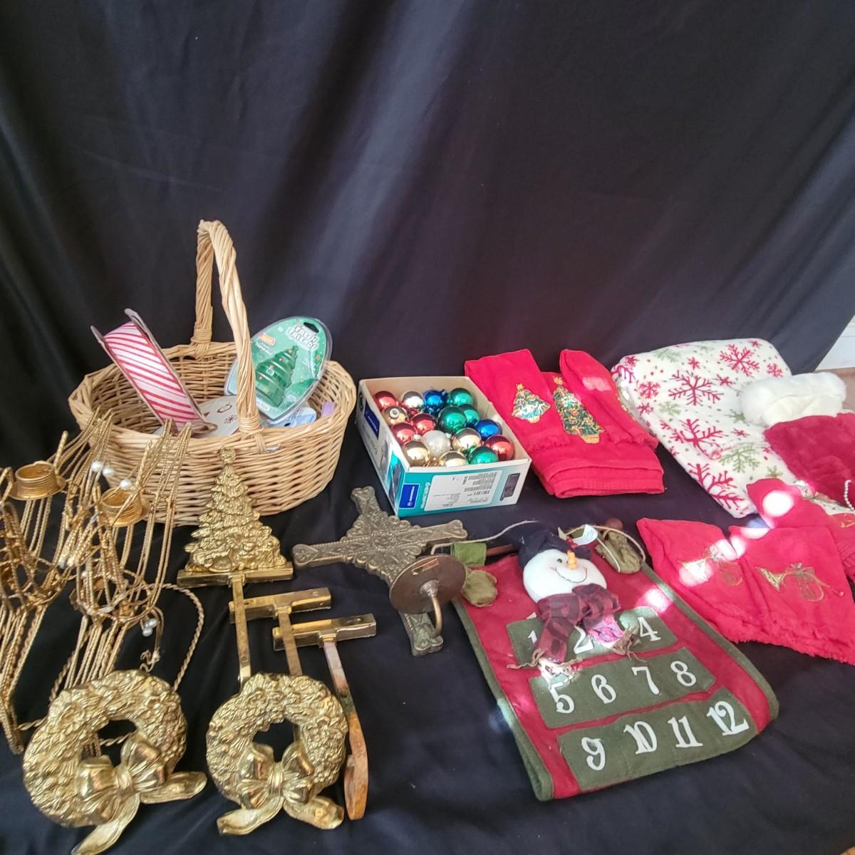 A variety of items for various holidays. Christmas items include ornaments, ribbon, reindeer candle holders, stocking hangers and more. Fall items includes working lights, ceramic plates and mugs, table runners and other assorted fall linens. Local pickup only