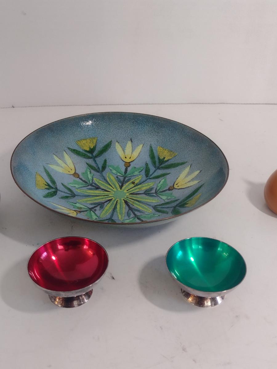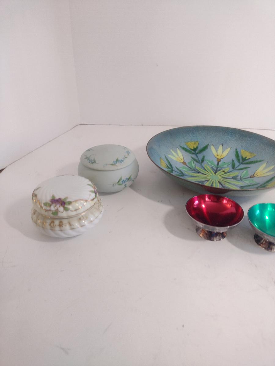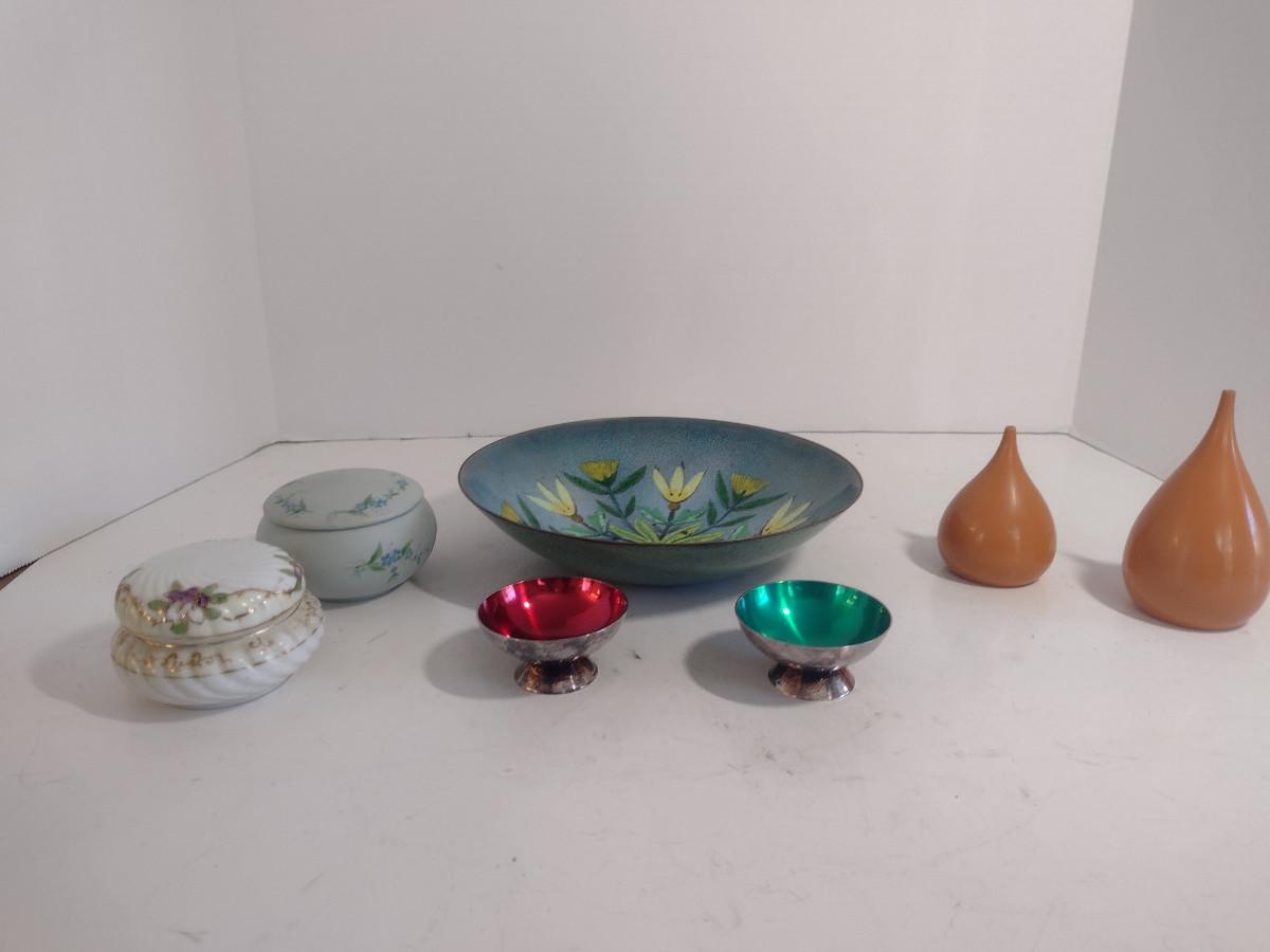 Assorted Home Decor Items- Enameled Bowls, Japanese Salt & Pepper Shakers (Decor #7). One trinket box has slight chip on rim.