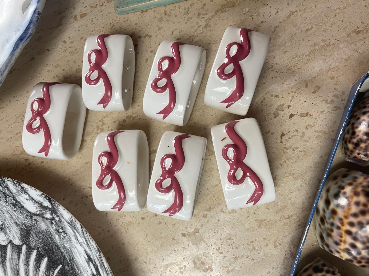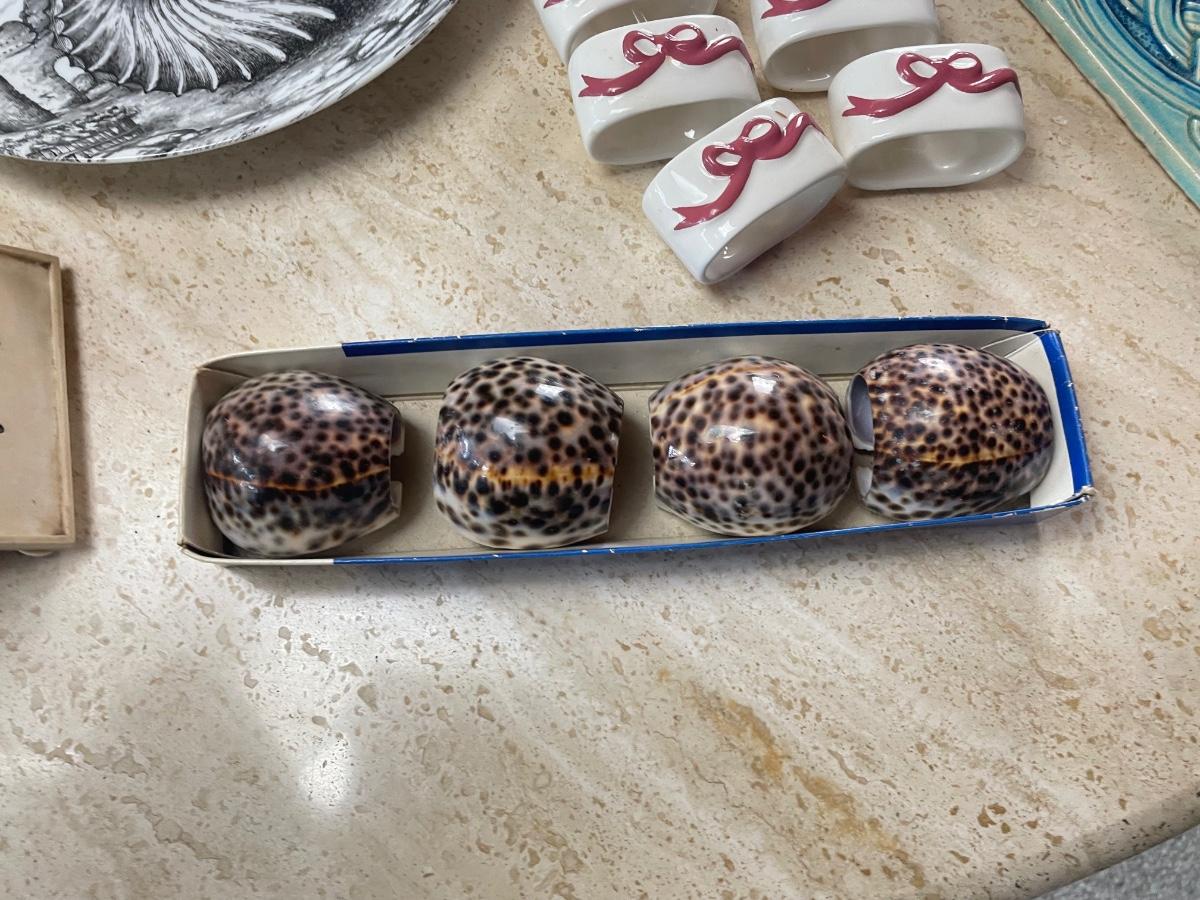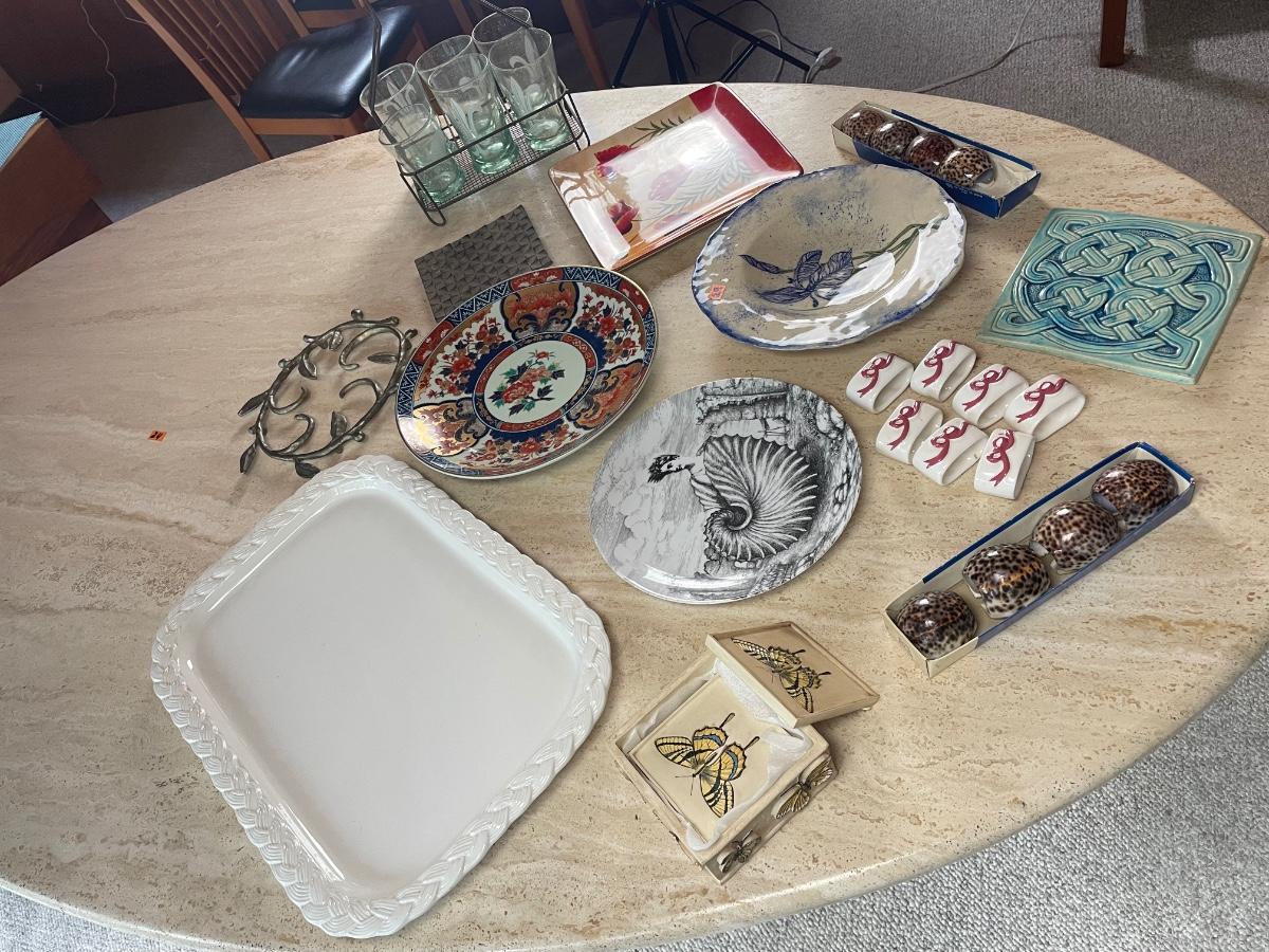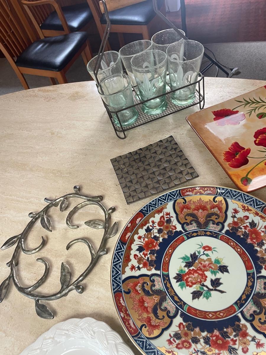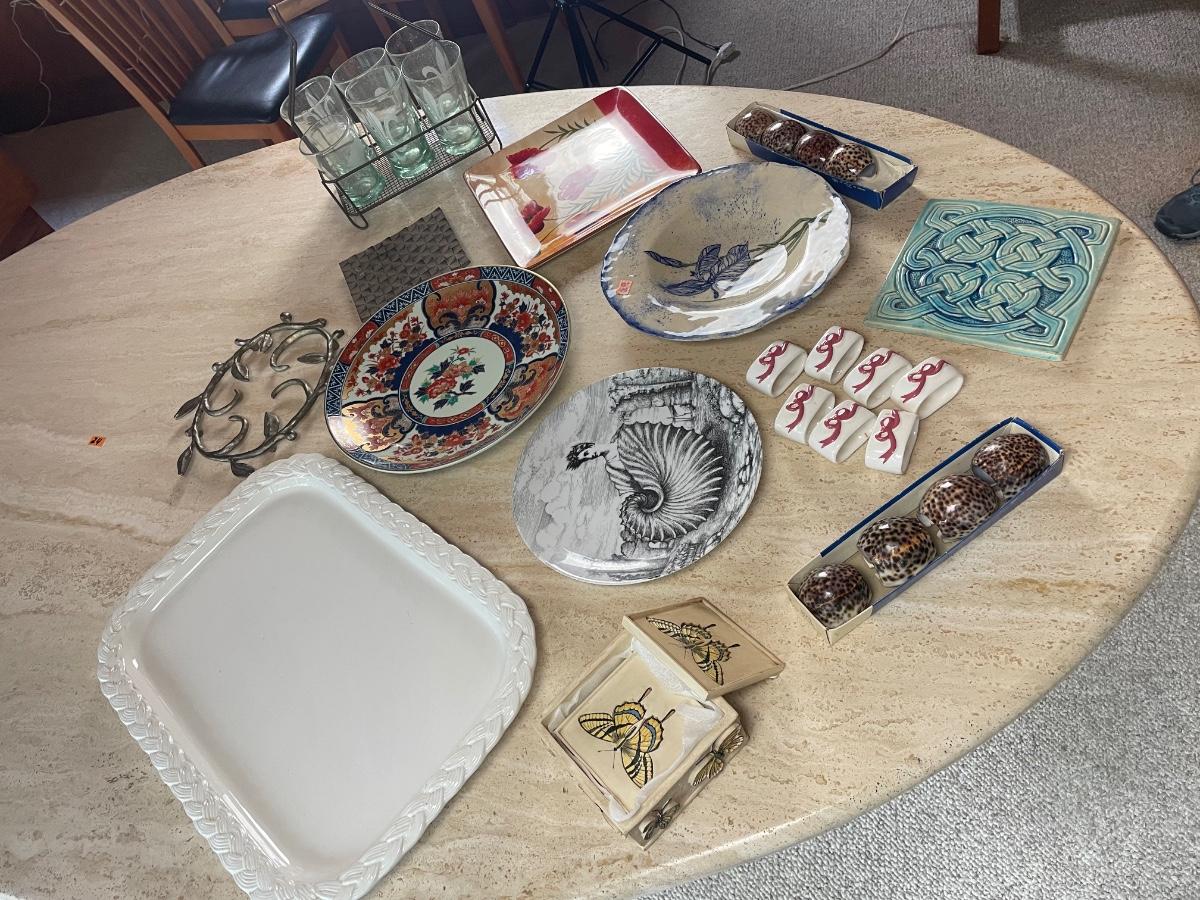 Trivets, plates, 6 glasses in holder, shell napkin rings, platter, and more!