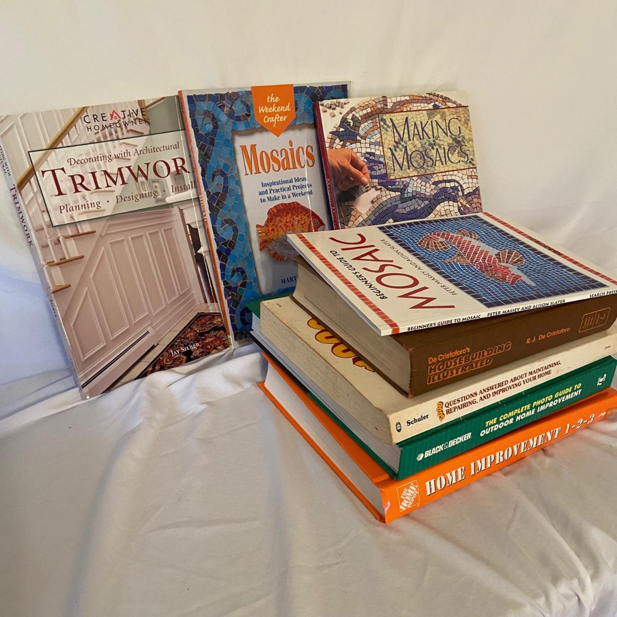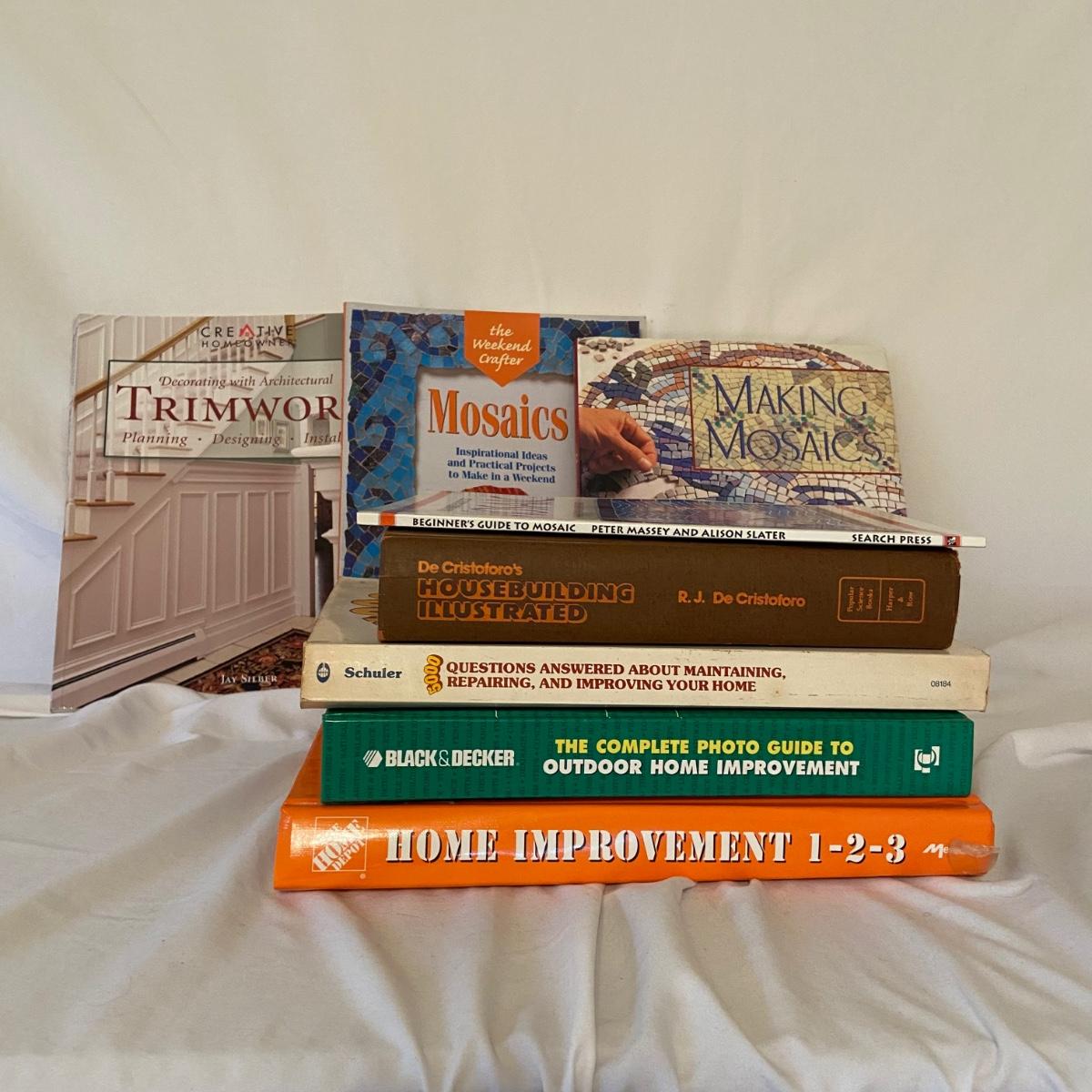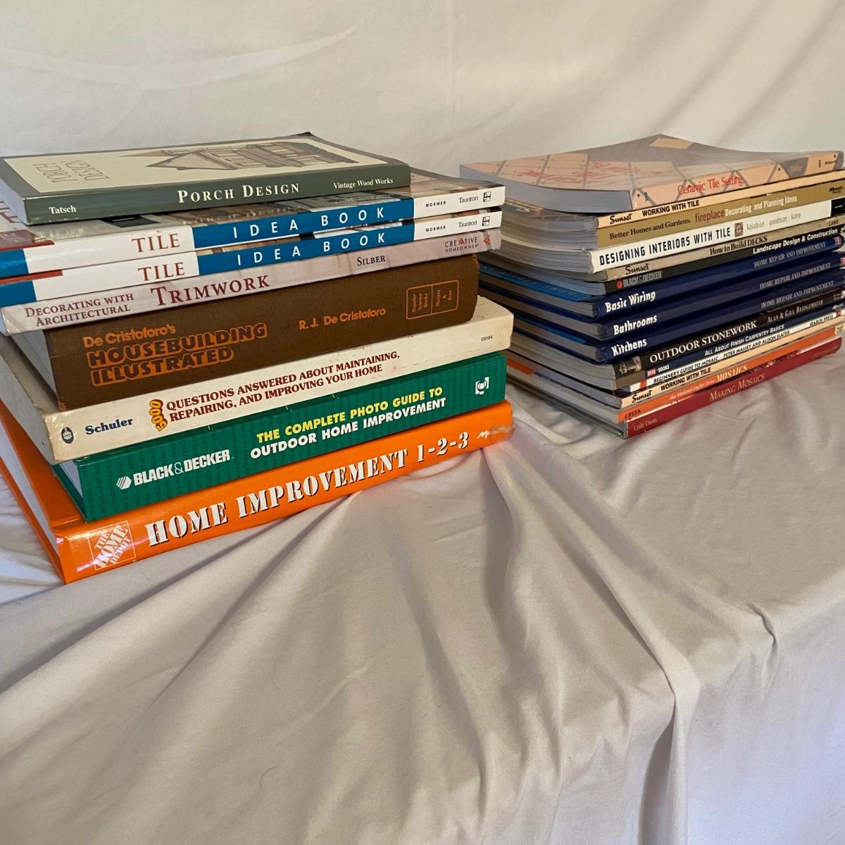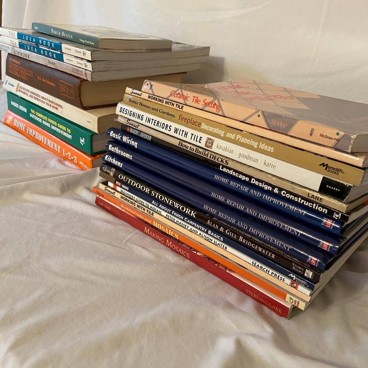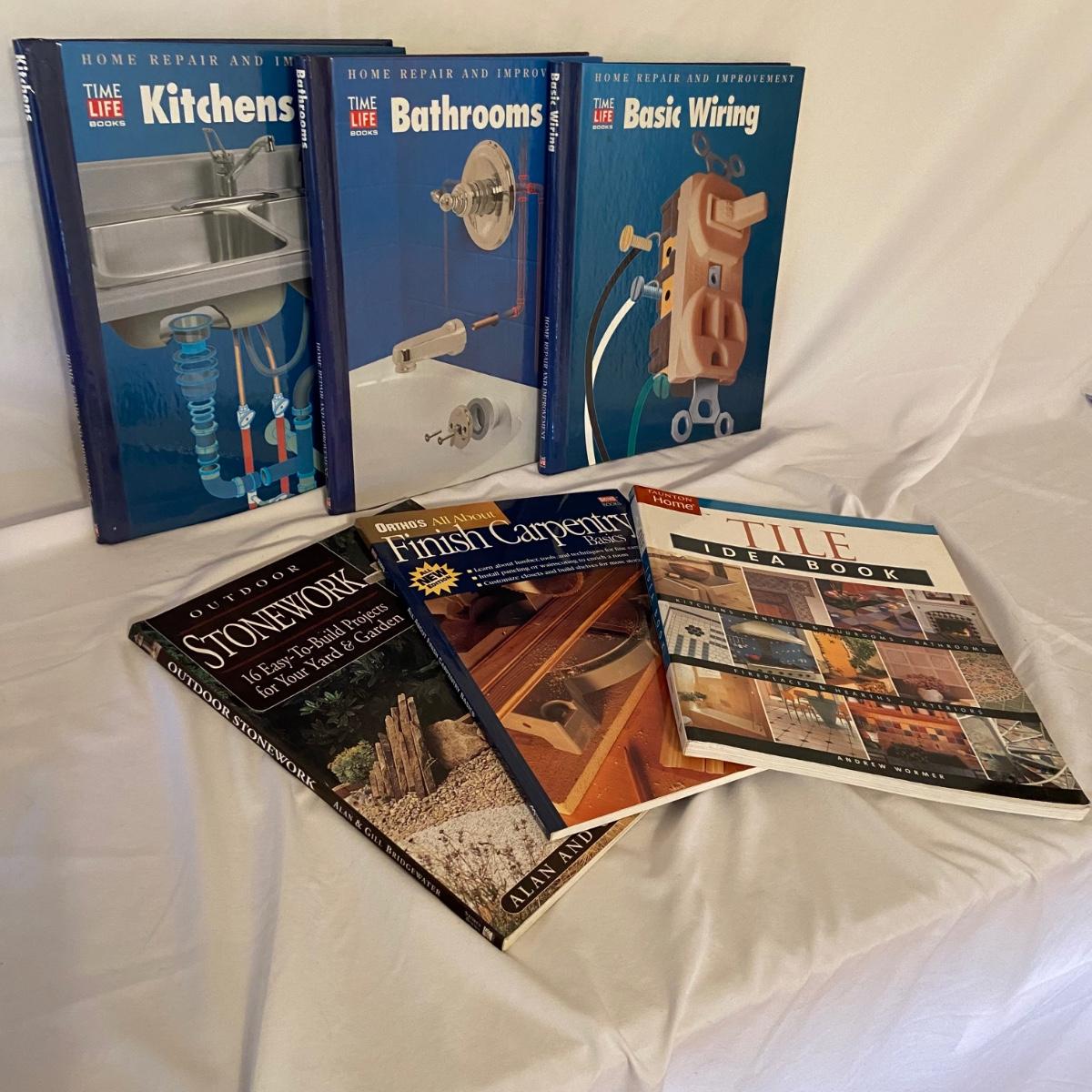 This lot includes a total of 23 assorted home improvement hard and paperback books. Topics include but are not limited to repairs, outdoor and indoor home improvements, bathrooms, kitchens, basic wiring, tiles and mosaics. See pictures for titles. Shipping available.
