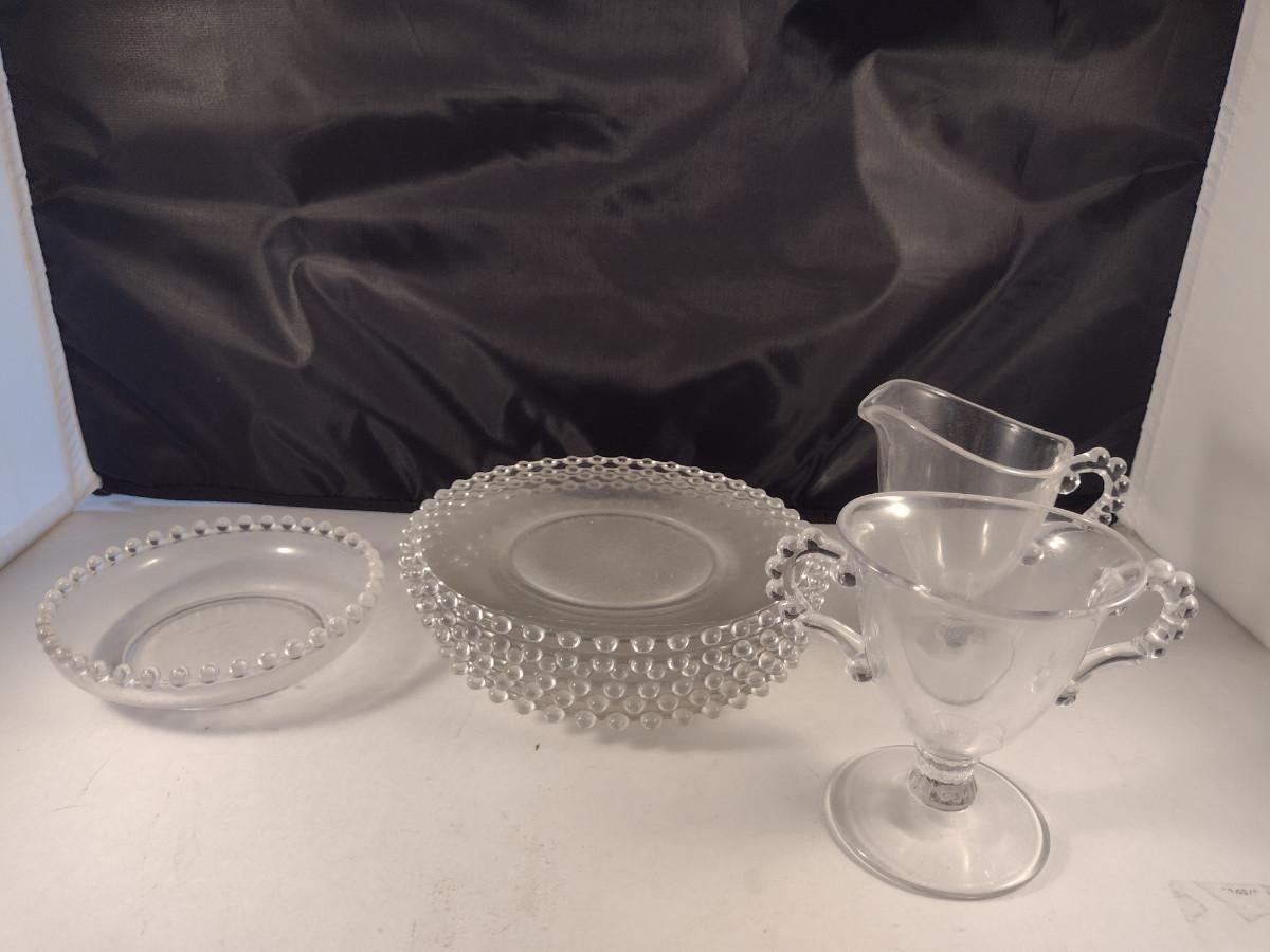 Assorted Imperial Candlewick Glassware. Items are in used condition with marking and hazing.