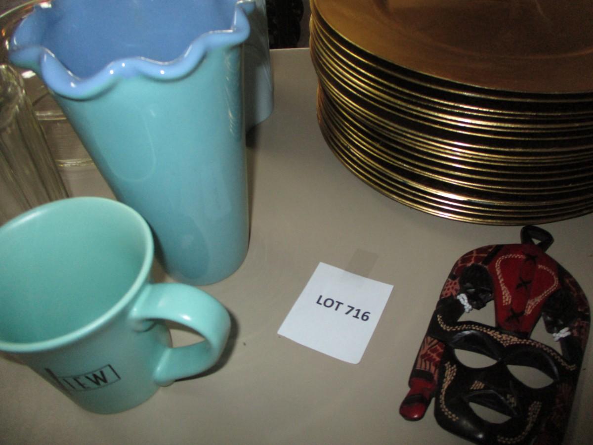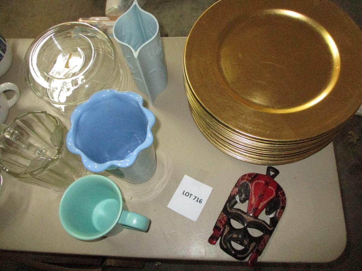 Gold chargers, Vases. Small wooden cultural mask, Holiday