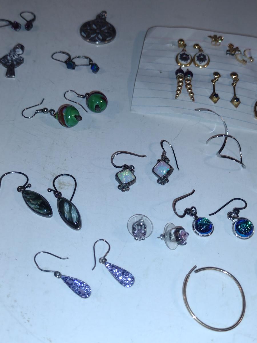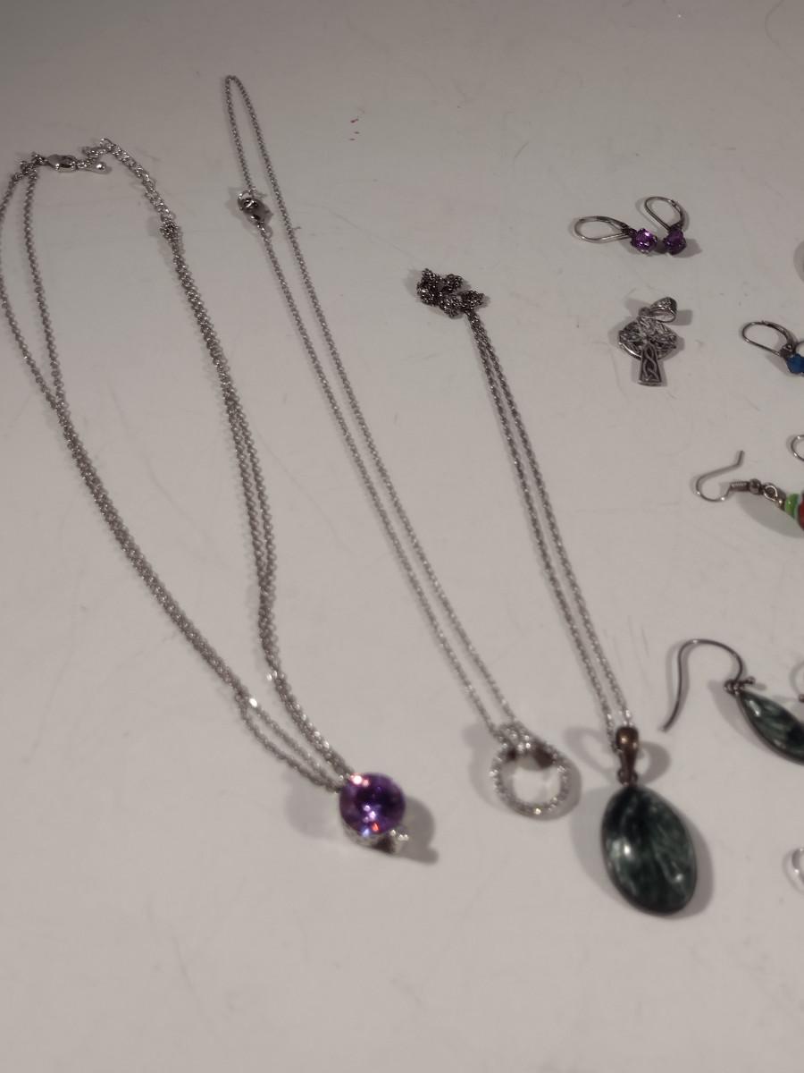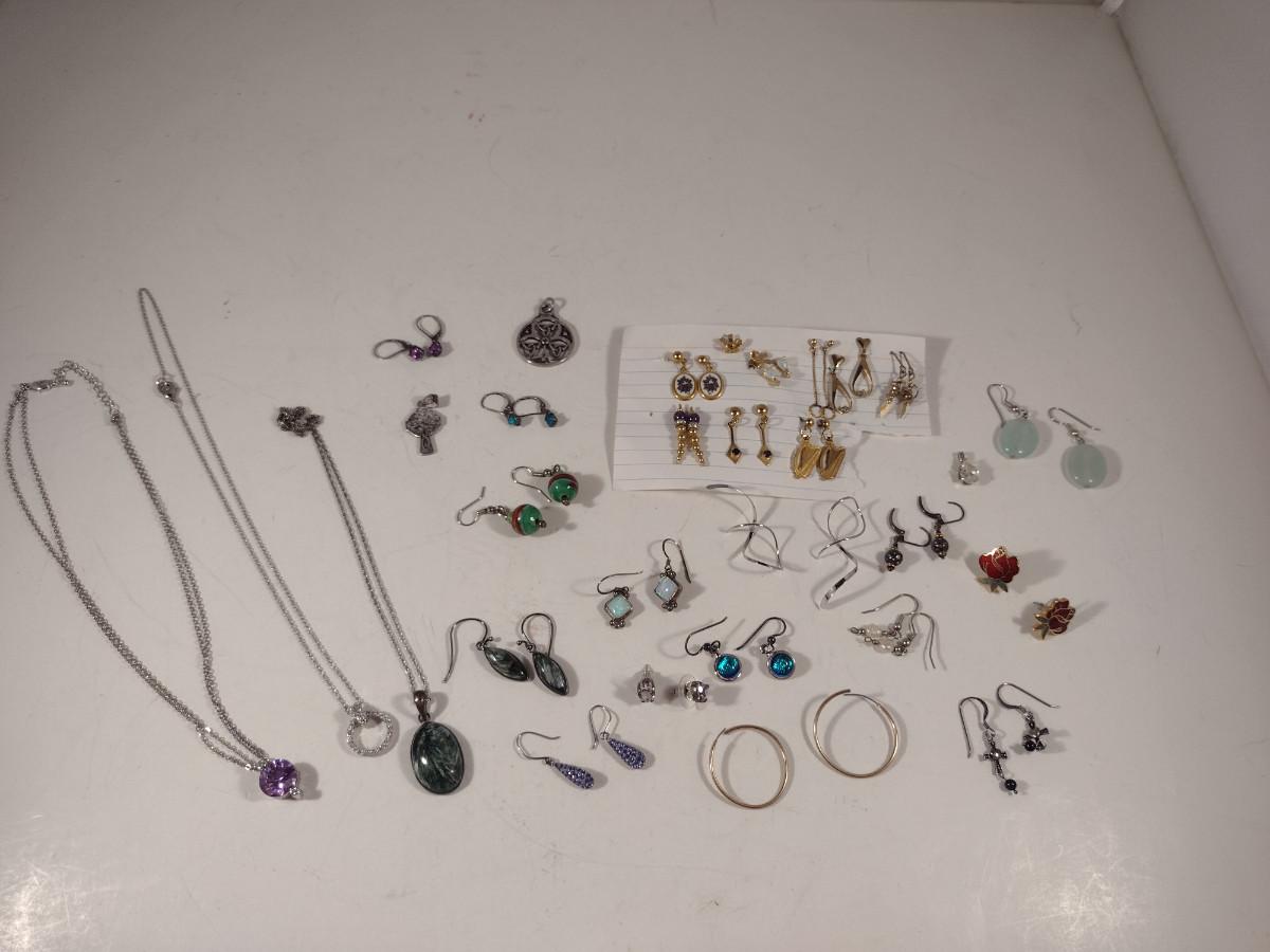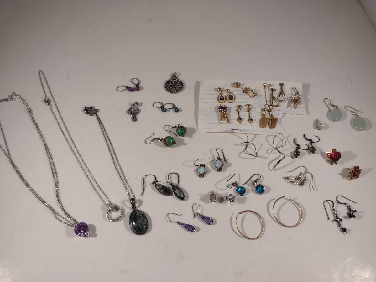 Assorted Jewelry- Earrings, Pendants, Necklaces (#11). Some pieces are sterling silver.