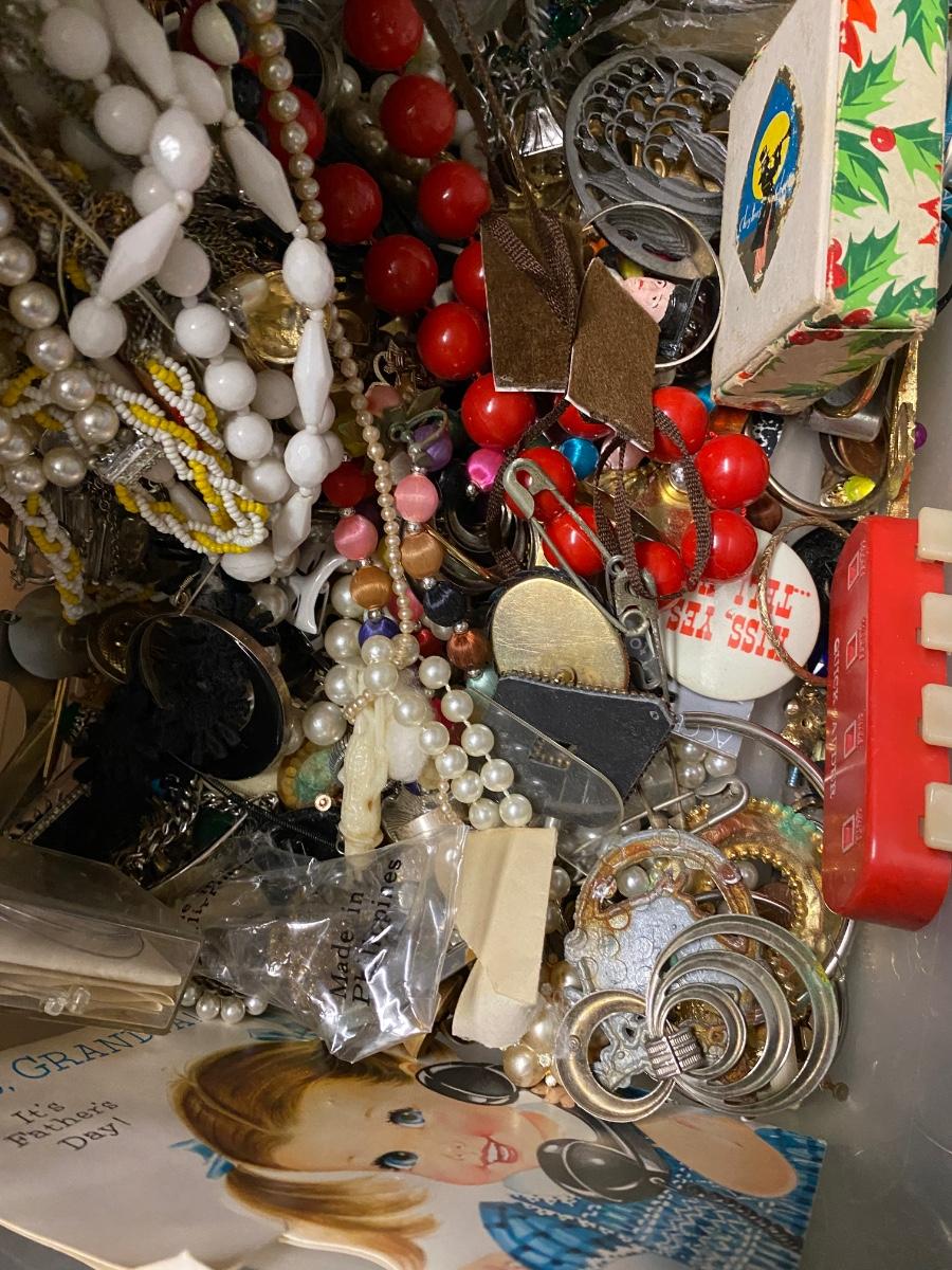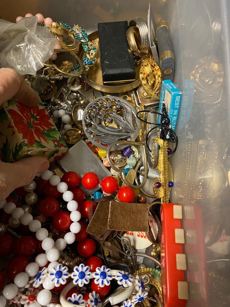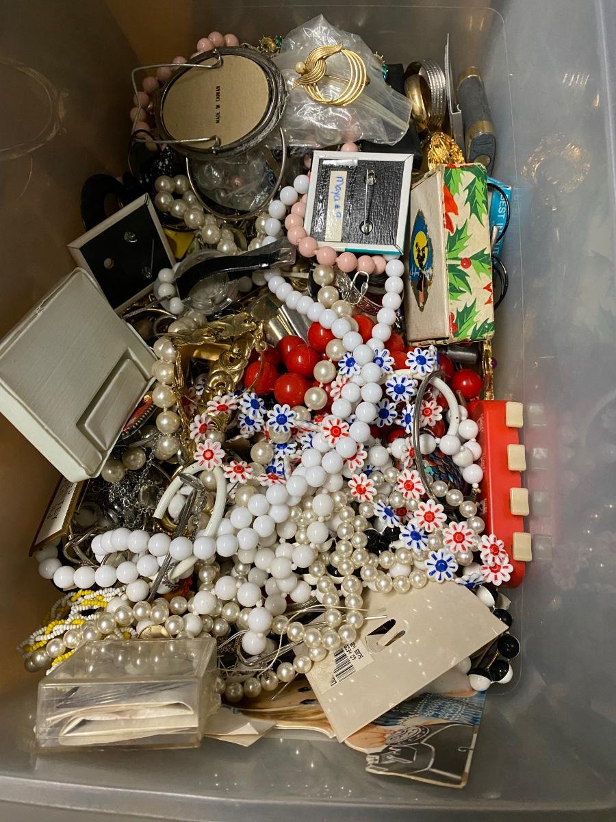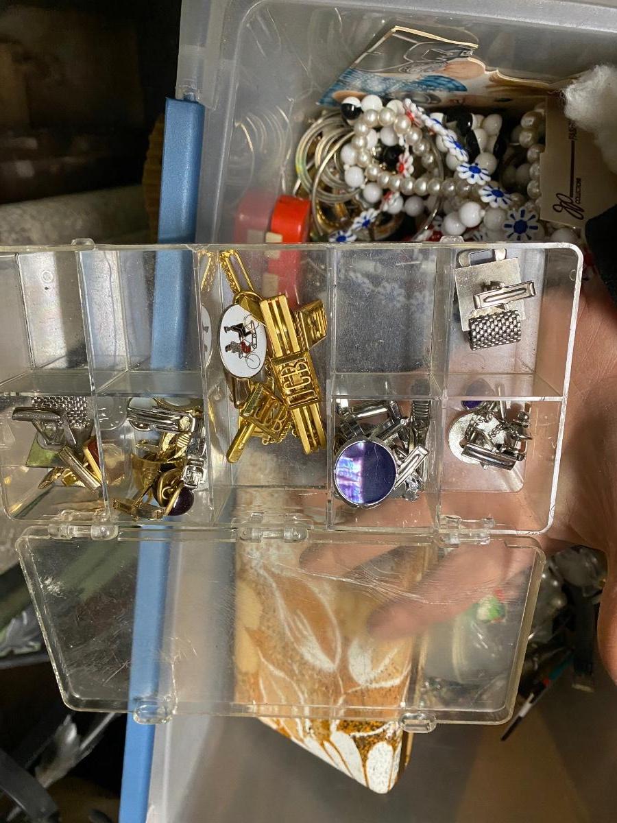 Box of assorted jewelry items, including cufflinks and small post earrings. MIght be some pleasant surprises!