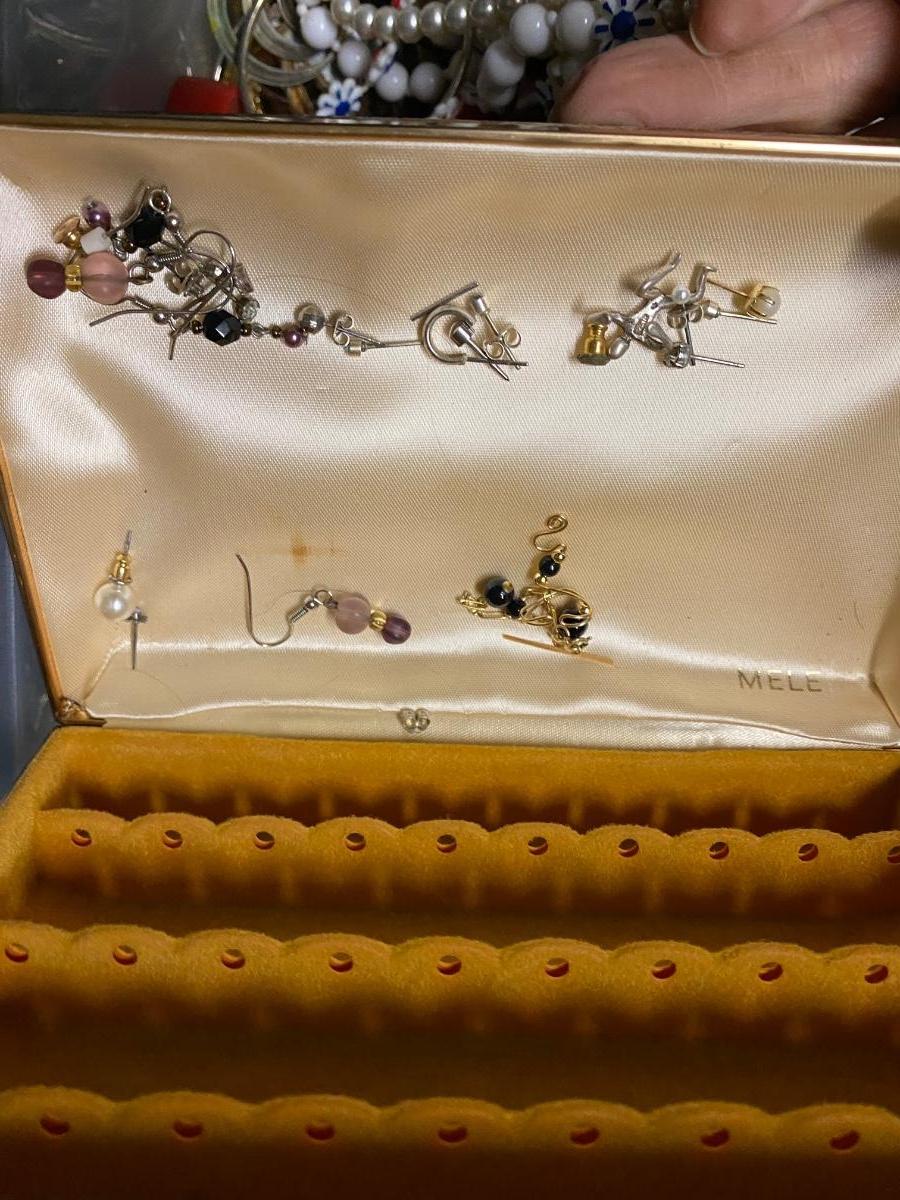 Box of assorted jewelry items, including cufflinks and small post earrings. MIght be some pleasant surprises!