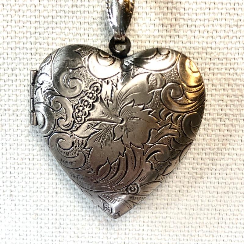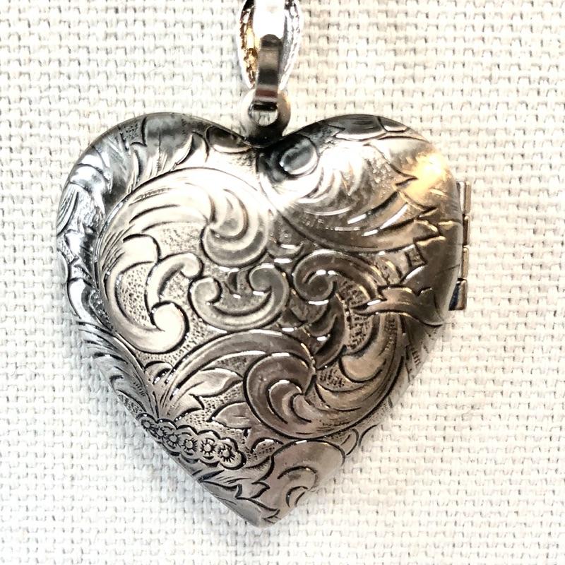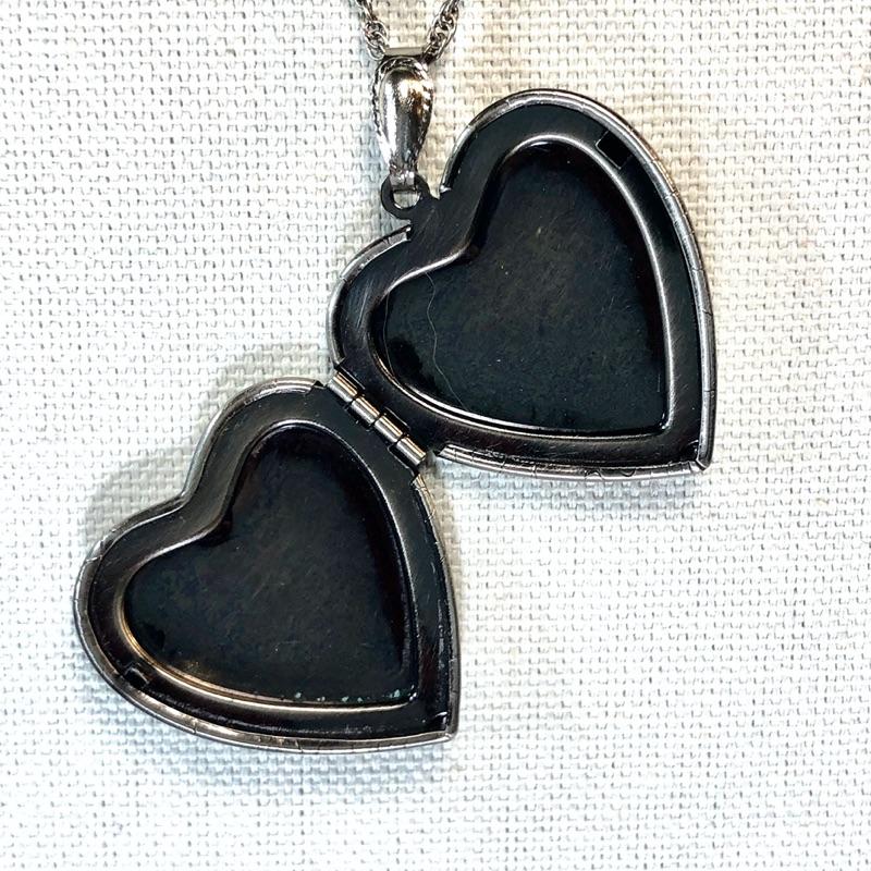 Filigree heart locket hangs on a 24" removable chain. The pendant is hinged on the side and holds two photos. Pewter tone.