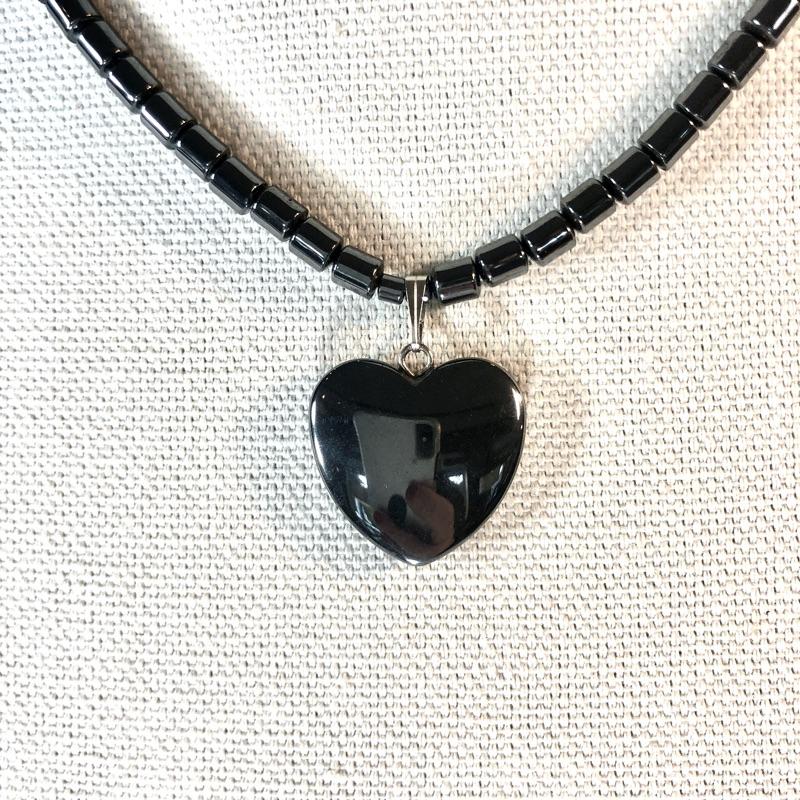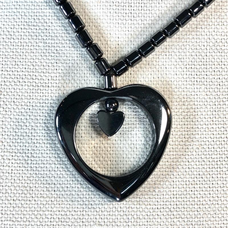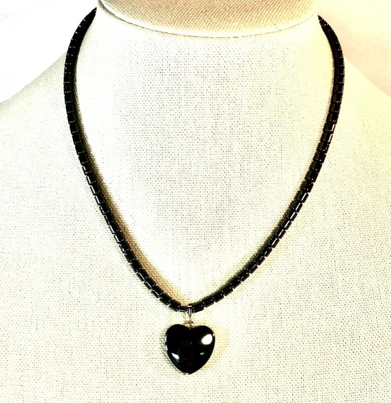 String of beaded stones with fixed heart pendants. Screw clasps and each is about 18" long, end to end. I believe the stones are real (hematite?) as they are very cold to the touch.
