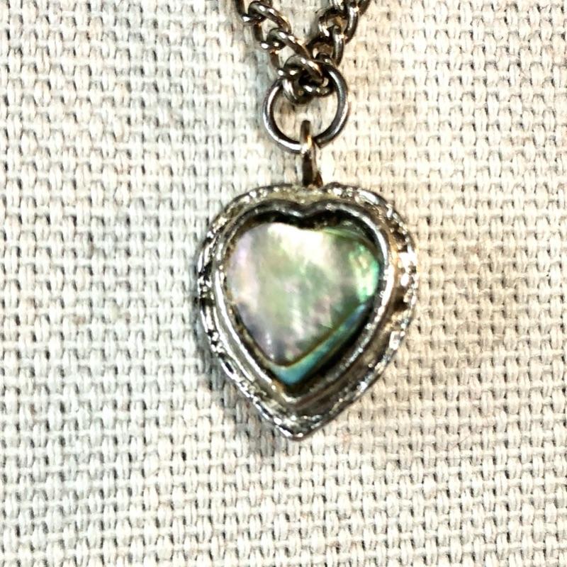 Inlay heart is neckalce is pewter tone with what looks like abalone. It has the folded hinge clasp and measures 20" long