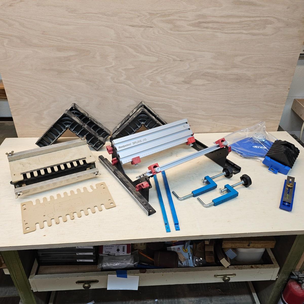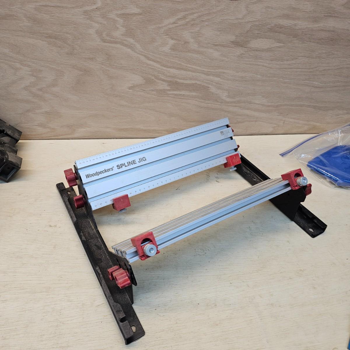 Angle jigs, corner fixtures, dovetail templates and more. A spline jig by Woodpeckers, measures 17" x 14" x 5.5"H. Dovetail fixture by Craftsman has multiple templates, measures 11" x 7" x 4"H. Four hard plastic Clamp-It assembly squares by Rockler, each 8" x 8" x 1.5"H. Also includes a Kreg corner routing set. See photos for details. Shipping available.