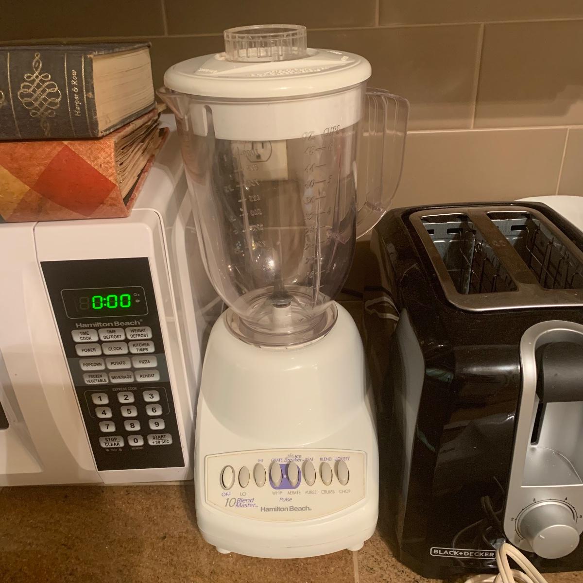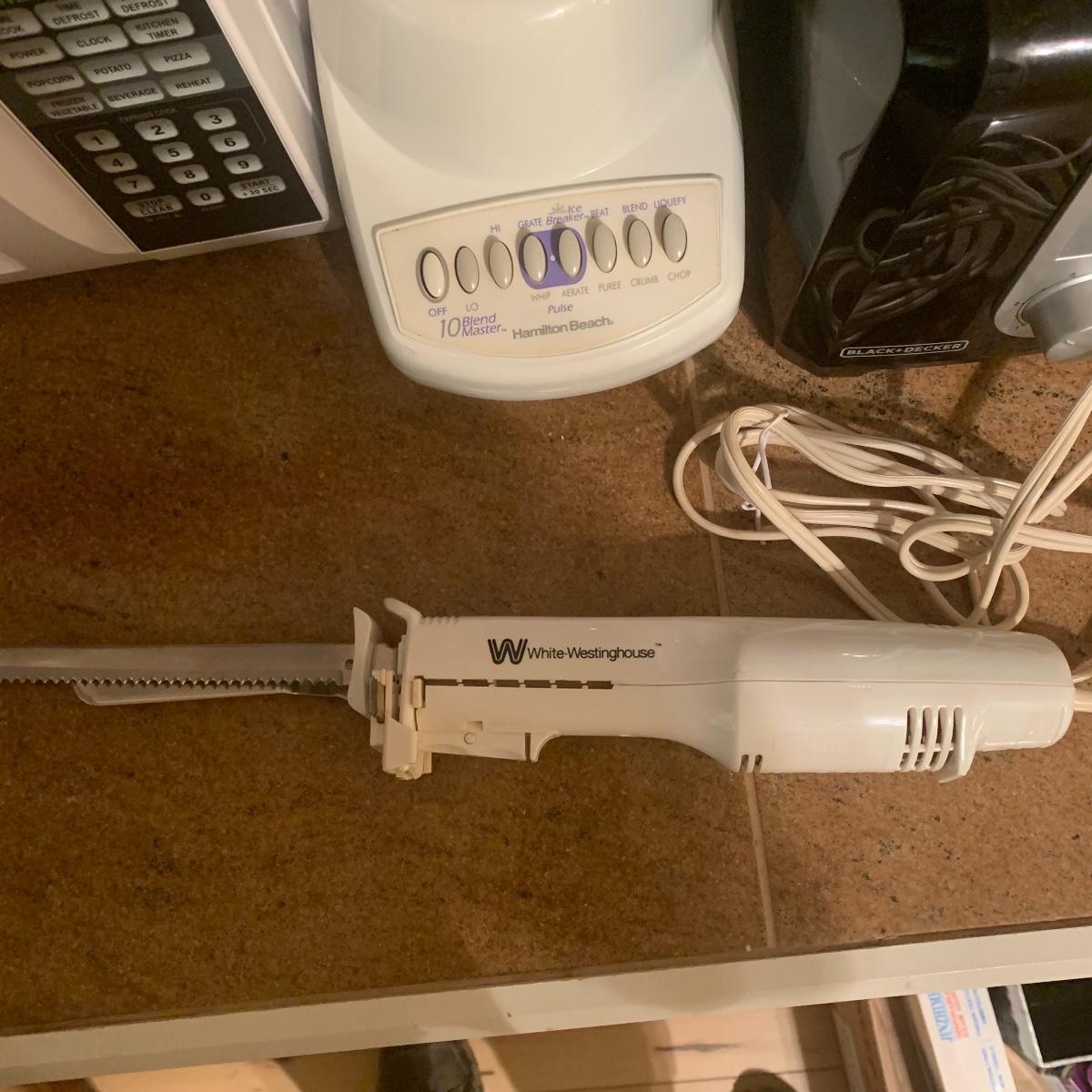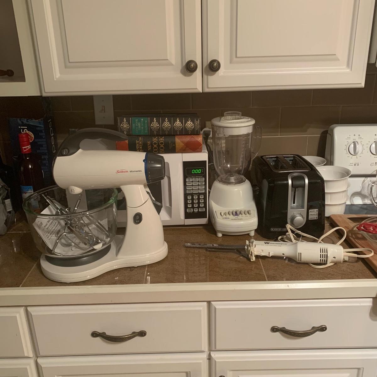 This group of kitchen appliances includes, a sunbeam mix master, a Hamilton Beach microwave, and blender, a Black and Decker toaster, a Westing house electric carving knife, and two vintage cookbooks. All appliances are in good condition. Local pickup only.