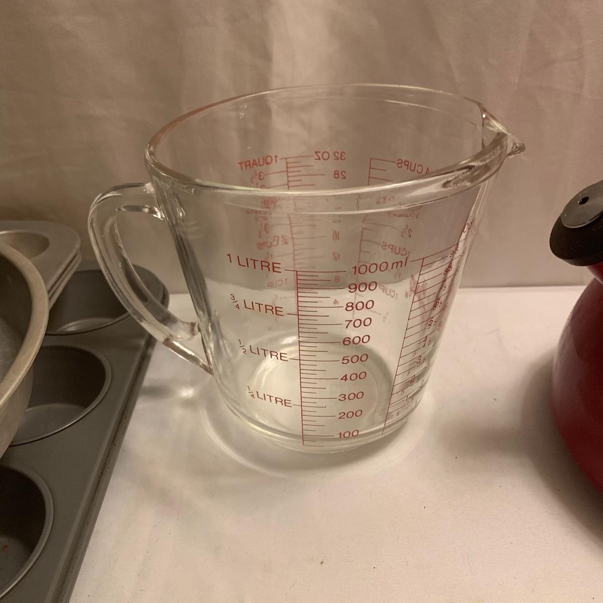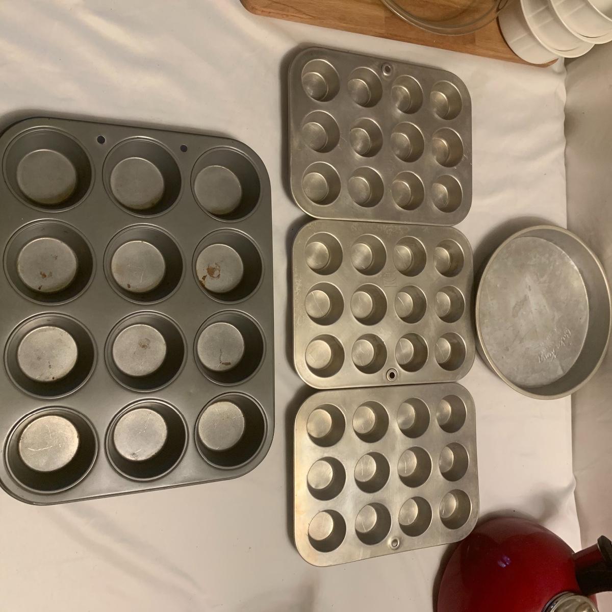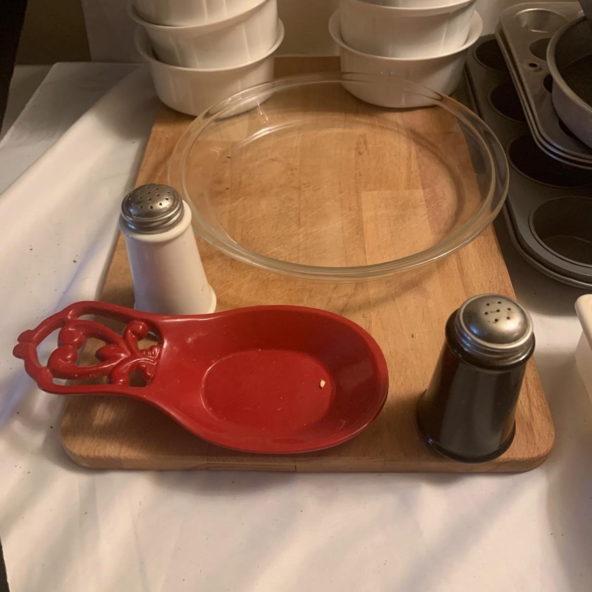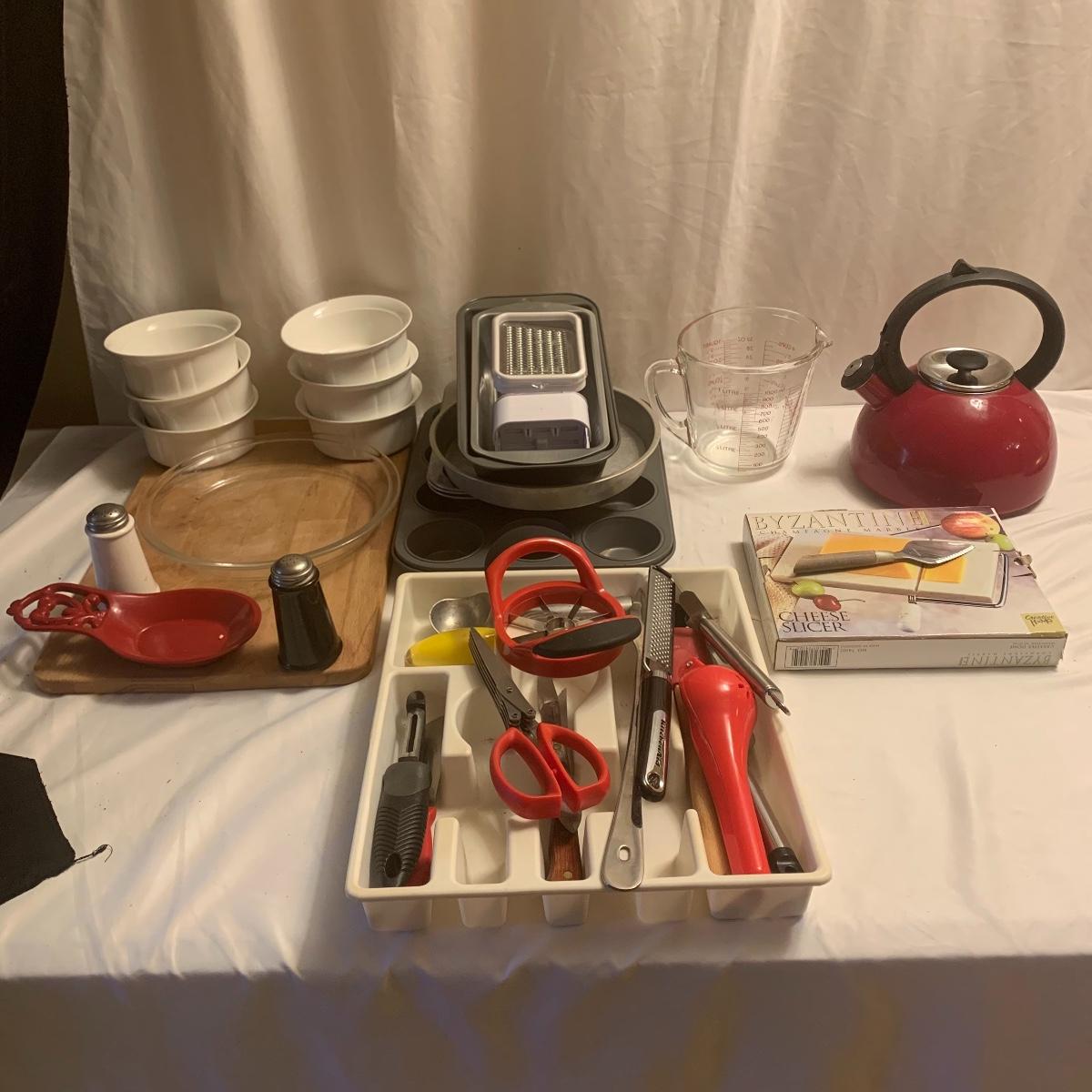 This group of assorted kitchen items includes a cutting board, bread and muffin trays, a tea pot, a large mixing cup, numerous utensils, and a set of six soup bowls ( a few have tiny chips).
