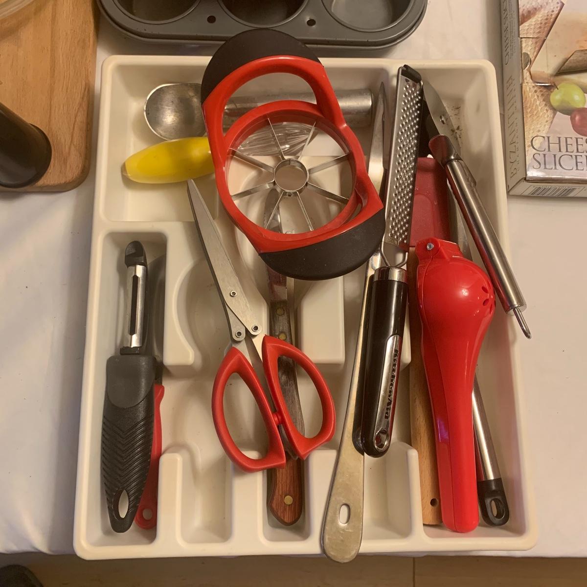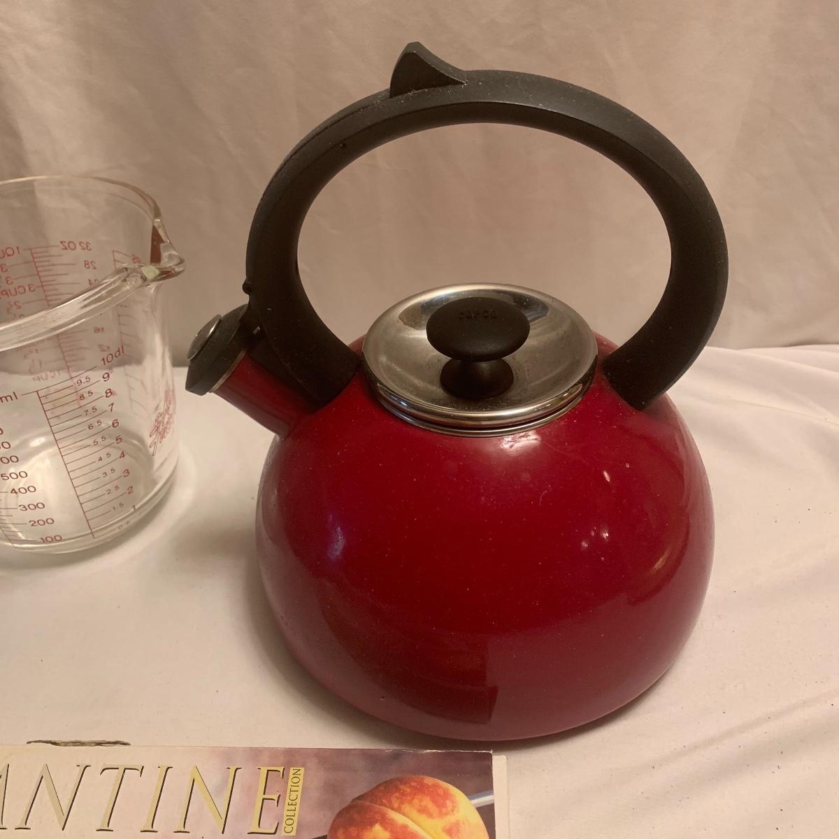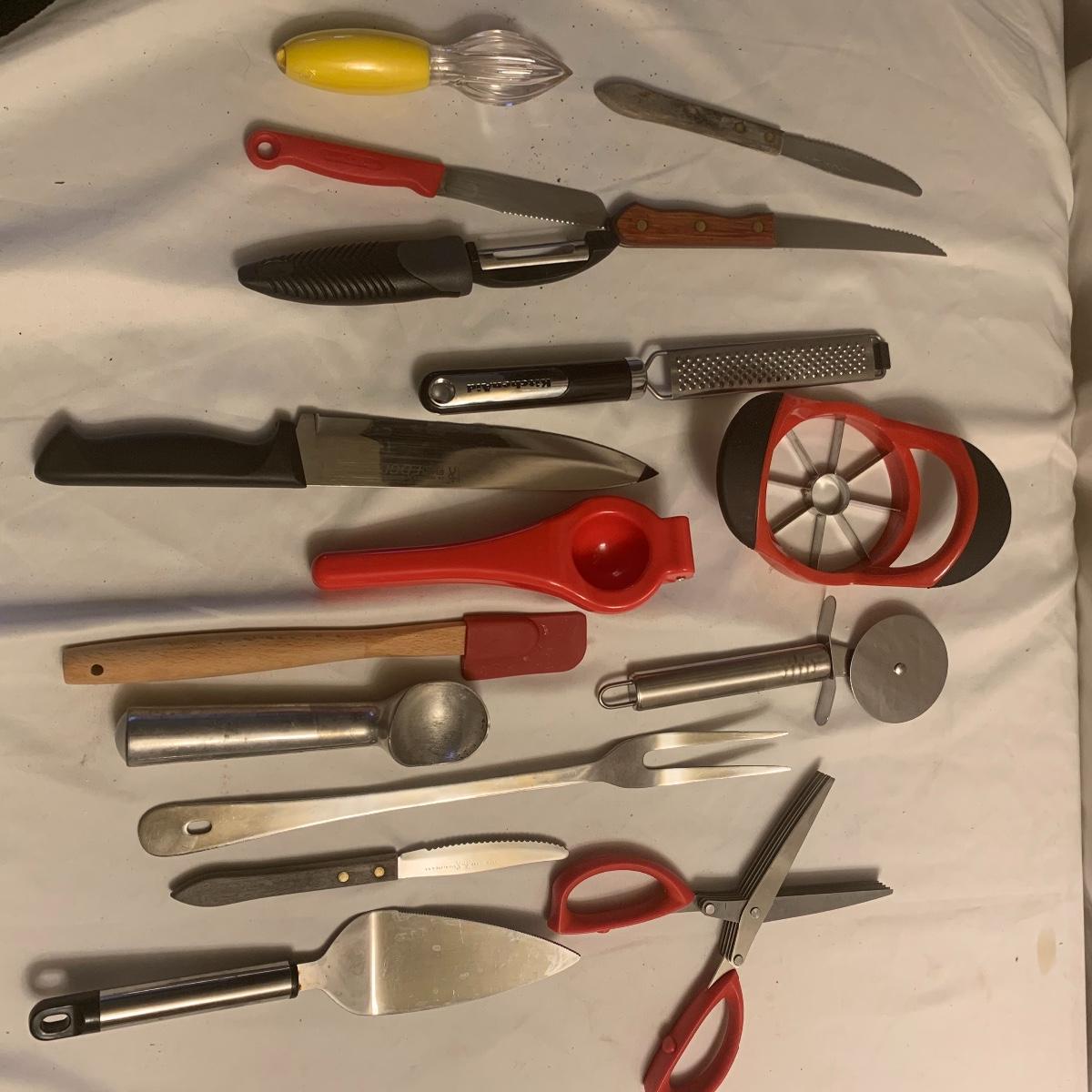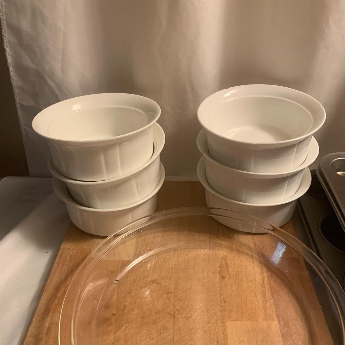 This group of assorted kitchen items includes a cutting board, bread and muffin trays, a tea pot, a large mixing cup, numerous utensils, and a set of six soup bowls ( a few have tiny chips).