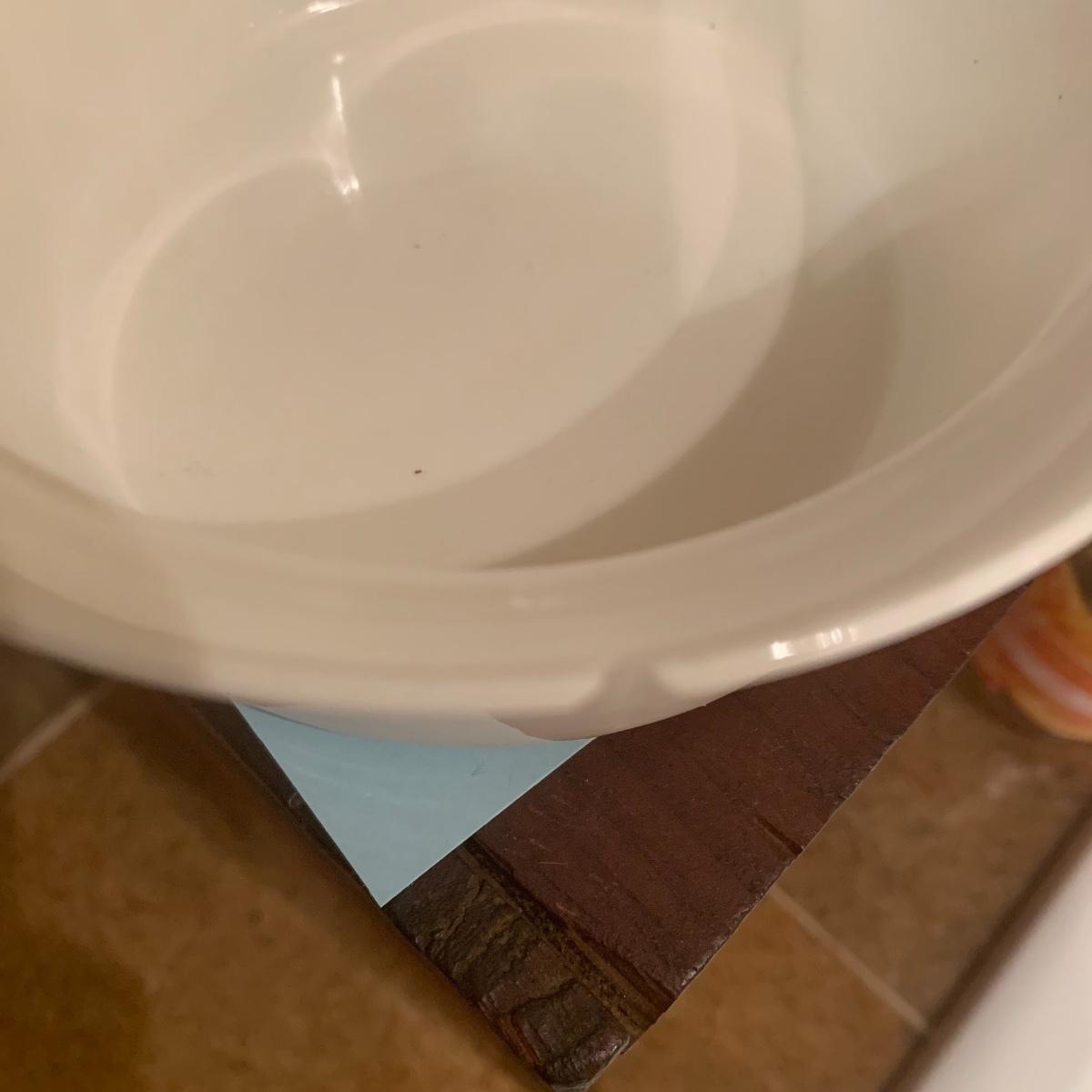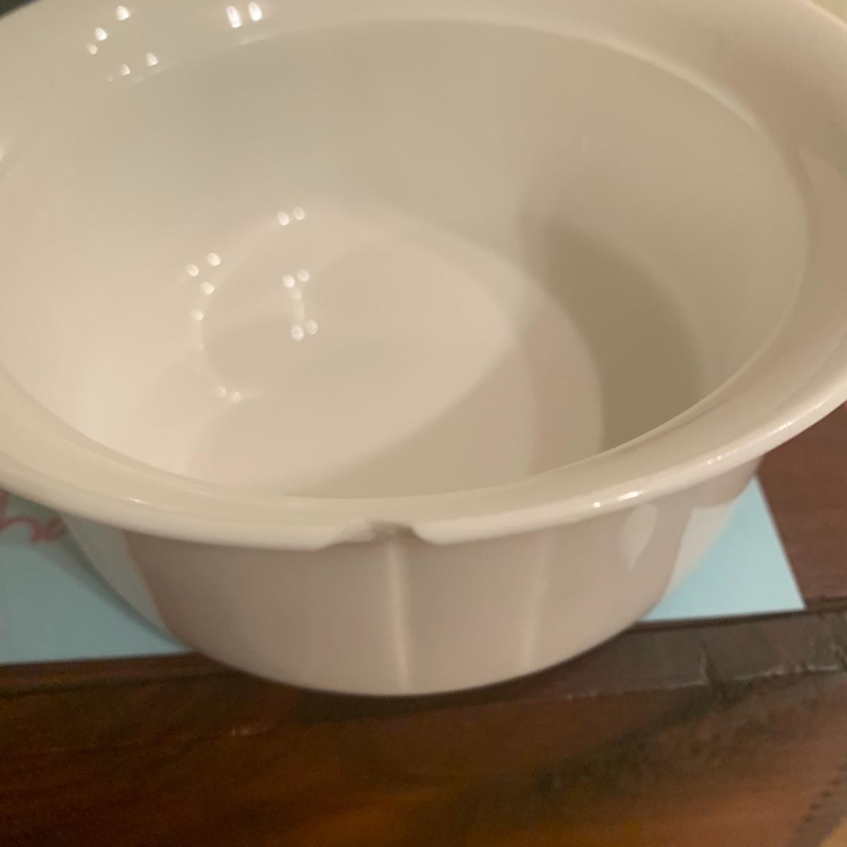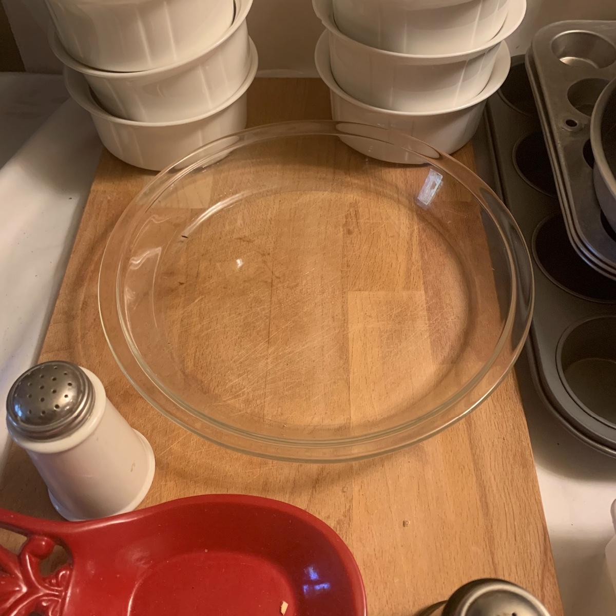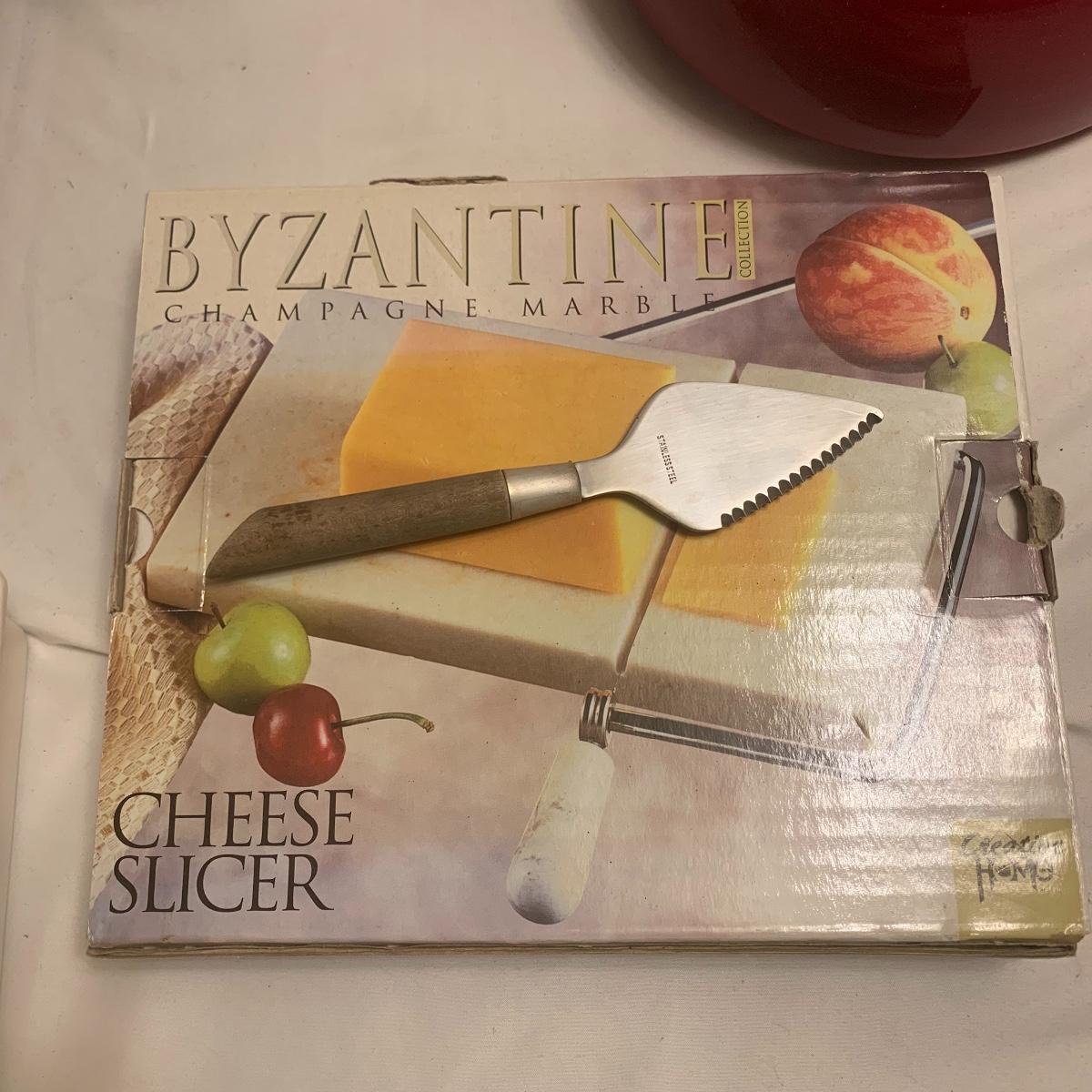 This group of assorted kitchen items includes a cutting board, bread and muffin trays, a tea pot, a large mixing cup, numerous utensils, and a set of six soup bowls ( a few have tiny chips).