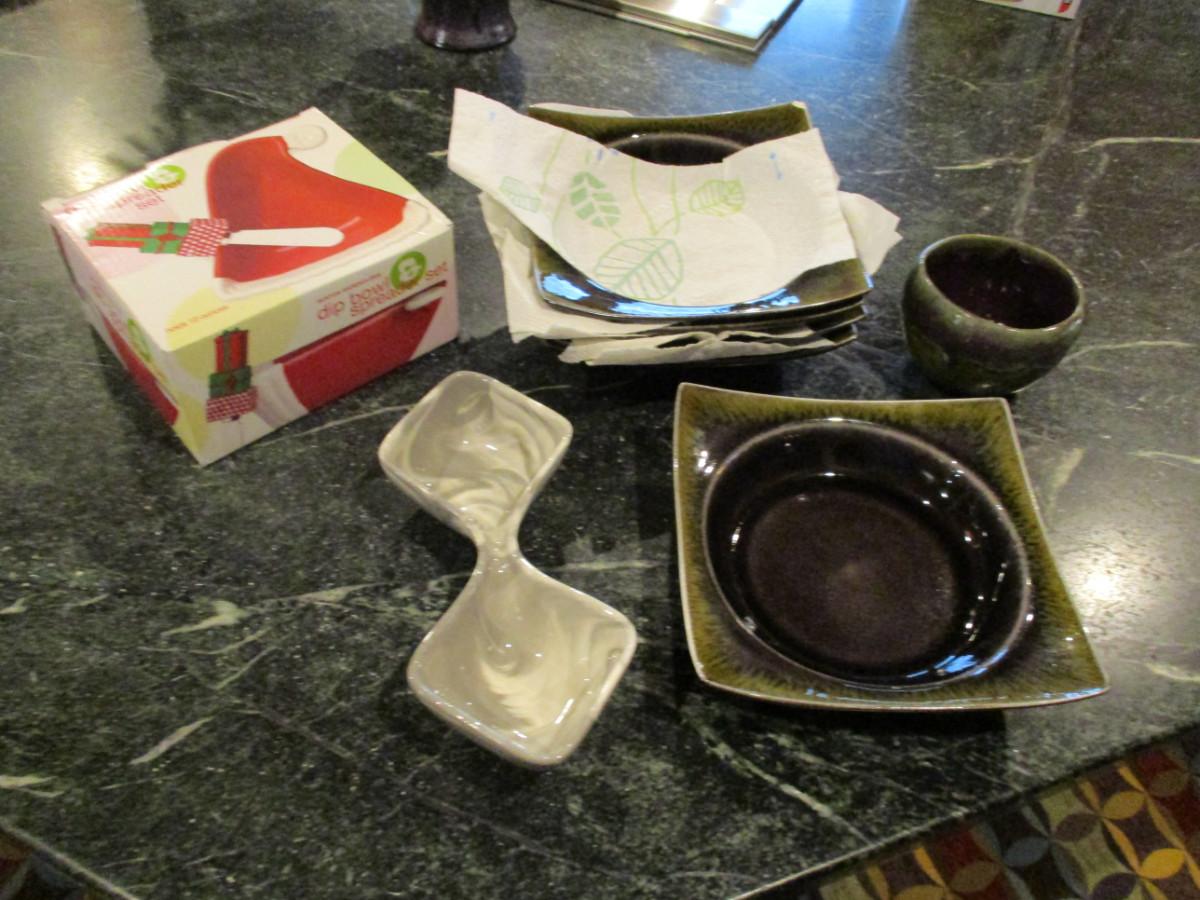 Assorted Kitchen Goods- Stoneware bowls, dip bowl set, relish/olive dish. Please see all pictures.