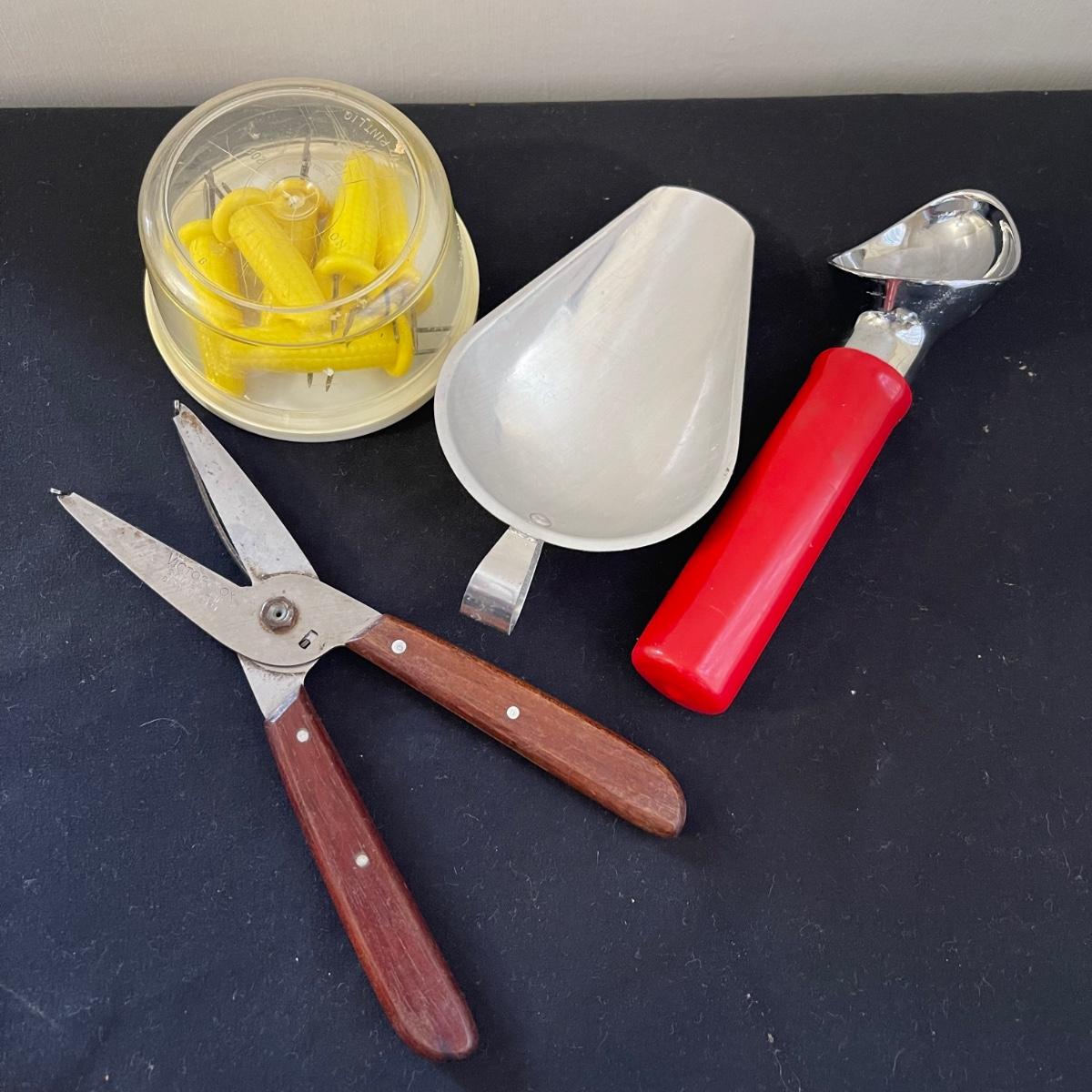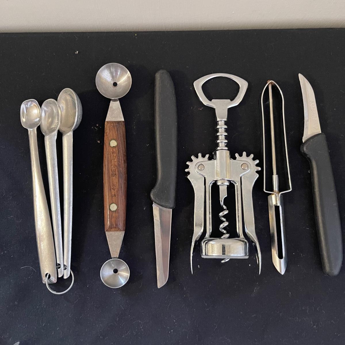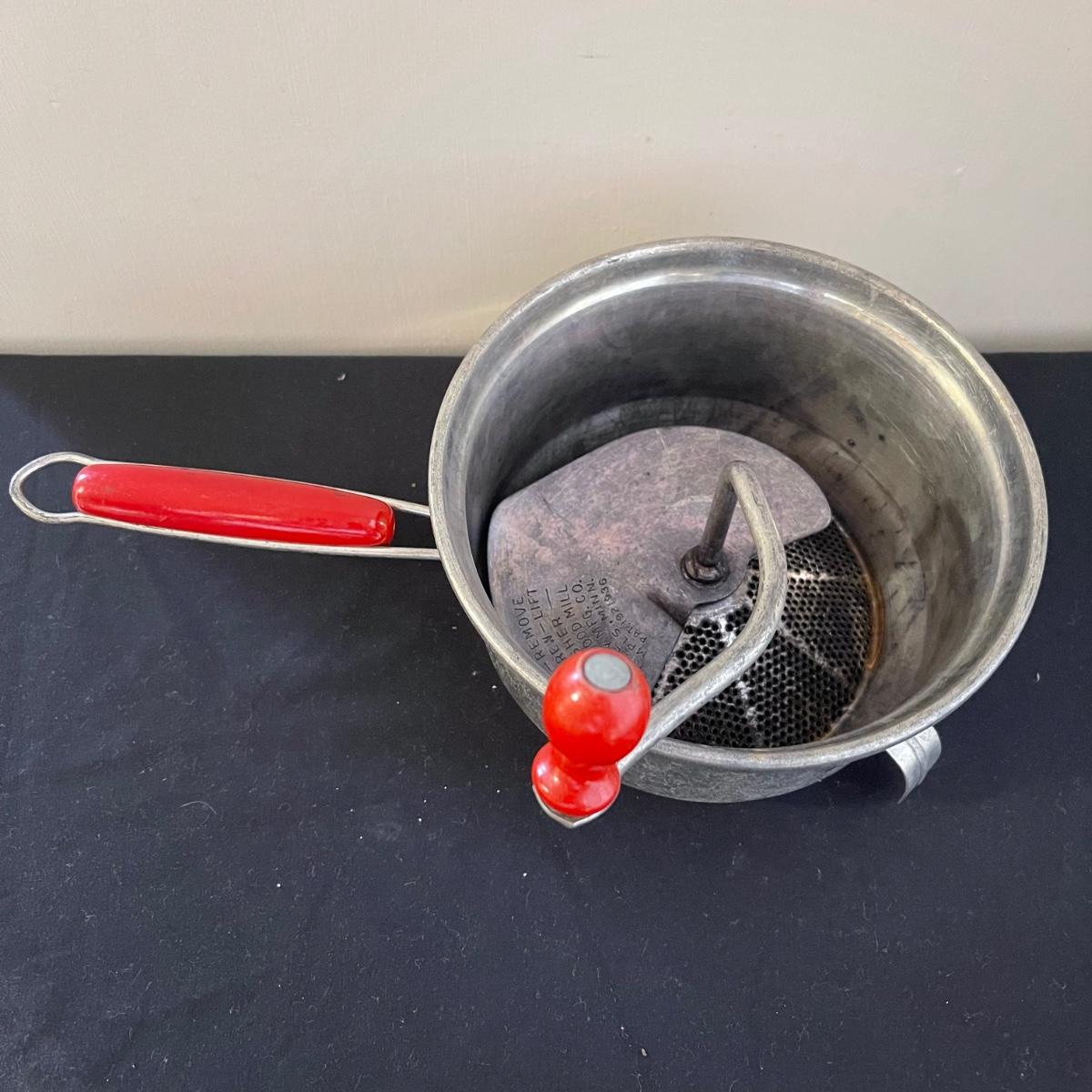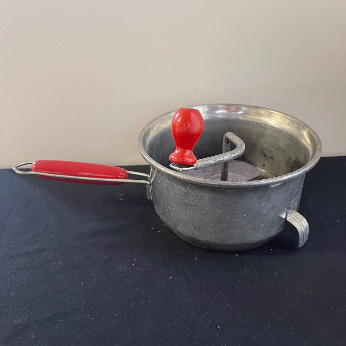 An assorted collection of kitchen items starting with a vintage masher with a crank, a milk glass cake stand, a tin cake cover with an acorn handle, and a 4 cup liquid measuring cup. Smaller items include peelers, pairing knives, measuring cups, and more.