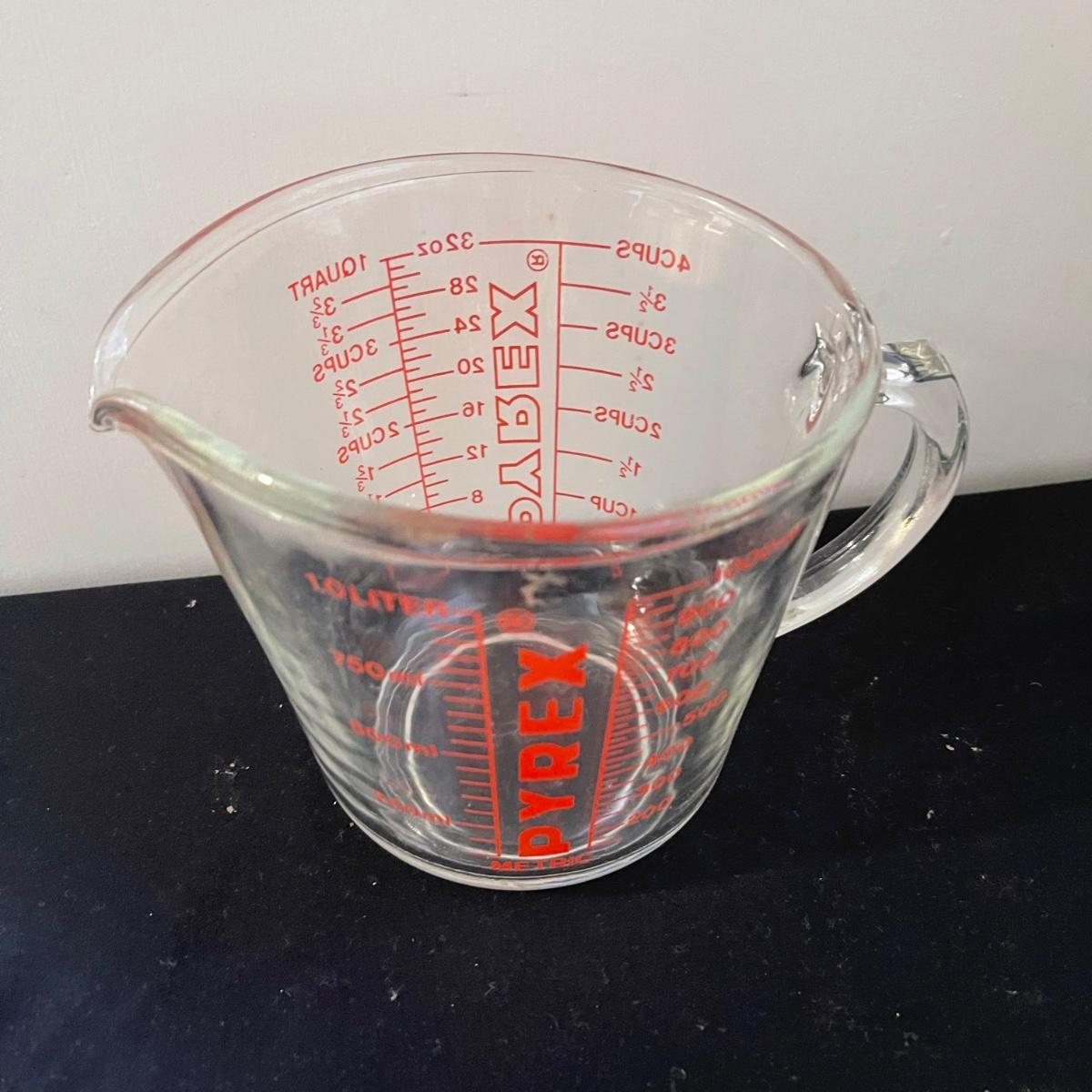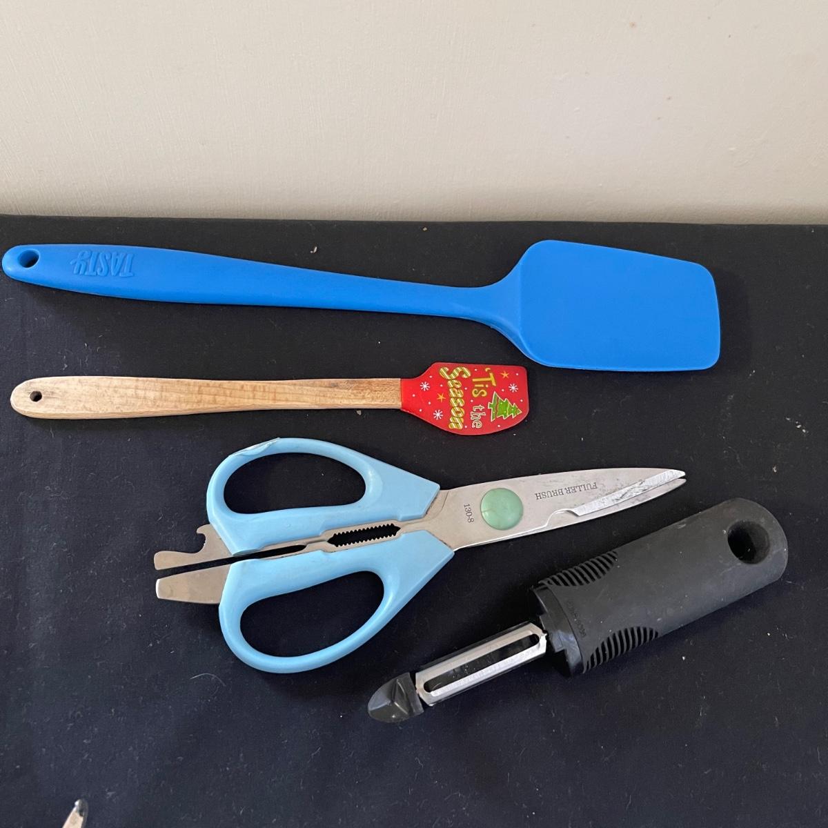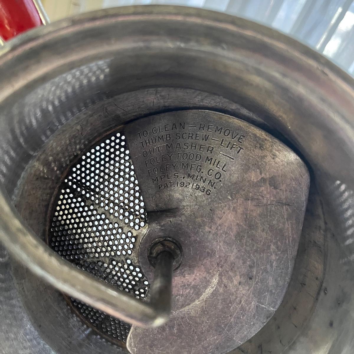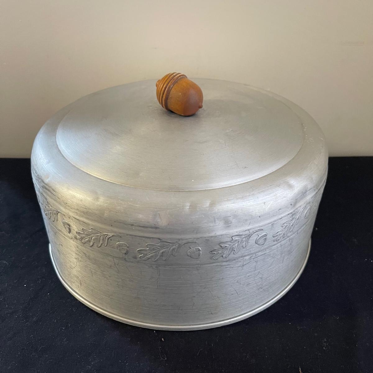 An assorted collection of kitchen items starting with a vintage masher with a crank, a milk glass cake stand, a tin cake cover with an acorn handle, and a 4 cup liquid measuring cup. Smaller items include peelers, pairing knives, measuring cups, and more.