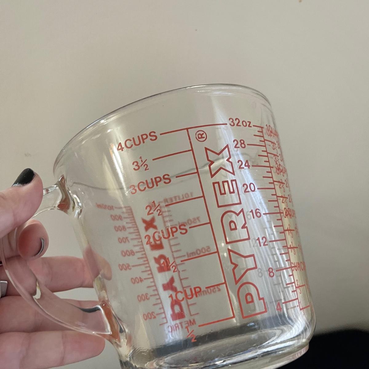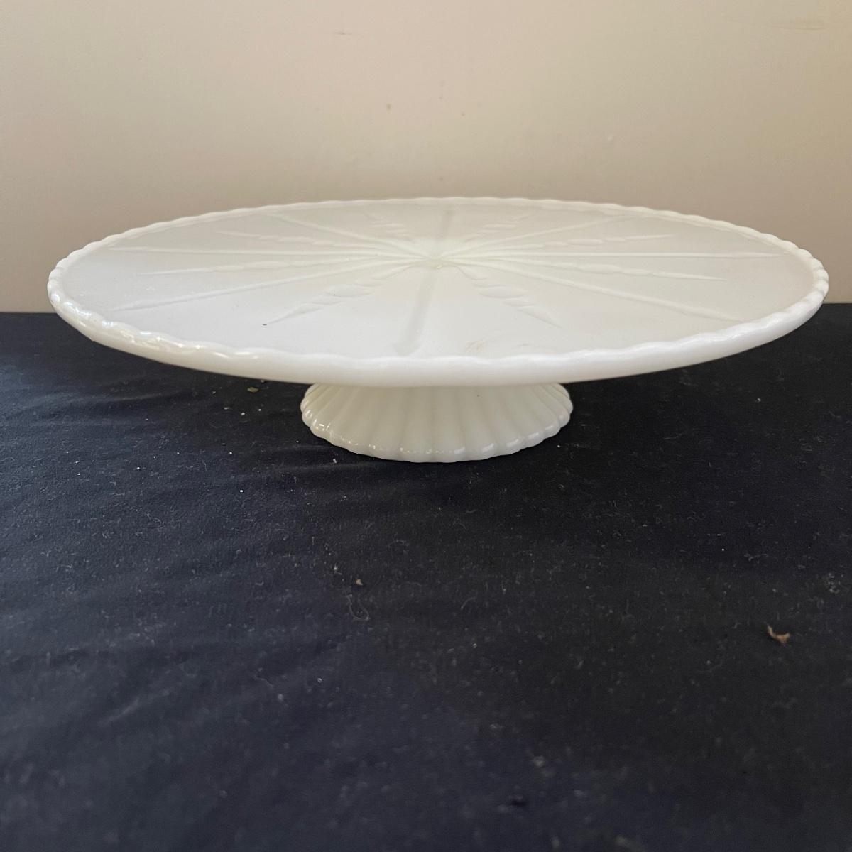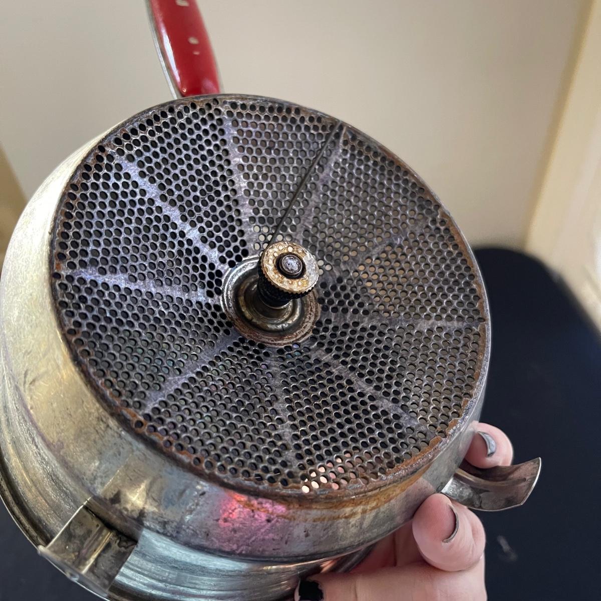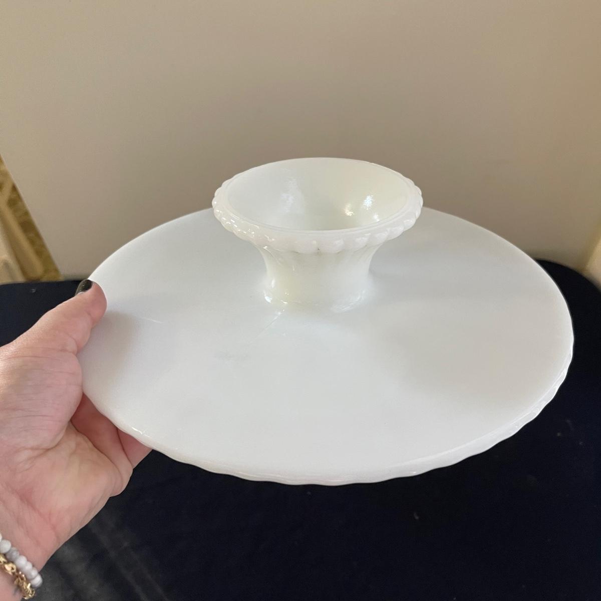 An assorted collection of kitchen items starting with a vintage masher with a crank, a milk glass cake stand, a tin cake cover with an acorn handle, and a 4 cup liquid measuring cup. Smaller items include peelers, pairing knives, measuring cups, and more.