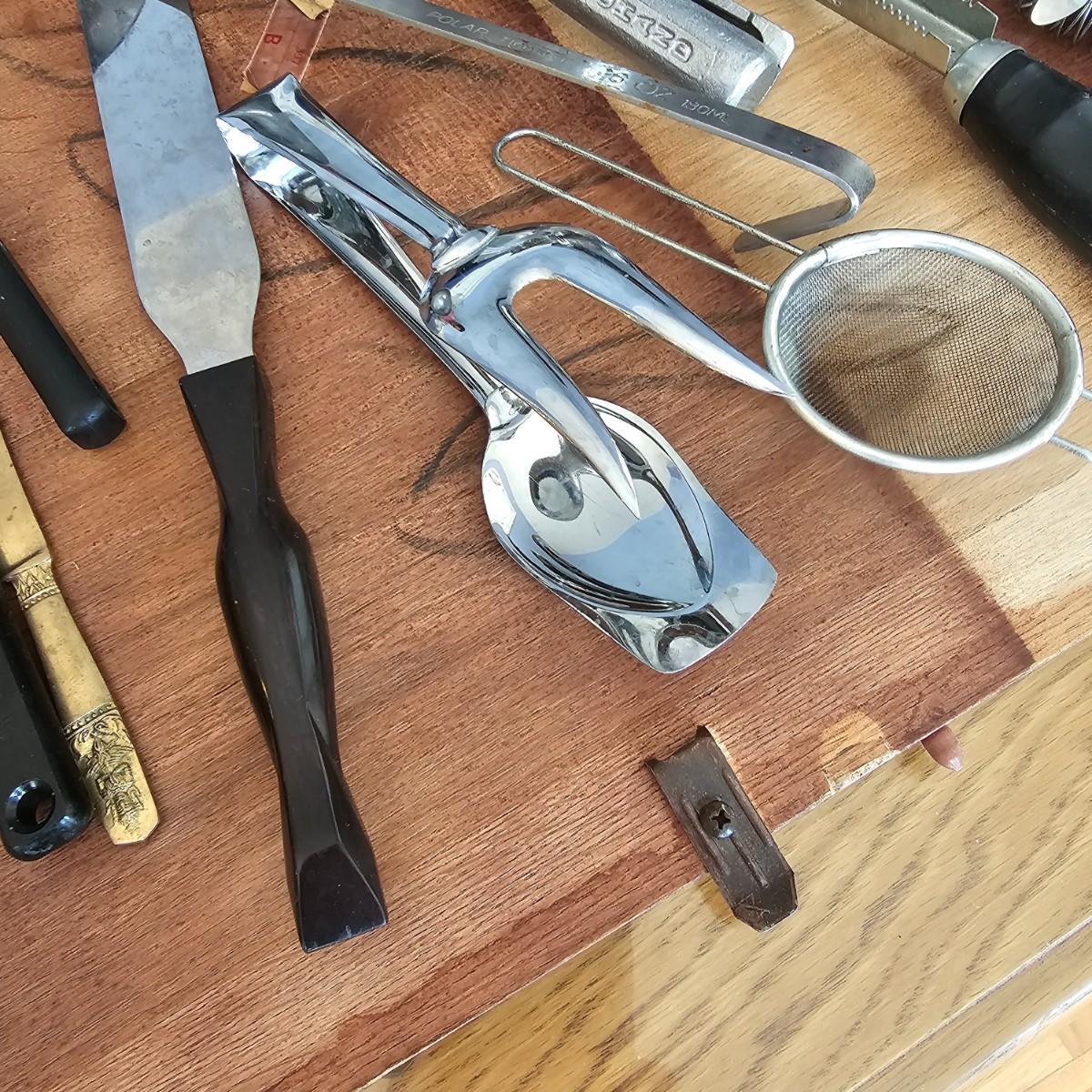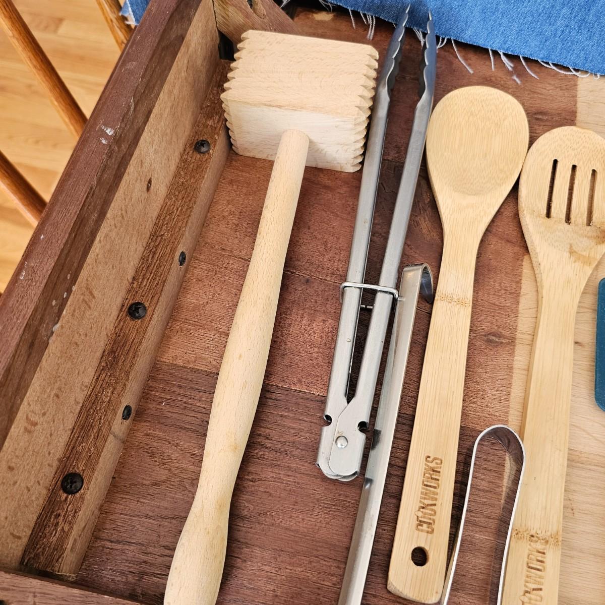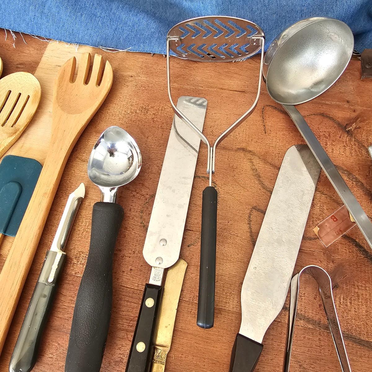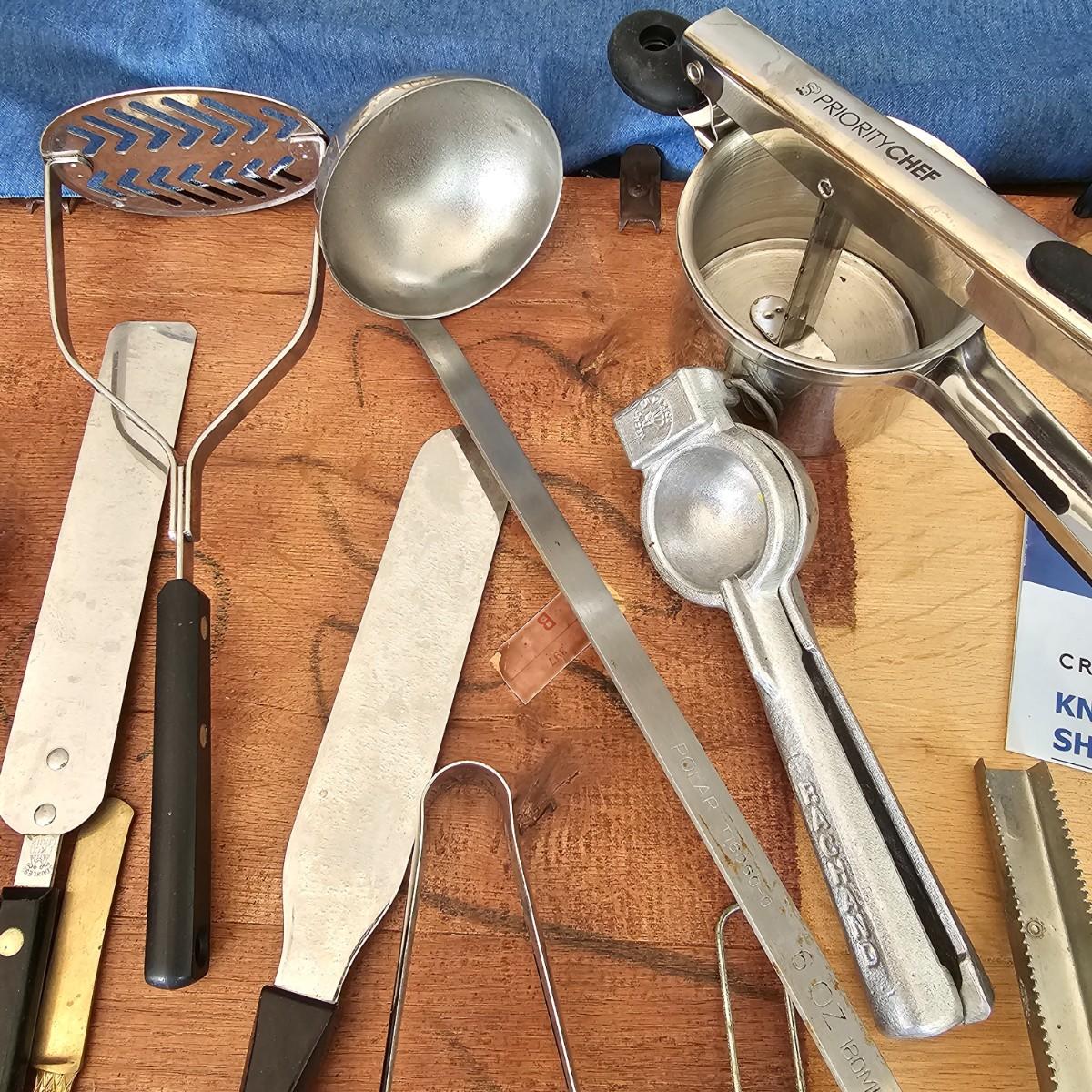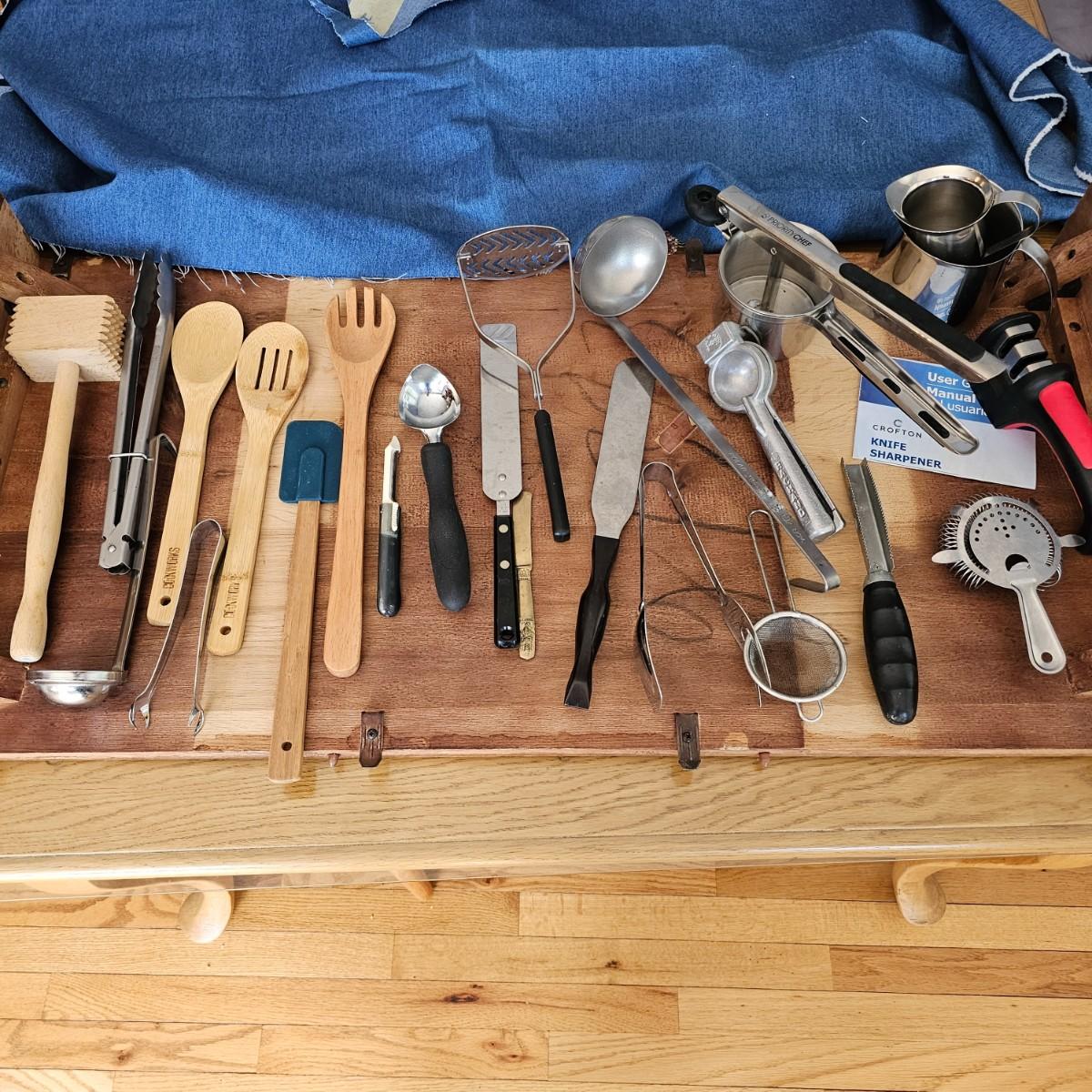 A variety of cooking utensils. Spoons, ladles, tongs, strainers, etc. Longest items are 14". See photos for details. Shipping available.