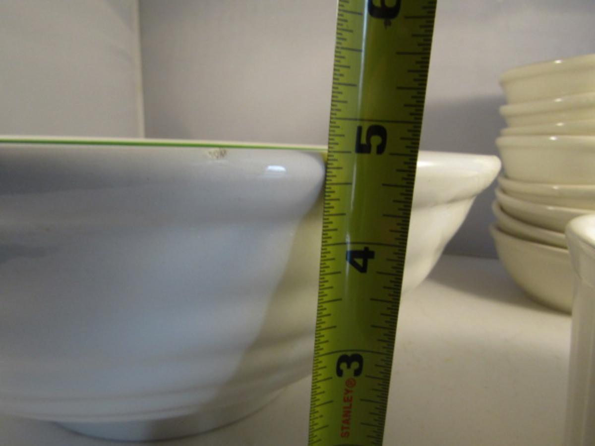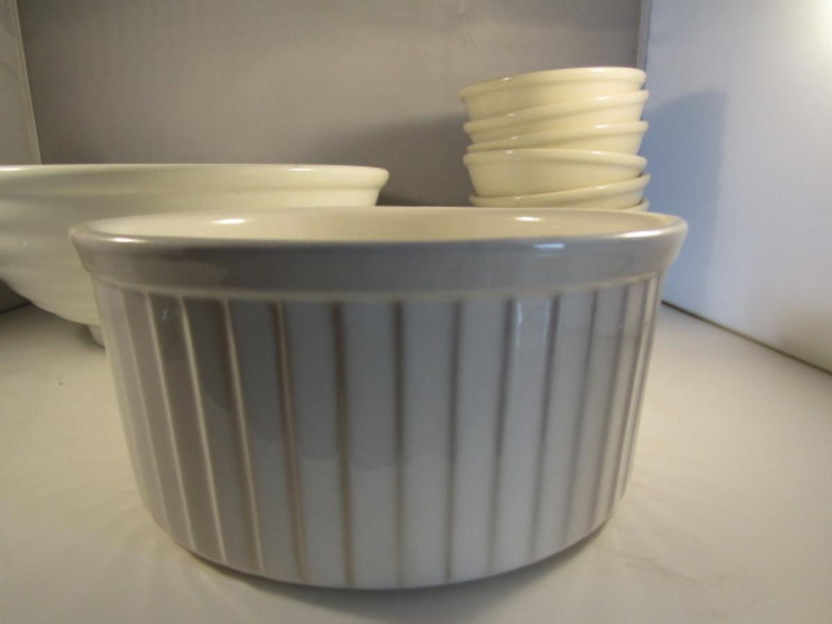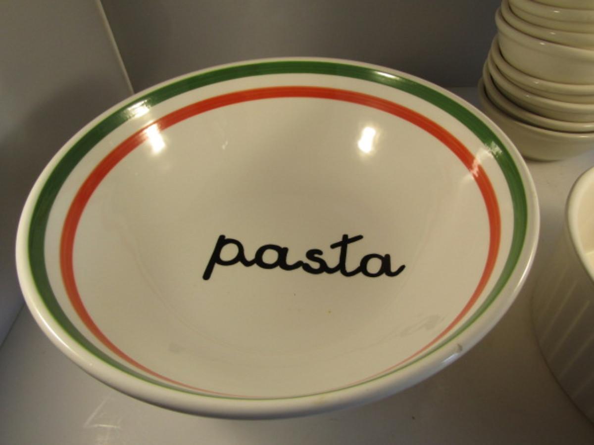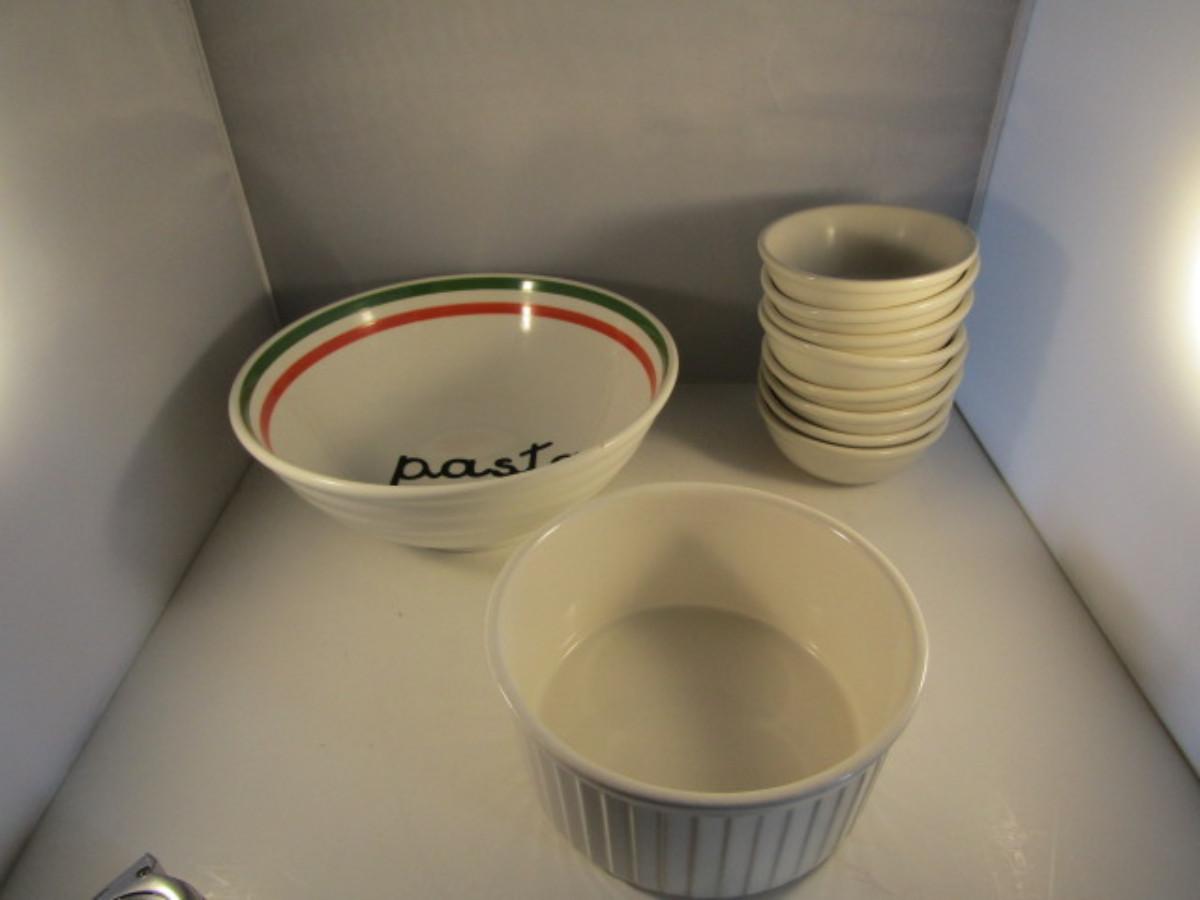 Assorted Kitchen Ware- Large Pasta Bowl, Doranne Baking Dish, Assorted Porcelain Bowls. Items are in used condition and may have occasional chip or crack.