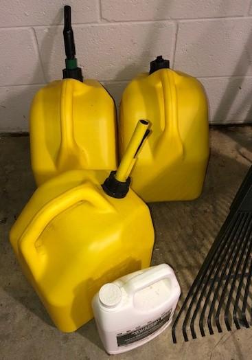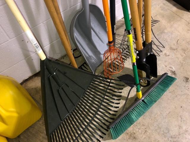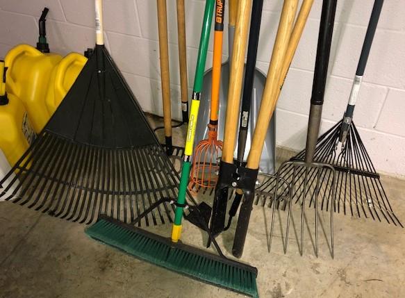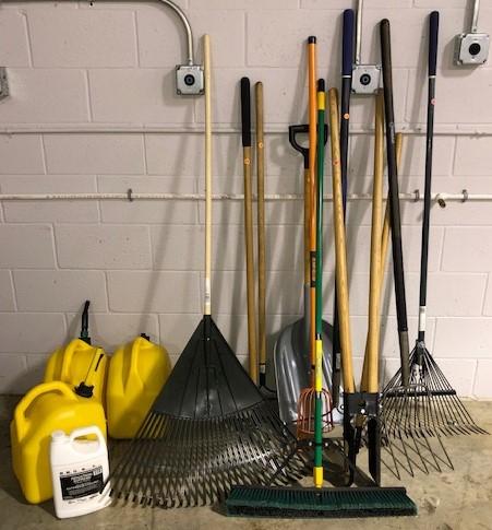 Lot includes rakes, broom, shovel, post hole, diesel (5 gallon) tanks