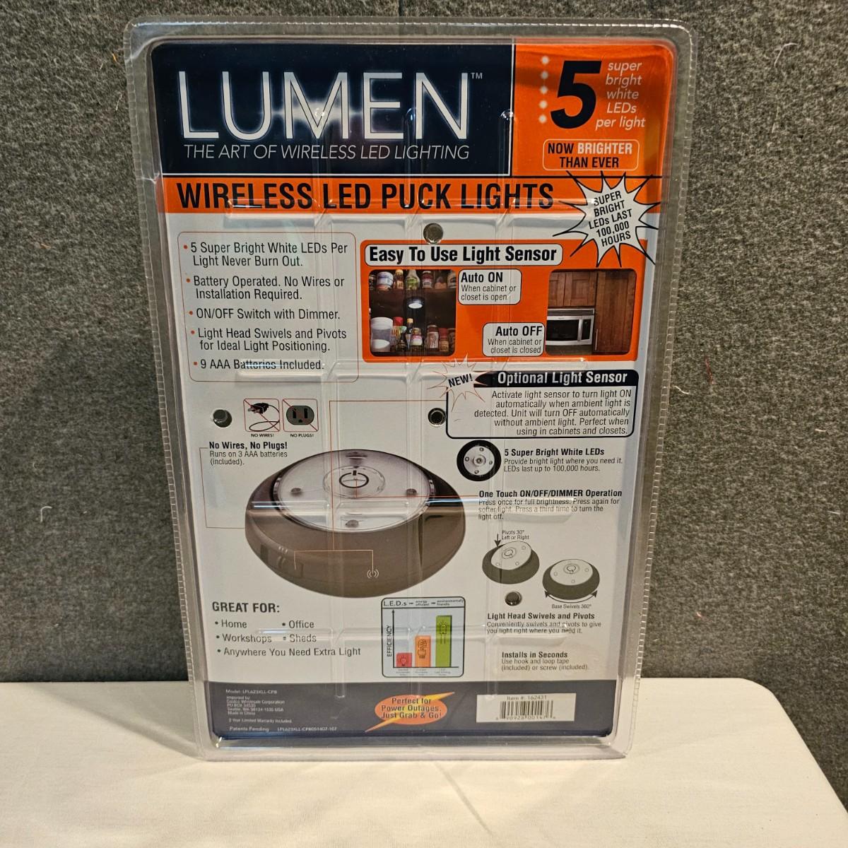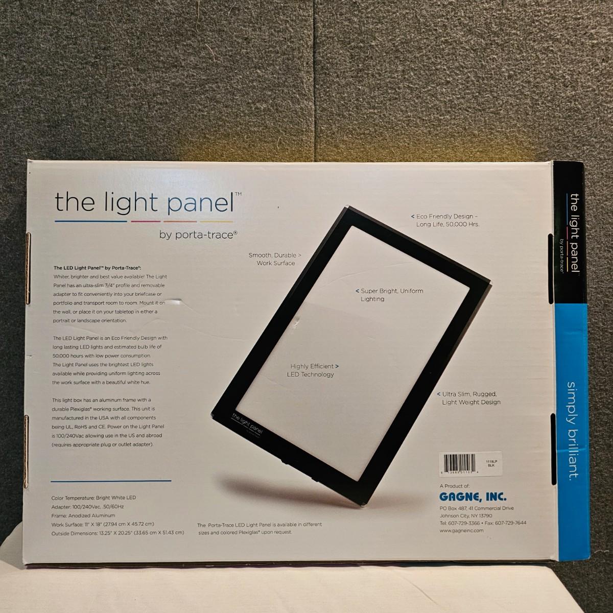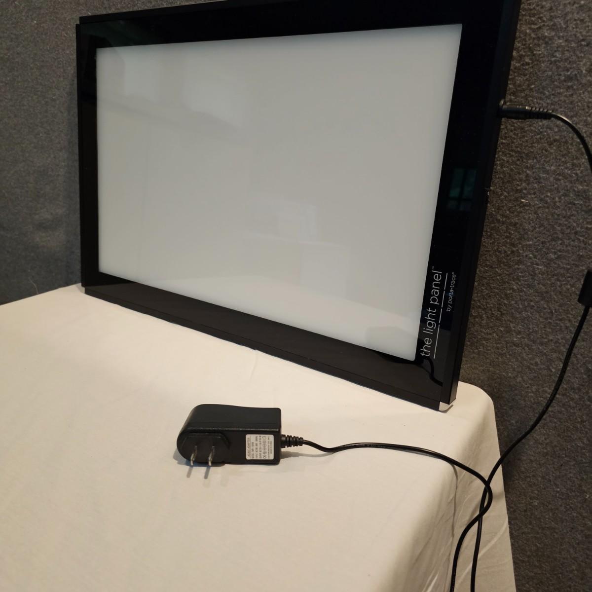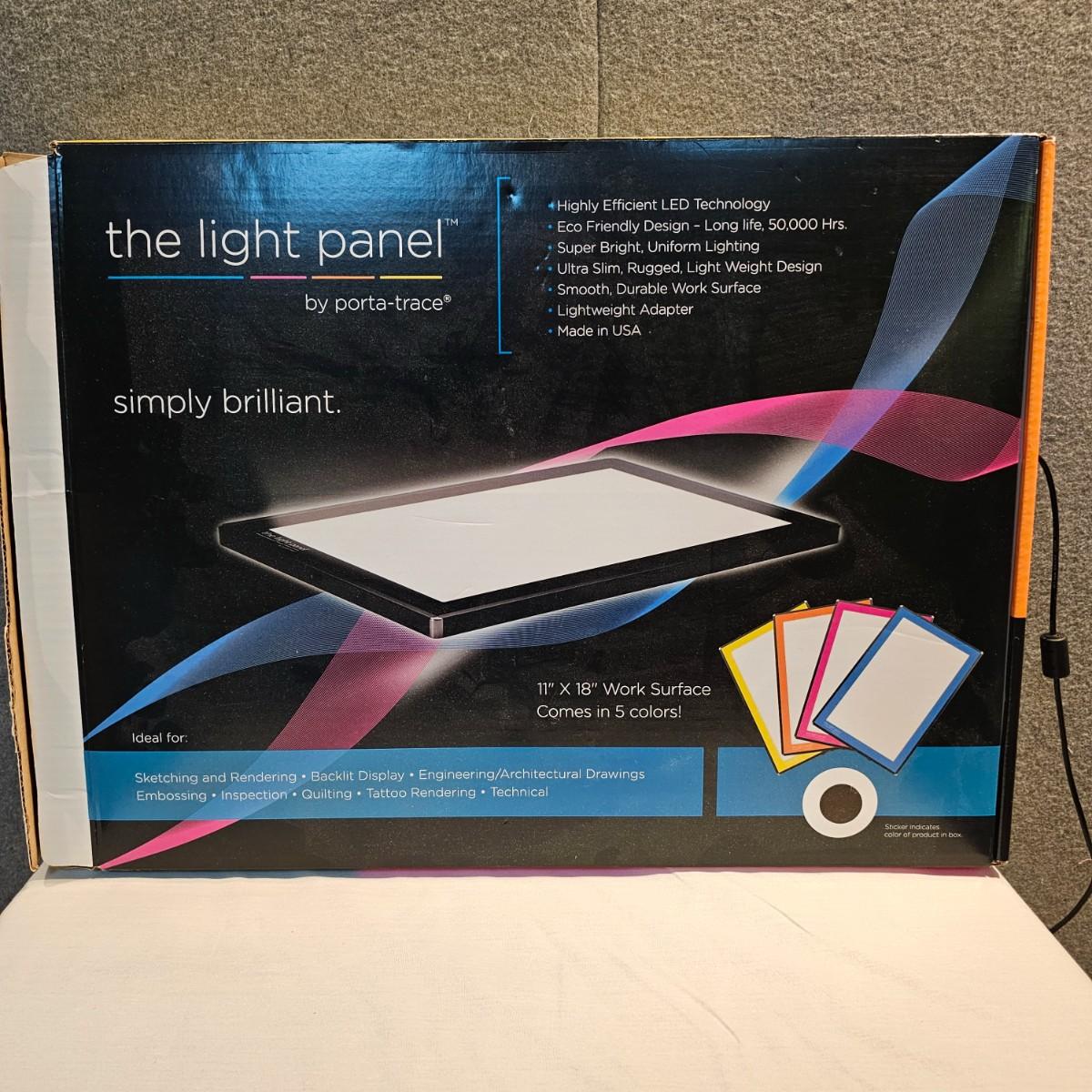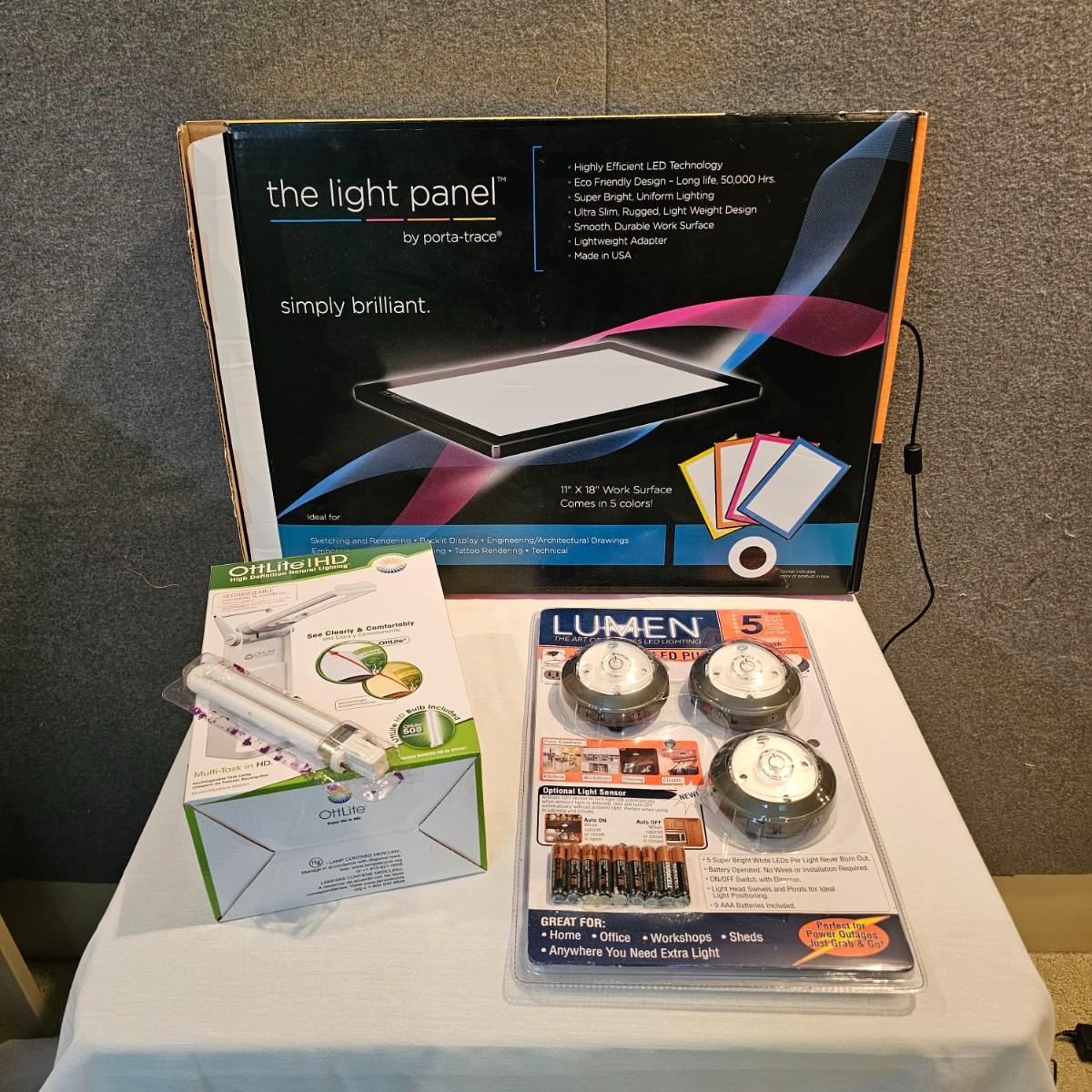 Three different styles of lighting for crafts or other. One Light Panel illuminated piece for tracing, drawing, embossing, quilting, etc. Unit is 21" x 1" x 14"H, has 11" x 18" work surface. Also included is a portable/rechargeable OttLite with adjustable head and extra bulb. Appears to be NIB. And a package of three LED wireless light pucks, also NIB, with batteries included. Two other items powered on when plugged in. See photos for details. Shipping available.