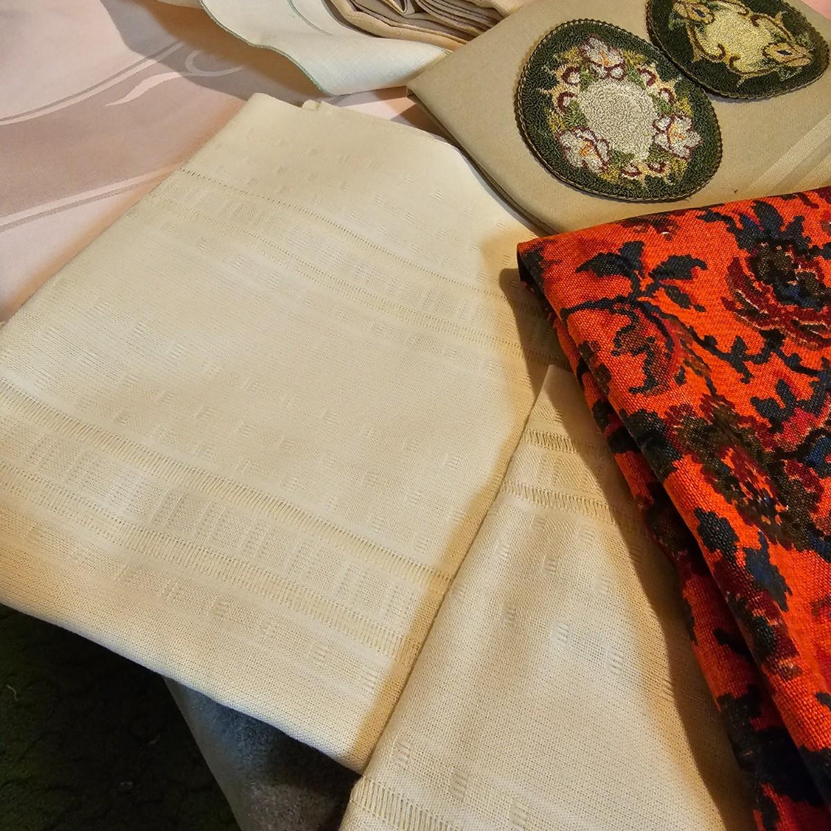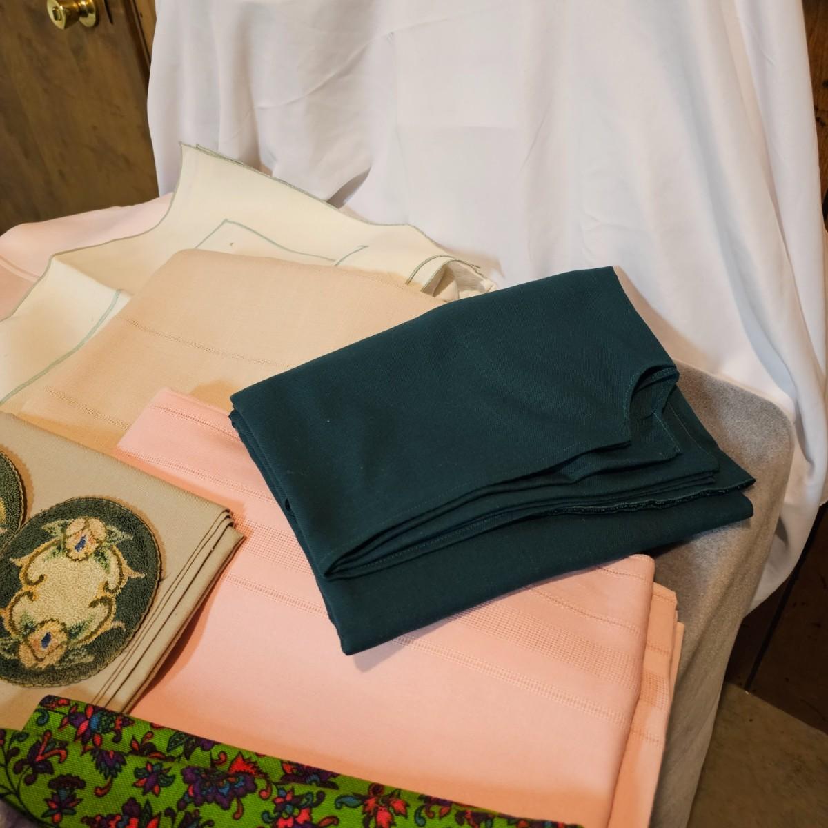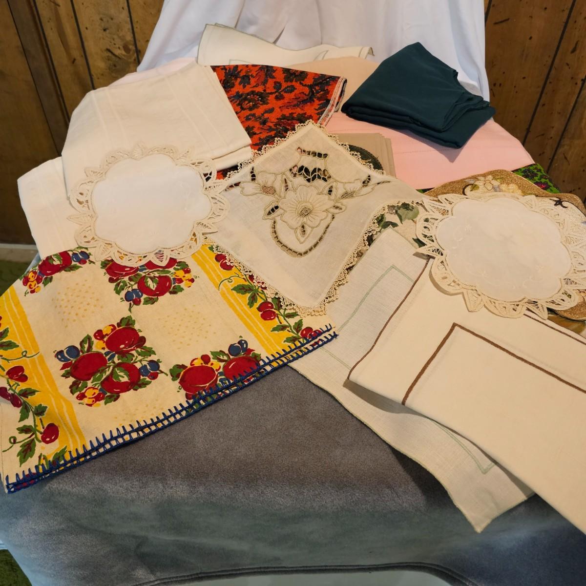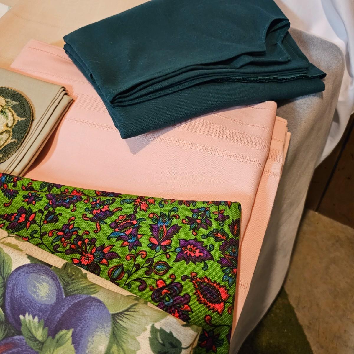 More than a dozen pieces of linens and tablecloths. Blue, white, tan, green, floral, etc. Some smaller runner pieces and placemats. Many items are linen, others cotton or synthetic. Varying sizes from 9" x 13", 48" x 52", 80" x 82" and 60" x 120". See photos for details. Lot does not include the white background linen and items shown on the floor with iron are not included in this lot, they are offered in another lot. Shipping available.