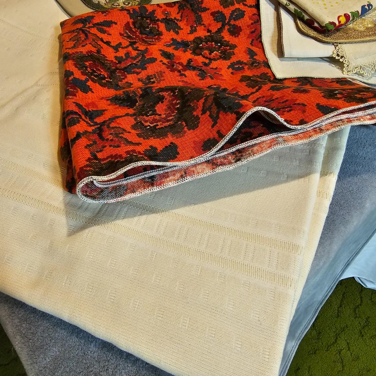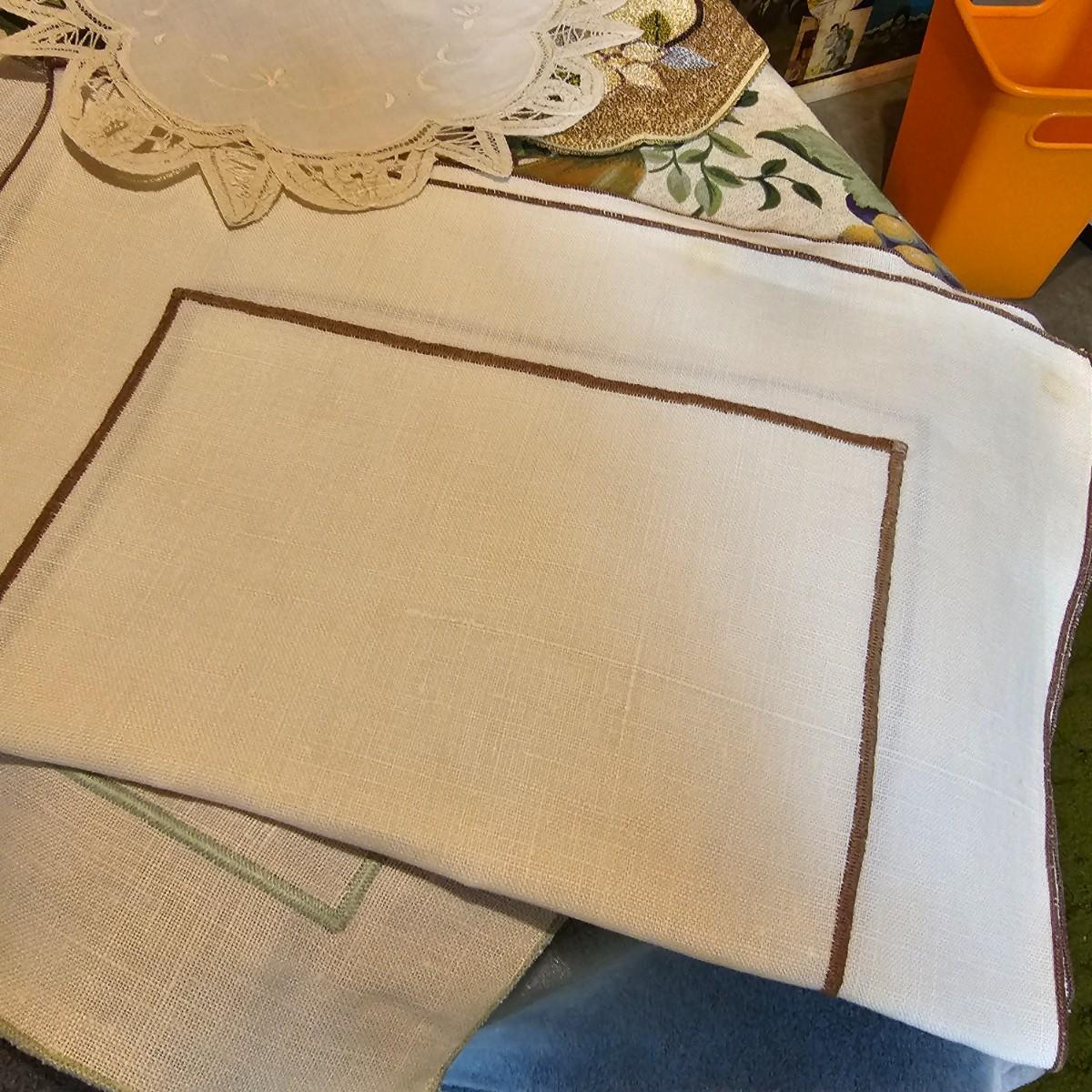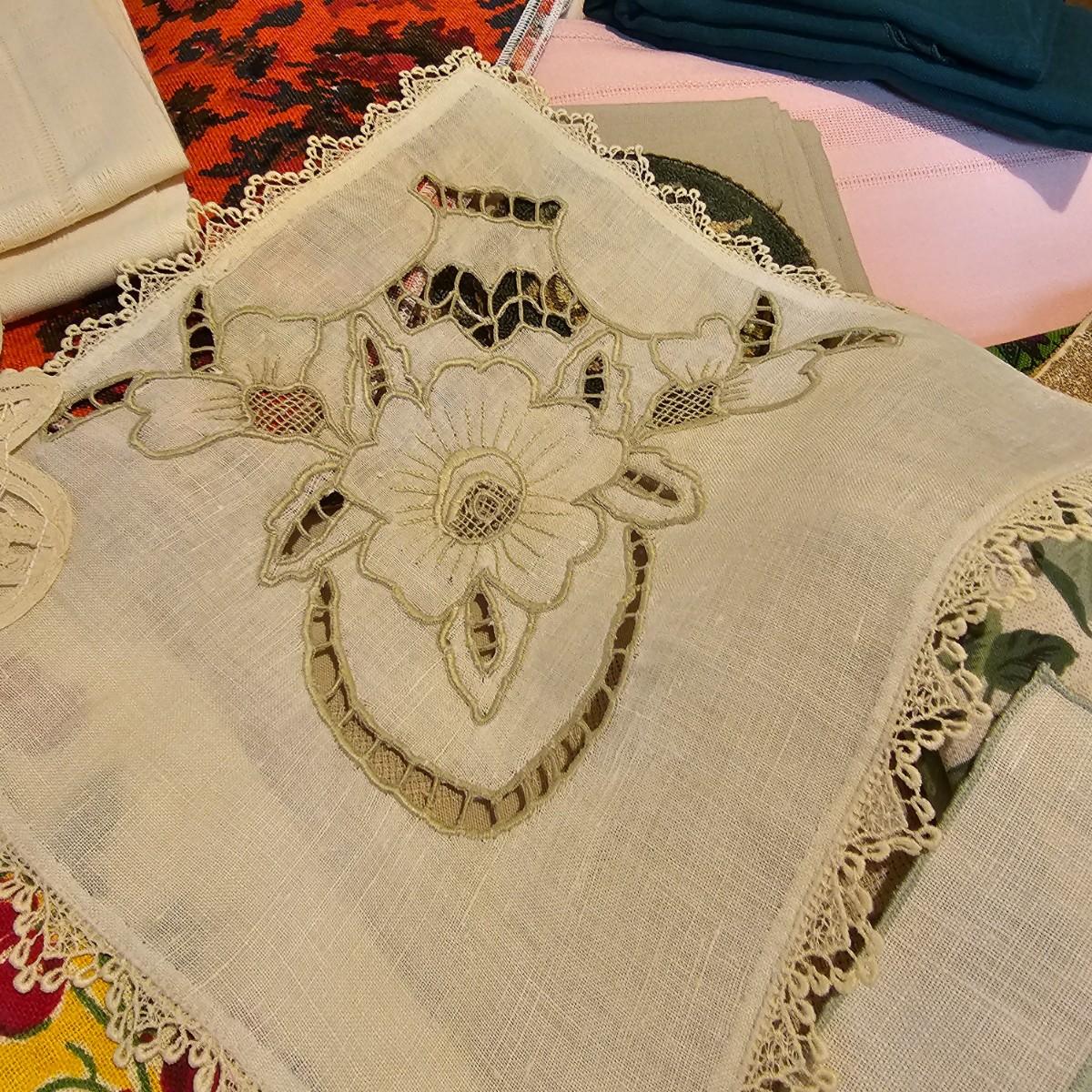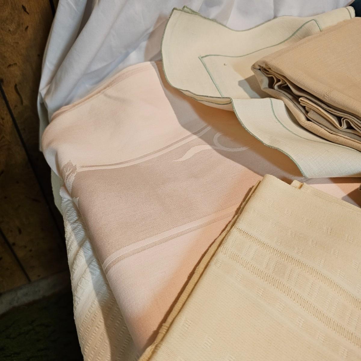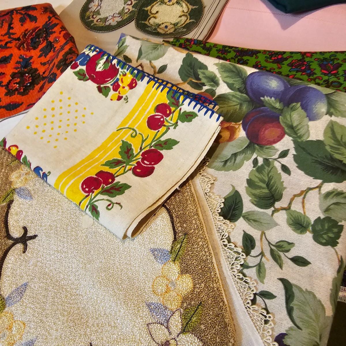 More than a dozen pieces of linens and tablecloths. Blue, white, tan, green, floral, etc. Some smaller runner pieces and placemats. Many items are linen, others cotton or synthetic. Varying sizes from 9" x 13", 48" x 52", 80" x 82" and 60" x 120". See photos for details. Lot does not include the white background linen and items shown on the floor with iron are not included in this lot, they are offered in another lot. Shipping available.
