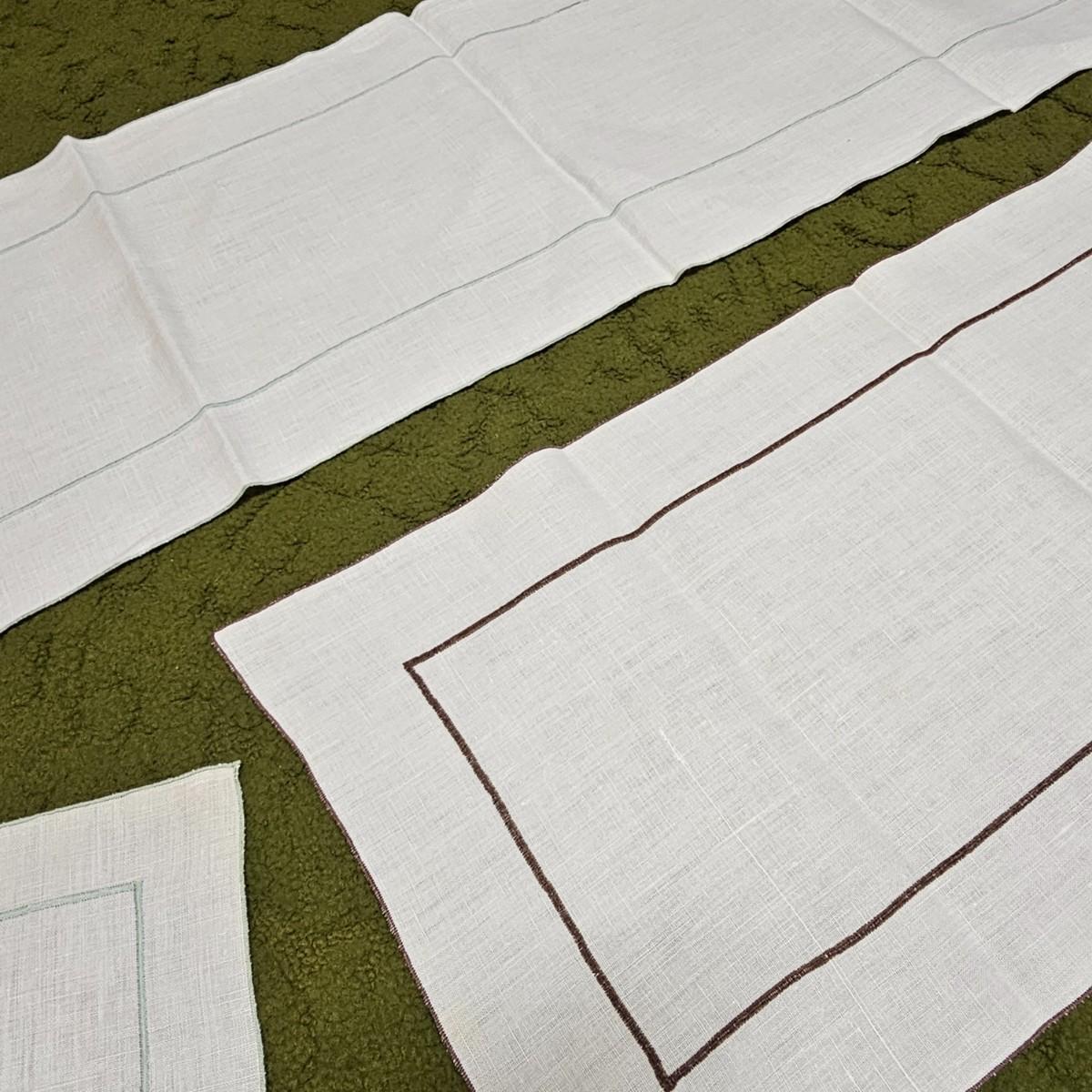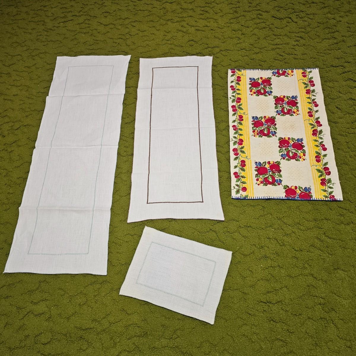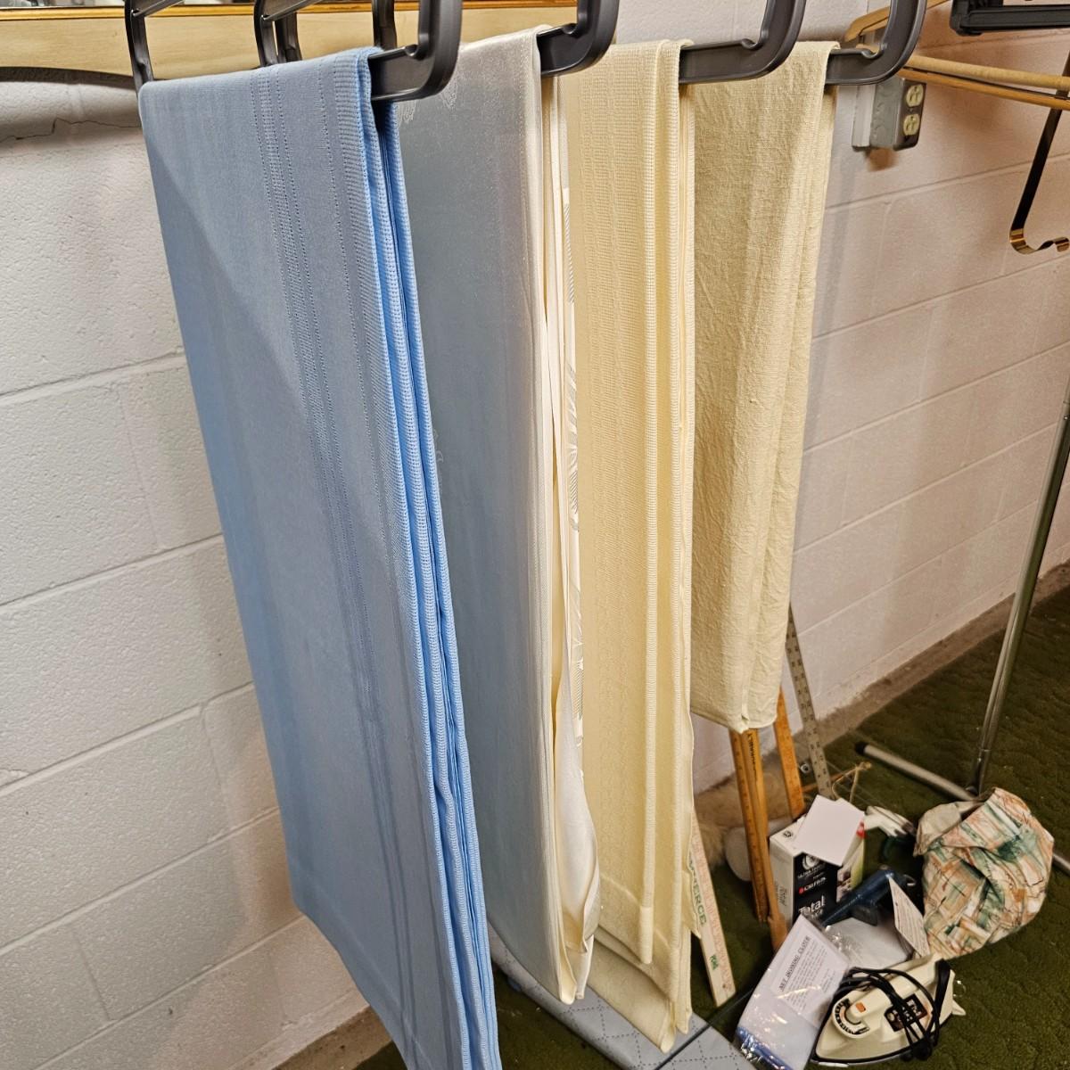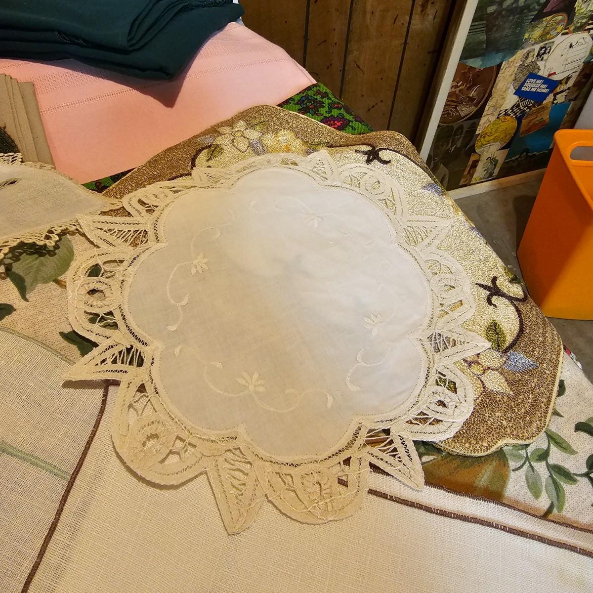 More than a dozen pieces of linens and tablecloths. Blue, white, tan, green, floral, etc. Some smaller runner pieces and placemats. Many items are linen, others cotton or synthetic. Varying sizes from 9" x 13", 48" x 52", 80" x 82" and 60" x 120". See photos for details. Lot does not include the white background linen and items shown on the floor with iron are not included in this lot, they are offered in another lot. Shipping available.