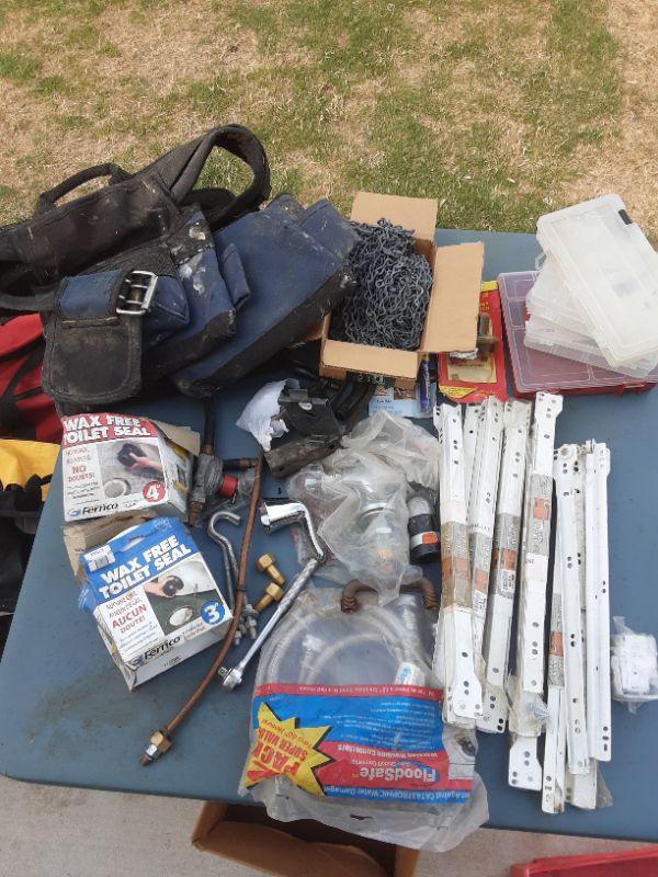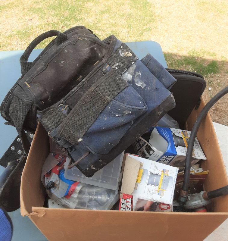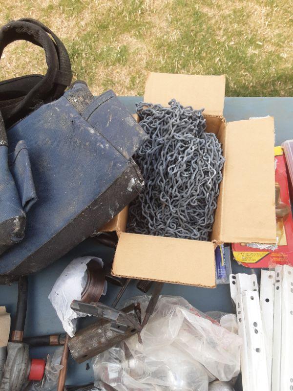 Box of Workbelt, chains, drawer slides, parts storage bins, battery cut-off switch, parts, etc. as shown